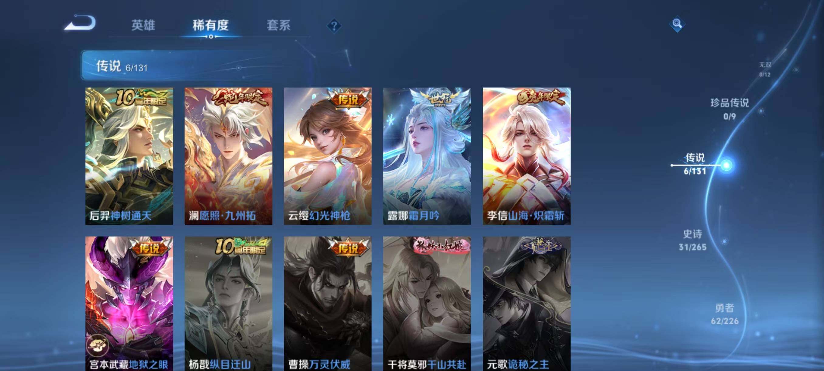 【传说皮肤】:后羿神树通天,澜愿照九州拓,云缨幻光神枪,露娜霜月吟,李信山海炽霜斩,宫本武藏地狱之眼