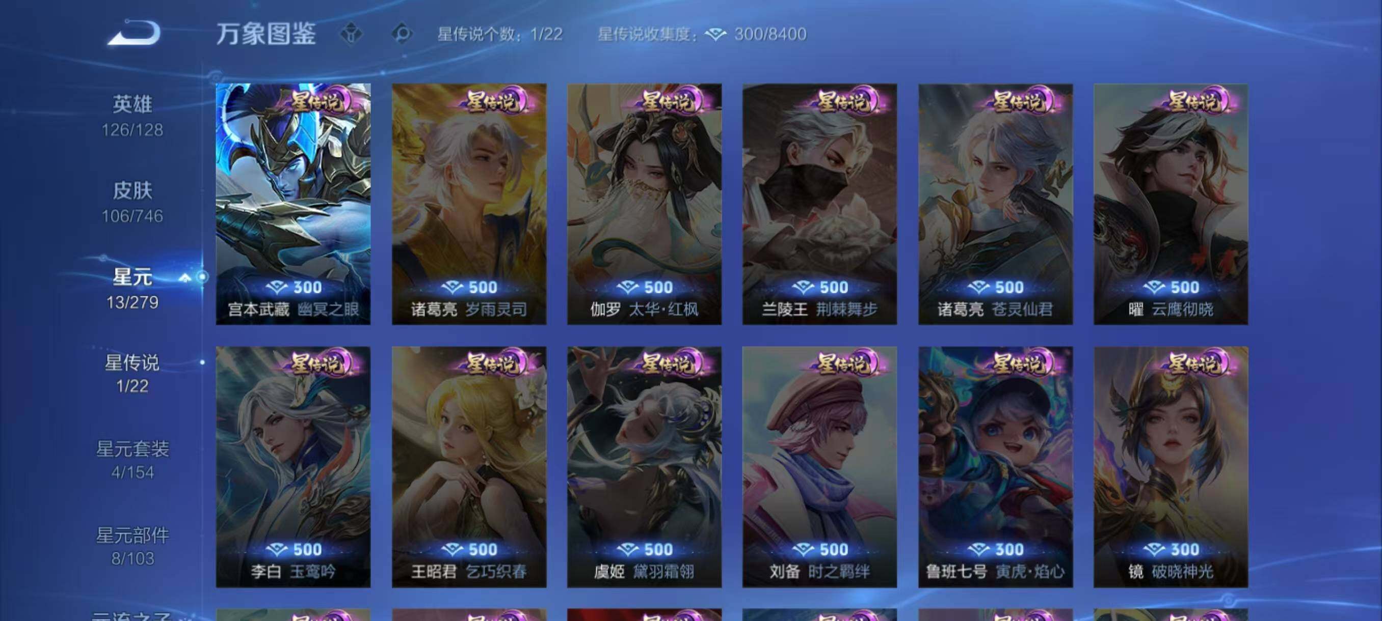 【赛季限定】:达摩沙漠行僧,张良古海寻踪,李元芳云中旅人,沈梦溪大漠名商,裴擒虎擒涛扼浪,鲁班大师探海日志,桑启海盐诗旅,鬼谷子天穹祈灯,刘邦剑破天穹,姜子牙天穹之誓