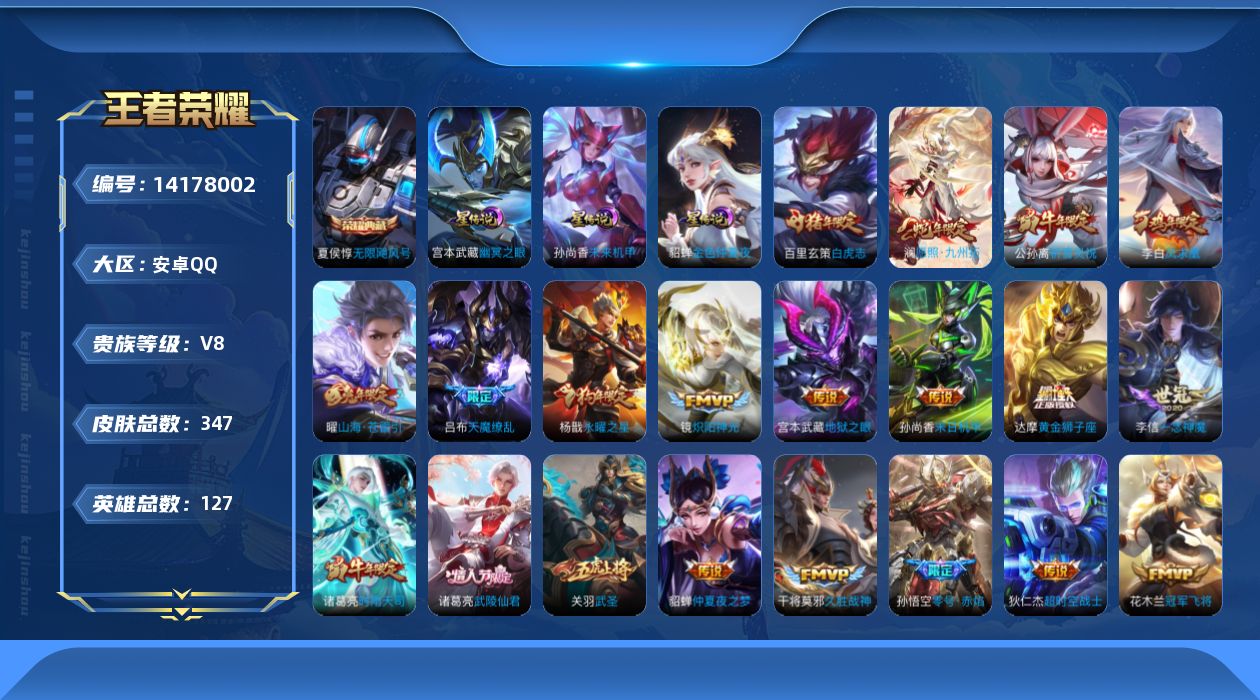 - [11523120]V8 2典藏 16传说 123英雄 333皮肤 可修改实名 优质装备:全息碎影(猴子典藏),神鉴启示录,黄金射手座,冠军飞将,猫影幻舞,云霓雀翎,末日机甲-孙尚香(绿蚂蚱),地狱火,仲夏夜之梦(大飞蛾),地狱之眼,超时空战士-狄仁杰 传说皮:死亡执政官,幻光神枪 珍宝阁皮:妄想食味,玩趣恶龙 限定皮:愿照·九州拓(澜年限),鸣野蒿,至尊宝,白虎志(电光耗子),凤求凰(白切鸡),飞衡(韩信年限),遇见飞天,高山流水,五谷丰年,游园惊梦,梁祝,天狼狩猎者,天狼绘梦者,李小龙,朱雀志(守约年限),辉光之辰,一生所爱,大圣娶亲,引擎之心,神奇女侠 史诗皮:化蝶舞,星界战将,龙之律动,百相守梦-周瑜,茶境仙,破空之剑,蒙犽顽岩魄,蔬乡物语(鲁班七号),百相守梦-黄忠,紫霞仙子,苍穹之光,电玩小子(小书包),白龙吟,黄金分割率,特工魅影,千年之狐,江河有灵,百解令(蒙犽),高渐离燃音魔法,蒙恬荣光圣徽,无限星赏官,冰冠公主,偶像歌手,白蛇,末日机甲-吕布,猫狗日记-孙策,猫狗日记-大乔,乱世虎臣,节奏热浪,女仆咖啡,摇滚巨星,水果甜心,绅士熊喵,天才门将,星夜王子,心灵骇客,功夫厨神,德古拉伯爵,暗隐猎兽者,幽灵船长,鬼剑武藏,心灵战警,舞动绿茵,地狱岩魂,纤云弄巧,繁星吟游(呼啦呼啦),拒霜思,缤纷独角兽,乘风破浪,逐浪之夏,水晶猎龙者,曙光守护者,箭羽风息,金属风暴,原初追逐者,圣诞狂欢,圣诞恋歌,鹰眼统帅,暗夜贵公子,魅力维加斯,无心,未来纪元-赵云