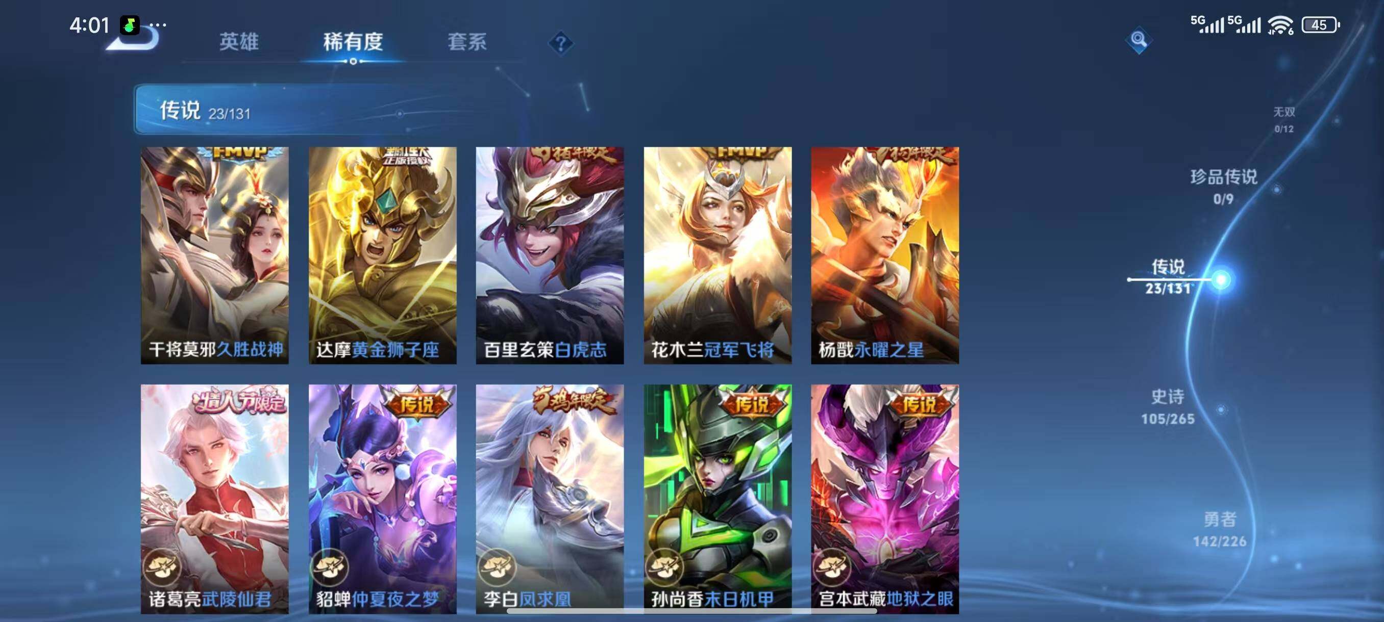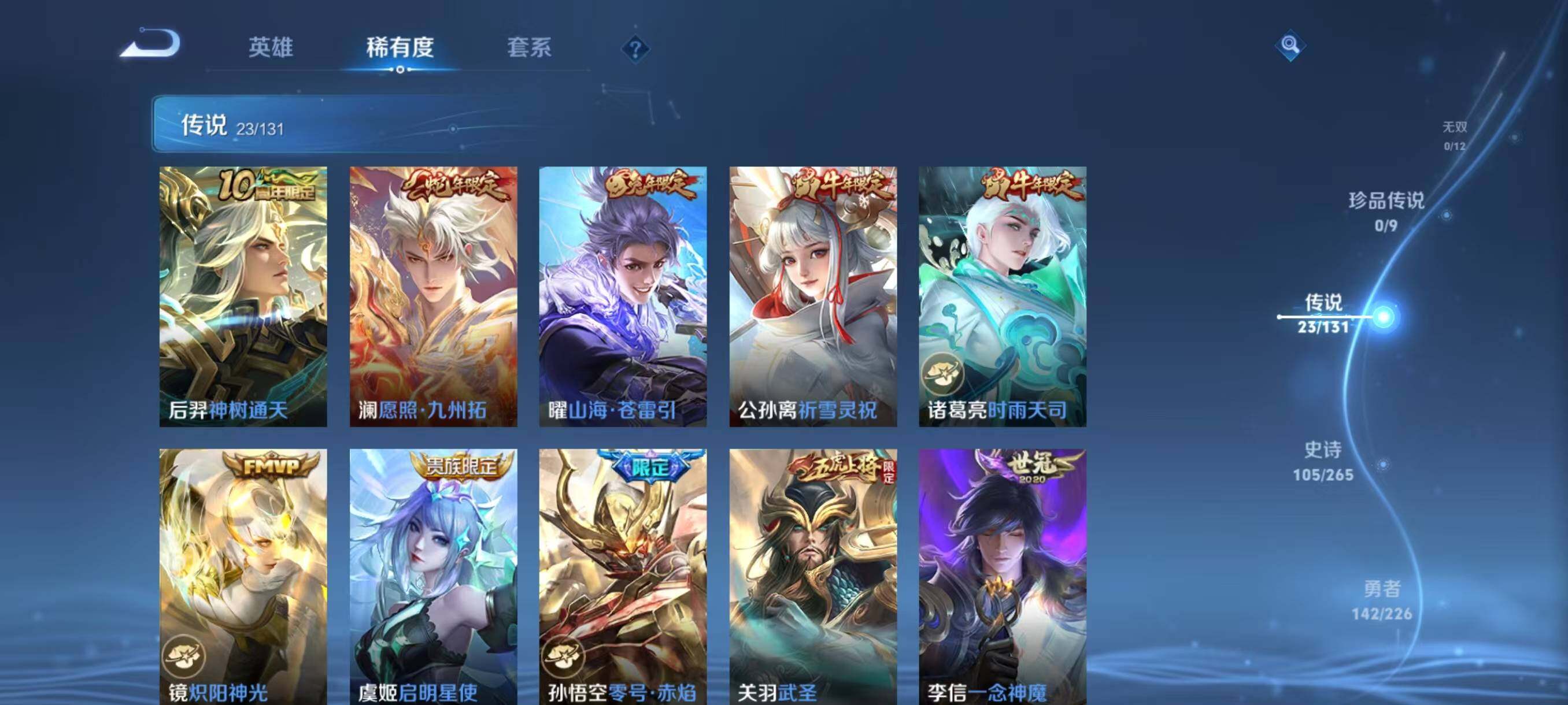 【传说皮肤】:后羿神树通天,澜愿照九州拓,曜山海苍雷引,公孙离祈雪灵祝,诸葛亮时雨天司,镜炽阳神光,虞姬启明星使,孙悟空零号赤焰,关羽武圣,李信一念神魔,干将莫邪久胜战神,达摩黄金狮子座,百里玄策白虎志,花木兰冠军飞将,杨戬永曜之星,诸葛亮武陵仙君,貂蝉仲夏夜之梦,李白凤求凰,孙尚香末日机甲,宫本武藏地狱之眼,孙悟空地狱火,吕布天魔缭乱,狄仁杰超时空战士
