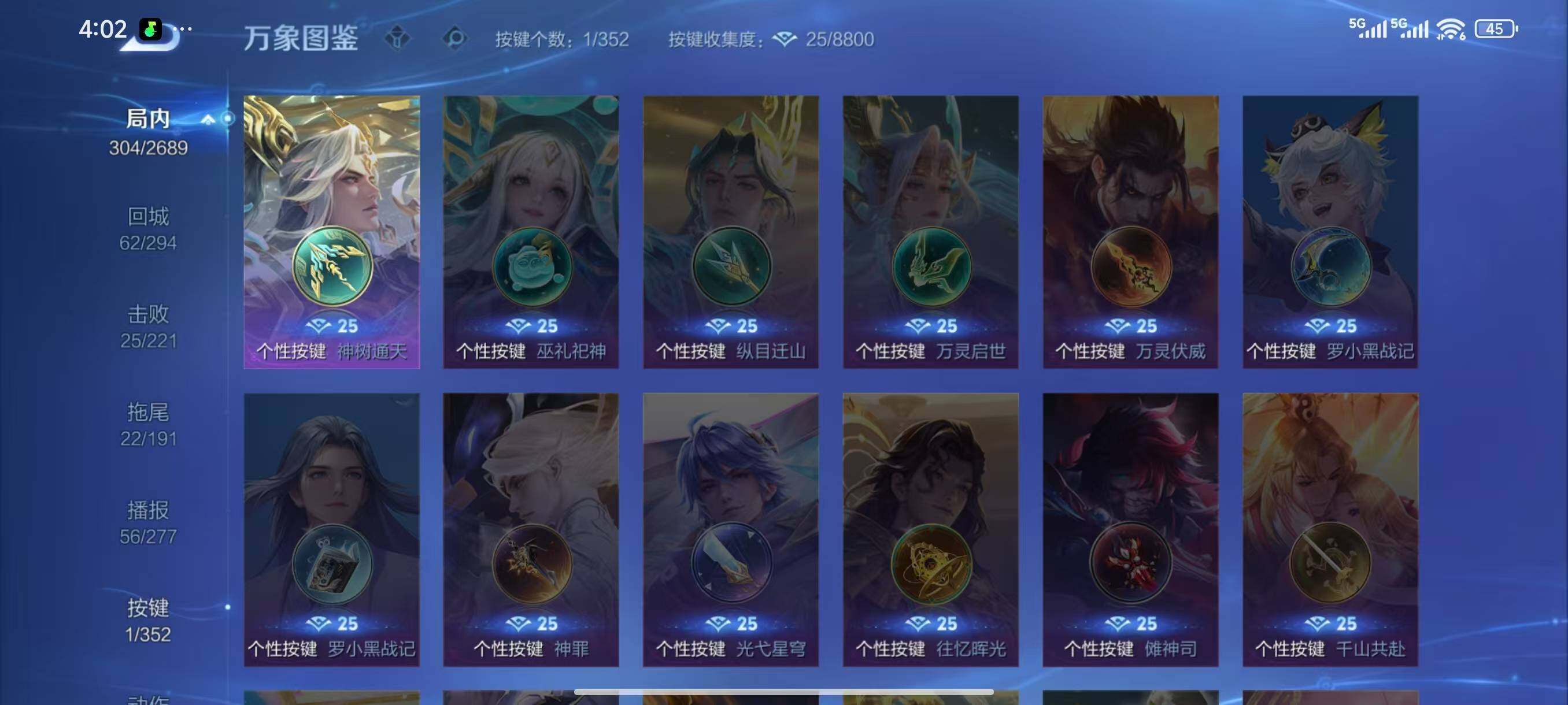 亚瑟狮心王,庄周蜃楼王,孙膑妖精王,扁鹊炼金王,虞姬凯尔特女王,白起狰,太乙真人饕餮,曹操烛龙,芈月重明,典韦穷奇,狂铁御狮,米莱狄御霄,牛魔御旌,盾山御銮,夏侯惇朔风刀,明世隐疑决卦,老夫子醍醐杖,鬼谷子原初探秘者,狄仁杰万华元夜,程咬金演武夺筹,钟馗驱傩正仪,苏烈千军破阵,吕布猎兽之王,嬴政白昼王子,女娲朔望之晖,典韦蓝屏警告,钟馗神迹守卫,鲁班七号狮舞东方,沈梦溪星空之诺,李元芳银河之约,马可波罗暗影游猎,蒙犽狂想玩偶喵,元歌云间偶戏,弈星混沌棋,达摩沙漠行僧,兰陵王金庭之子,沈梦溪大漠名商,李元芳云中旅人,桑启海盐诗旅,裴擒虎擒涛扼浪,鲁班大师探海日志,张良古海寻踪