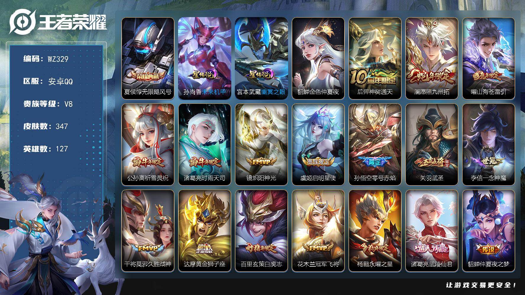 - [15147185]【店主推荐捡漏号!可直接换绑】安卓Q-V6-最强王者段位-127英雄-247皮肤-1典藏皮肤-7传说-63史诗 【英雄全皮】:孙权全皮,蒙恬全皮 【荣耀典藏】:伽罗最初的交响 【传说皮肤】:后羿神树通天,桑启鸣野蒿,赵云乘龙铭钟鼎,澜逐花归海,孙悟空齐天大圣,张良黄金白羊座,干将莫邪久胜战神 【限定皮肤】:蔡文姬夏日便利店,大乔绒语心约,虞姬夏日便利店,姜子牙天穹之誓,李白谪仙醉月,狄仁杰阴阳师,赵云皇家上将,墨子神迹守卫,嬴政优雅恋人,庄周高山流水,阿轲迷踪丽影,白起夜都怪侠,吕布猎兽之王,周瑜赤莲之焰,夏侯惇朔风刀,狄仁杰魔术师,狄仁杰万华元夜,达摩沙漠行僧,项羽海滩派对,老夫子醍醐杖,老夫子航海奇遇记,程咬金演武夺筹,刘邦夺宝奇兵,韩信逐梦之影,兰陵王驯魔猎人,兰陵王金庭之子,孙悟空至尊宝,孙悟空齐天大圣,后羿圣弓游侠,刘备百相守梦,李元芳银河之约,李元芳云中旅人,钟馗驱傩正仪,女娲朔望之晖,干将莫邪胡桃夹子,干将莫邪真爱魔法,雅典娜单词大作战,蔡文姬繁星吟游,鬼谷子原初探秘者,苏烈千军破阵,百里玄策原初追逐者,弈星混沌棋,沈梦溪星空之诺,沈梦溪大漠名商,明世隐疑决卦,明世隐吟游魔法,裴擒虎李小龙,裴擒虎擒涛扼浪,云中君纤云弄巧,盾山御銮,猪八戒猪悟能,上官婉儿梁祝,蒙犽狂想玩偶喵,鲁班大师探海日志,桑启海盐诗旅,张良古海寻踪,蒙犽百解令,蒙恬荣光圣徽,高渐离燃音魔法,妲己灵卜魔法,鬼谷子天穹祈灯,伽罗琥珀纪元,姬小满妄想食味,赵云乘龙铭钟鼎,沈梦溪龙舞盛年,鲁班七号蔬乡物语,李元芳蔬乡物语,刘邦剑破天穹,程咬金群星魔术团,周瑜熔金海岸 【年限皮肤】:赵云乘龙铭钟鼎 【赛季限定】:夏侯惇朔风刀,狄仁杰万华元夜,达摩沙漠行僧,老夫子醍醐杖,程咬金演武夺筹,兰陵王金庭之子,张良古海寻踪,李元芳云中旅人,钟馗驱傩正仪,鬼谷子原初探秘者,苏烈千军破阵,百里玄策原初追逐者,弈星混沌棋,沈梦溪大漠名商,明世隐疑决卦,裴擒虎擒涛扼浪,盾山御銮,鲁班大师探海日志,桑启海盐诗旅,鬼谷子天穹祈灯,蒙恬荣光圣徽,刘邦剑破天穹,姜子牙天穹之誓 【战令限定】:墨子神迹守卫,蔡文姬夏日便利店,虞姬夏日便利店,阿轲迷踪丽影,白起夜都怪侠,吕布猎兽之王,周瑜赤莲之焰,老夫子航海奇遇记,刘邦夺宝奇兵,兰陵王驯魔猎人,后羿圣弓游侠,李元芳银河之约,女娲朔望之晖,干将莫邪真爱魔法,雅典娜单词大作