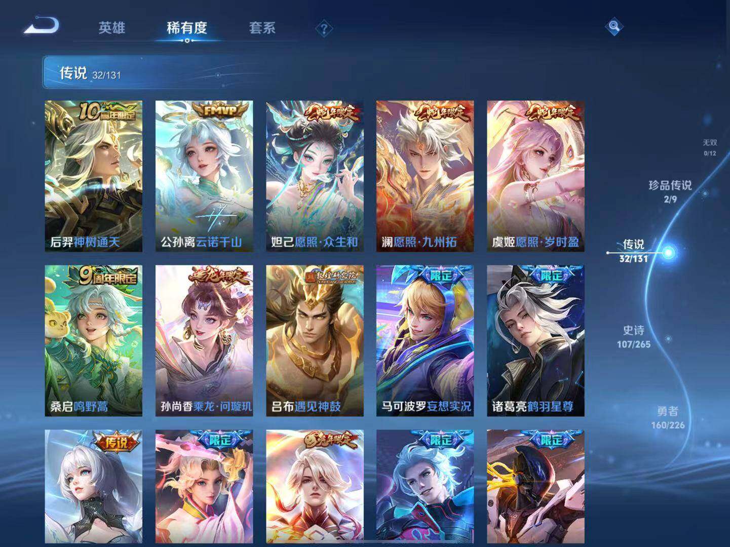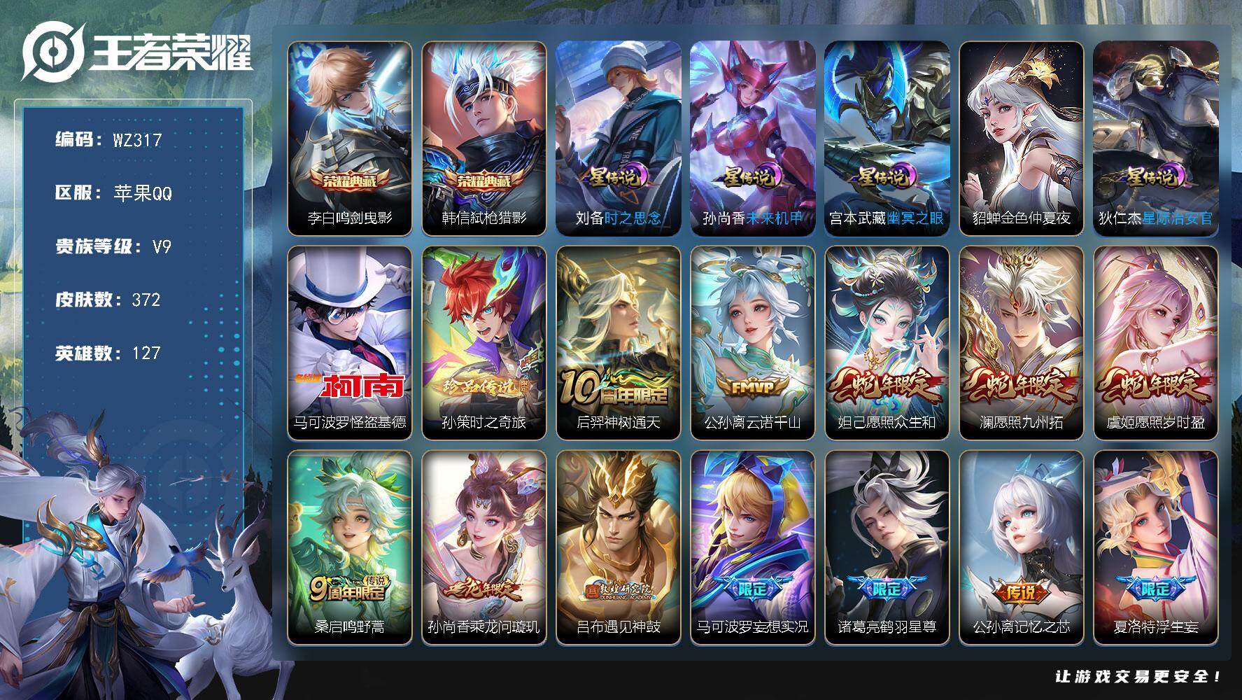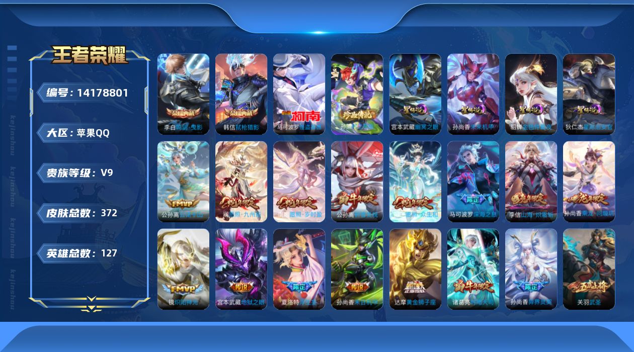 - [11875358]V8 1典藏 1珍品传说 18传说 124英雄 313皮肤 可修改实名 优质装备:弑枪猎影(韩信典藏),器灵·落星盏,黄金狮子座,炽阳神光,一念神魔,末日机甲-孙尚香(绿蚂蚱),地狱之眼,音你心动-周瑜,无双飞将,山海·炽霜斩(李信年限),山海·苍雷引(电光曜子),浮生妄,霜月吟 传说皮:落雪白狼 珍宝阁皮:妄想食味,优雅恋人,蔷薇恋人 限定皮:愿照·九州拓(澜年限),鸣野蒿,至尊宝,傲雪梅枪,时雨天司(水龙头),神威(电光马子),高山流水,怒海麟威,五谷丰年,冰锋战神,龙胆,祈雪灵祝(雪兔子),朱雀志(守约年限),青春决赛季,蜜橘之夏,唐三藏,山海·玄木吟(马可年限) 史诗皮:星界战将,龙之律动,雪豹·霜爪,茶境仙,东方月初,蒙犽顽岩魄,蔬乡物语(鲁班七号),紫霞仙子,苍穹之光,电玩小子(小书包),黄金分割率,特工魅影,永昼,匿光破解者,百相守梦(刘备),电玩·爆裂旋风,真我赫兹(镜),真我赫兹(百里守约),江河有灵,百解令(蒙犽),高渐离燃音魔法,蒙恬荣光圣徽,偶像歌手,魅语,晚萤,冰冠公主,末日机甲-吕布,猫狗日记-孙策,猫狗日记-大乔,乱世虎臣,节奏热浪,女仆咖啡,摇滚巨星,水果甜心,绅士熊喵,天才门将,星夜王子,心灵骇客,功夫厨神,德古拉伯爵,暗隐猎兽者,幽灵船长,鬼剑武藏,暗渊魔法,舞动绿茵,地狱岩魂,缤纷独角兽,乘风破浪,逐浪之夏,月团寄思,水晶猎龙者,曙光守护者,箭羽风息,金属风暴,原初追逐者,圣诞恋歌,鹰眼统帅,魅力维加斯,黎明之约,雪上飞焰,赏金猎手,奇遇舞章,无心