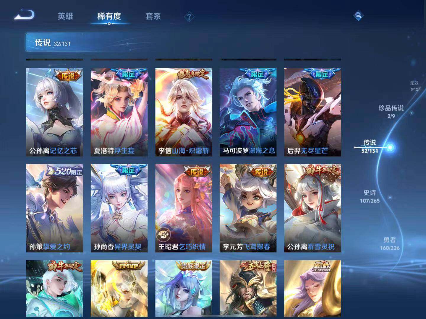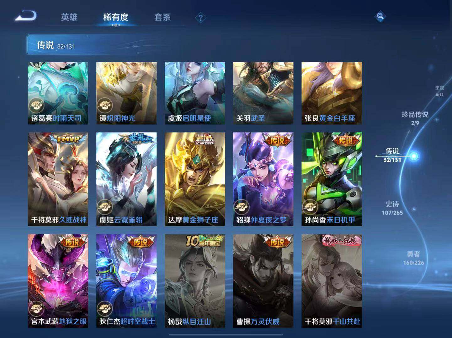 【传说皮肤】:后羿神树通天,公孙离云诺千山,妲己愿照众生和,澜愿照九州拓,虞姬愿照岁时盈,桑启鸣野蒿,孙尚香乘龙问璇玑,吕布遇见神鼓,马可波罗妄想实况,诸葛亮鹤羽星尊,公孙离记忆之芯,夏洛特浮生妄,李信山海炽霜斩,马可波罗深海之息,后羿无尽星芒,孙策挚爱之约,孙尚香异界灵契,王昭君乞巧织情,李元芳飞鸢探春,公孙离祈雪灵祝,诸葛亮时雨天司,镜炽阳神光,虞姬启明星使,关羽武圣,张良黄金白羊座,干将莫邪久胜战神,虞姬云霓雀翎,达摩黄金狮子座,貂蝉仲夏夜之梦,孙尚香末日机甲,宫本武藏地狱之眼,狄仁杰超时空战士