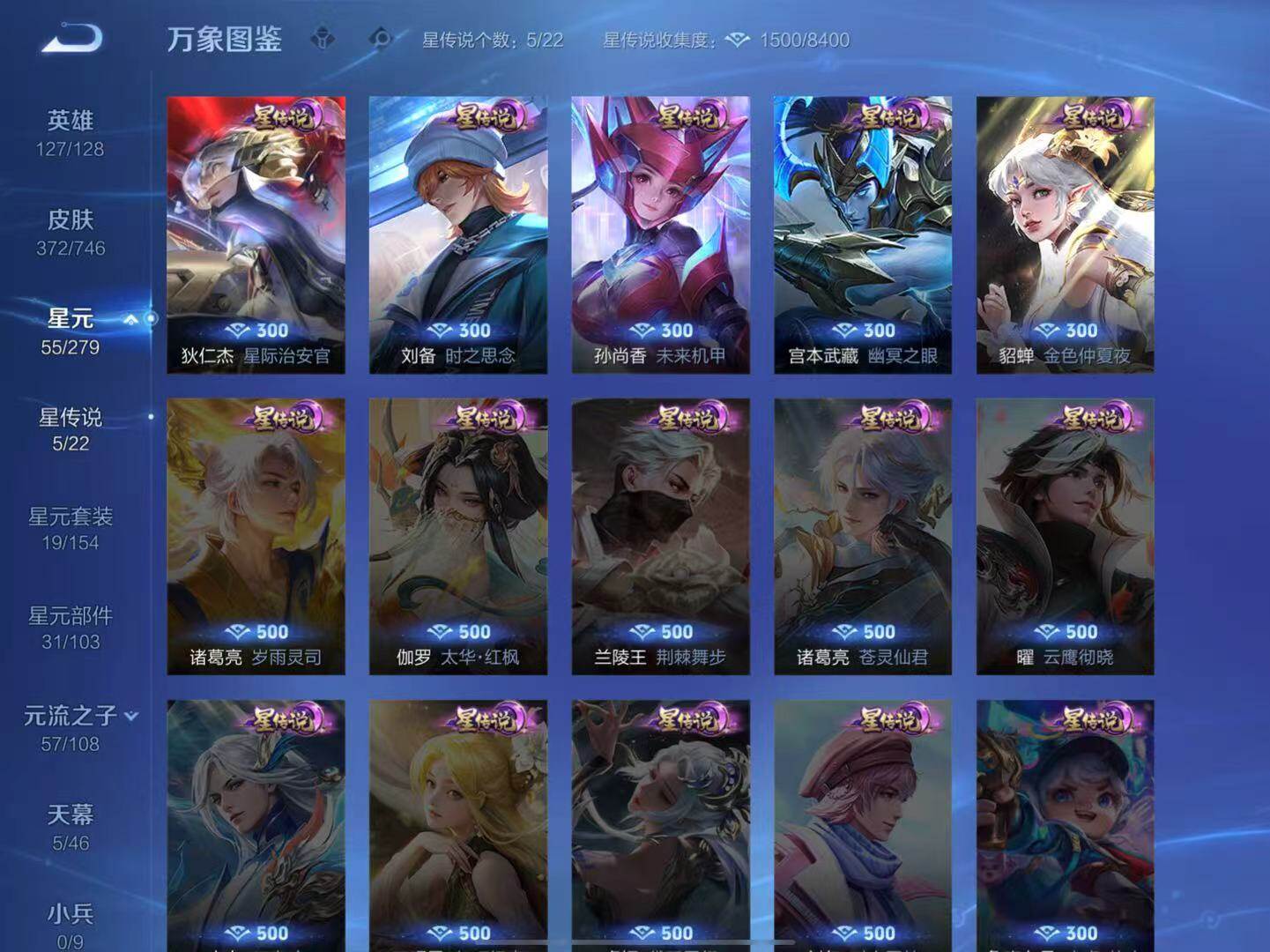 扁鹊炼金王,虞姬凯尔特女王,白起狰,太乙真人饕餮,曹操烛龙,芈月重明,典韦穷奇,狂铁御狮,米莱狄御霄,牛魔御旌,盾山御銮,夏侯惇朔风刀,明世隐疑决卦,老夫子醍醐杖,鬼谷子原初探秘者,狄仁杰万华元夜,程咬金演武夺筹,钟馗驱傩正仪,苏烈千军破阵,吕布猎兽之王,嬴政白昼王子,钟馗神迹守卫,鲁班七号狮舞东方,沈梦溪星空之诺,李元芳银河之约,马可波罗暗影游猎,蒙犽狂想玩偶喵,弈星混沌棋,达摩沙漠行僧,兰陵王金庭之子,沈梦溪大漠名商,李元芳云中旅人,桑启海盐诗旅,裴擒虎擒涛扼浪,鲁班大师探海日志,张良古海寻踪