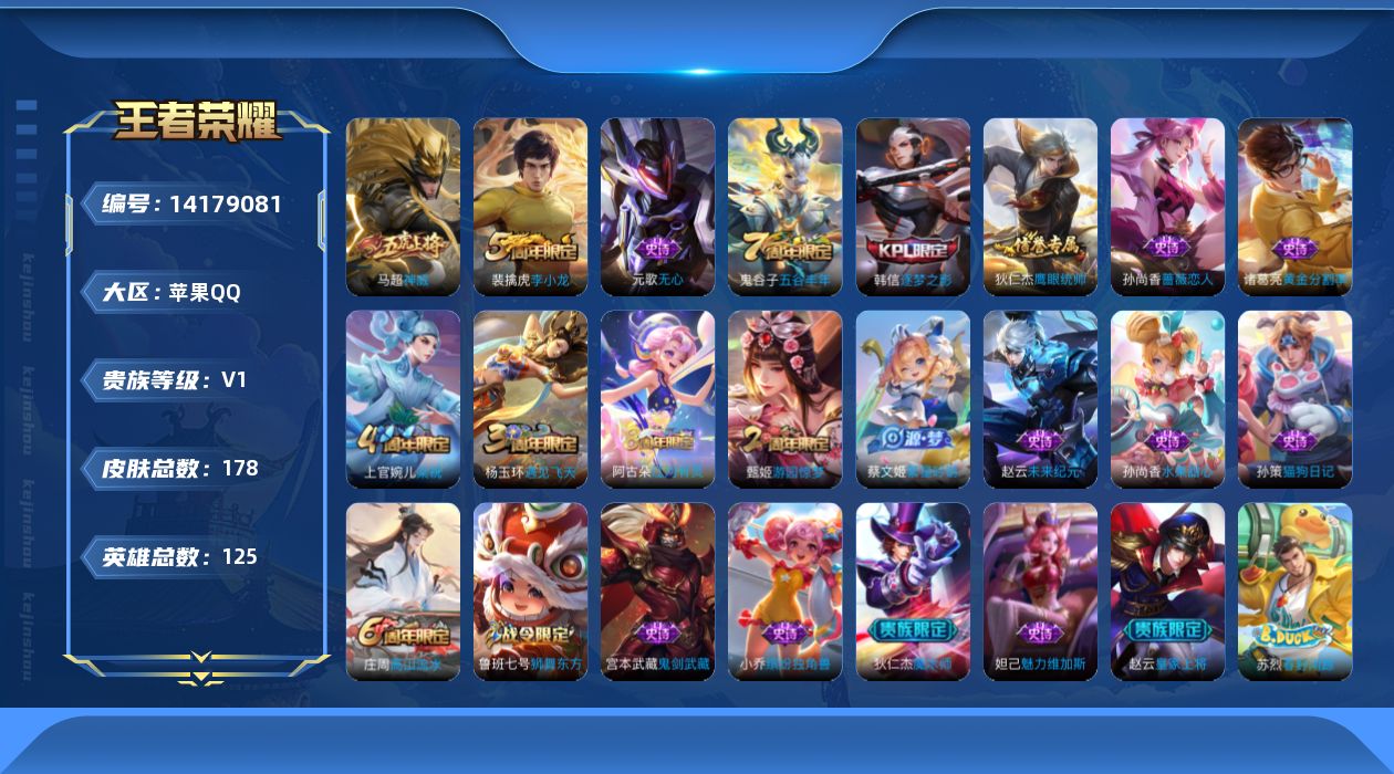 [14179081]苹果Q-178皮肤-23史诗 【限定皮肤】:白起狰,大乔绒语心约,狄仁杰阴阳师,虞姬凯尔特女王,赵云皇家上将,孙尚香蔷薇恋人,鲁班七号狮舞东方,庄周高山流水,高渐离玩趣恶龙,芈月重明,元歌无心,夏侯惇朔风刀,甄姬游园惊梦,曹操烛龙,典韦穷奇,狄仁杰魔术师,狄仁杰万华元夜,达摩沙漠行僧,项羽海滩派对,老夫子醍醐杖,程咬金演武夺筹,韩信逐梦之影,兰陵王金庭之子,牛魔御旌,李元芳云中旅人,钟馗神迹守卫,钟馗驱傩正仪,杨玉环遇见飞天,蔡文姬繁星吟游,太乙真人饕餮,鬼谷子原初探秘者,鬼谷子五谷丰年,苏烈千军破阵,弈星混沌棋,沈梦溪大漠名商,明世隐疑决卦,裴擒虎李小龙,裴擒虎擒涛扼浪,狂铁御狮,米莱狄御霄,盾山御銮,上官婉儿梁祝,鲁班大师探海日志,桑启海盐诗旅,阿古朵江河有灵,张良古海寻踪,鬼谷子天穹祈灯,刘邦剑破天穹,程咬金群星魔术团,刘备异域游侠,周瑜熔金海岸 【年限皮肤】:马超神威 【赛季限定】:白起狰,芈月重明,夏侯惇朔风刀,曹操烛龙,典韦穷奇,狄仁杰万华元夜,达摩沙漠行僧,老夫子醍醐杖,程咬金演武夺筹,兰陵王金庭之子,张良古海寻踪,牛魔御旌,李元芳云中旅人,虞姬凯尔特女王,钟馗驱傩正仪,太乙真人饕餮,鬼谷子原初探秘者,苏烈千军破阵,弈星混沌棋,沈梦溪大漠名商,明世隐疑决卦,裴擒虎擒涛扼浪,狂铁御狮,米莱狄御霄,盾山御銮,鲁班大师探海日志,桑启海盐诗旅,鬼谷子天穹祈灯,刘邦剑破天穹 【战令限定】:鲁班七号狮舞东方,钟馗神迹守卫 【史诗皮肤】:赵云皇家上将,赵云未来纪元,狄仁杰魔术师,宫本武藏鬼剑武藏,孙尚香蔷薇恋人,孙尚香水果甜心,妲己魅力维加斯,韩信逐梦之影,小乔缤纷独角兽,诸葛亮黄金分割率,甄姬游园惊梦,杨玉环遇见飞天,孙策猫狗日记,鲁班七号狮舞东方,狄仁杰鹰眼统帅,上官婉儿梁祝,蔡文姬繁星吟游,马超神威,裴擒虎李小龙,庄周高山流水,鬼谷子五谷丰年,元歌无心,阿古朵江河有灵 【其他皮肤】:项羽海滩派对,韩信教廷特使,韩信街头霸王,露娜哥特玫瑰,阿轲致命风华,阿轲爱心护理,达摩大发明家,赵云白执事,芈月红桃皇后,白起白色死神,牛魔西部大镖客,扁鹊化身博士,安琪拉玩偶对对碰,孙膑天使之翼,妲己少女阿狸,典韦黄金武士,亚瑟死亡骑士,花木兰兔女郎,张飞五福同心,刘备万事如意,宫本武藏万象初新,狄仁杰阴阳师,刘备纽约教父,刘备汉昭烈帝,关羽龙腾万里,虞姬凯尔特女王,白起狰,
