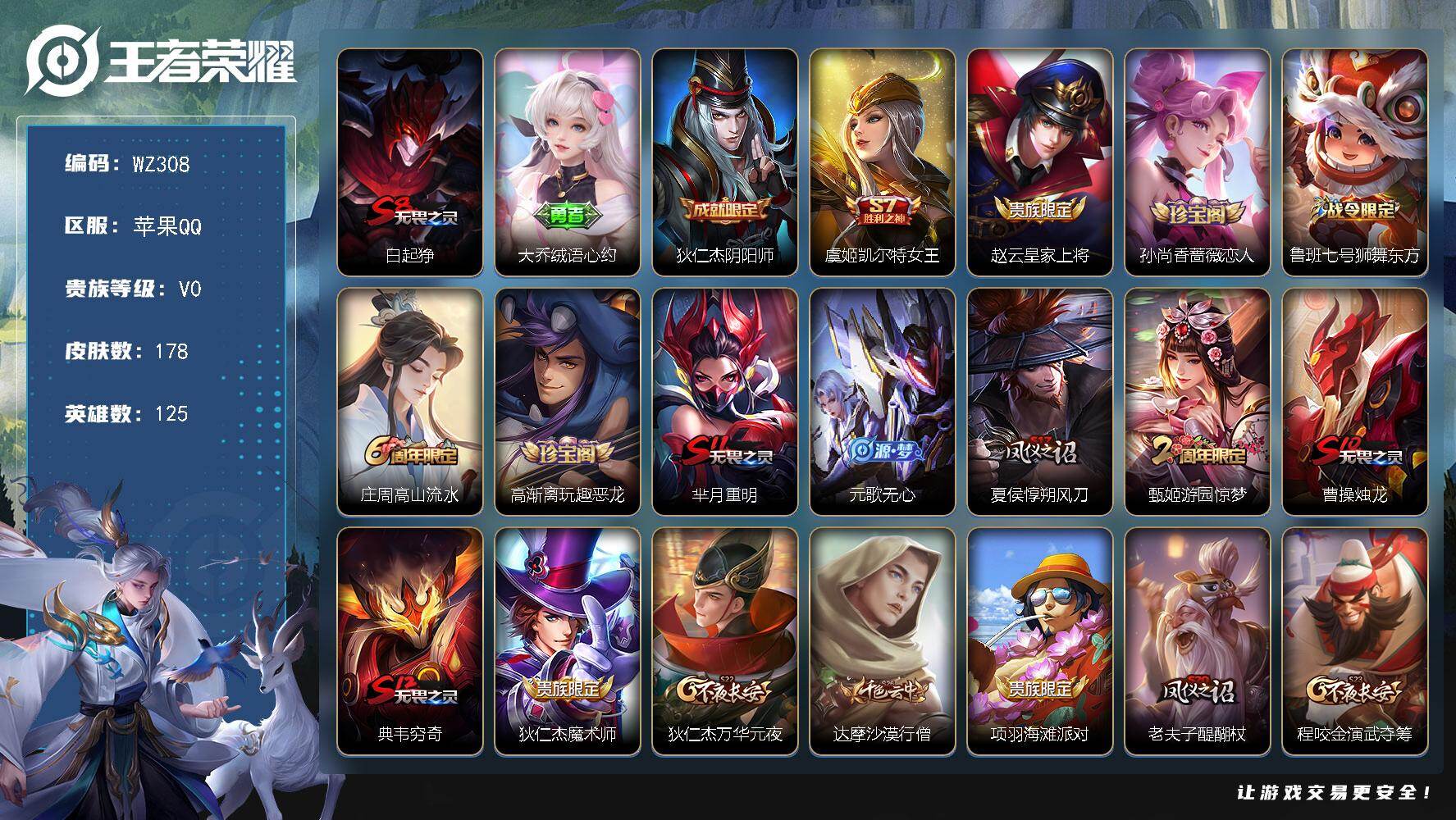 - [12288514]V8 1典藏 1珍品传说 14传说 125英雄 276皮肤 可修改实名 女号 优质装备:天鹅之梦(小乔典藏),怪盗基德,绛天战甲(鸡嘴战神),猫影幻舞,一念神魔,云霓雀翎,地狱火,仲夏夜之梦(大飞蛾),零号·赤焰 传说皮:典韦战鼓燎原 珍宝阁皮:妄想食味,优雅恋人,蔷薇恋人 限定皮:鸣野蒿,至尊宝,白虎志(电光耗子),白晶晶,时雨天司(水龙头),五谷丰年,武圣,天狼运算者,梁祝,御风骁将(吕布年限),天狼狩猎者,奔雷神使(牛魔年限),祈雪灵祝(雪兔子),李小龙,大圣娶亲 史诗皮:星界战将,怒海争锋,蒙犽顽岩魄,琥珀纪元伽罗,百相守梦-百里守约,紫霞仙子,电玩小子(小书包),黄金分割率,特工魅影,千年之狐,江河有灵,高渐离燃音魔法,蒙恬荣光圣徽,冰冠公主,偶像歌手,末日机甲-吕布,猫狗日记-孙策,时之恋人-孙尚香,乱世虎臣,节奏热浪,修罗,女仆咖啡,摇滚巨星,水果甜心,天才门将,星夜王子,心灵骇客,功夫厨神,德古拉伯爵,暗隐猎兽者,幽灵船长,鬼剑武藏,心灵战警,纤云弄巧,繁星吟游(呼啦呼啦),拒霜思,乘风破浪,逐浪之夏,月团寄思,水晶猎龙者,金属风暴,原初追逐者,圣诞狂欢,圣诞恋歌,鹰眼统帅,暗夜贵公子,魅力维加斯