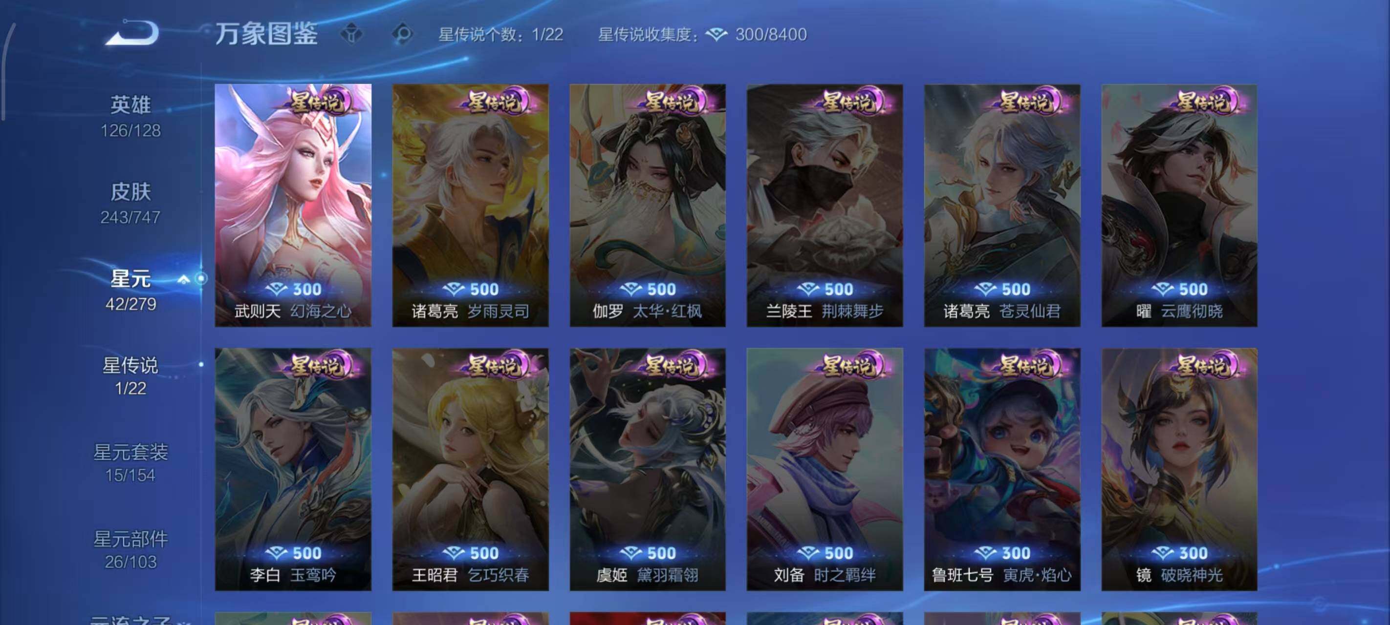 - PX_2063924-32 安卓QQ/至圣王者/205皮肤/125英雄/1典藏/0珍品无双/0无双/1珍品传说/13传说/60史诗/9稀有英雄 【1 珍品传说】器灵·落星盏 嫦娥, 【1 典藏皮肤】鸣剑·曳影 李白, 【13 传说皮肤】武圣 关羽,逐花归海 澜,无双飞将 马超,云鹰飞将 曜,诗剑行 李白,地狱之眼 宫本武藏,祈雪灵祝 公孙离,炽阳神光 镜,久胜战神 干将莫邪,寅虎·赤拳 裴擒虎,山