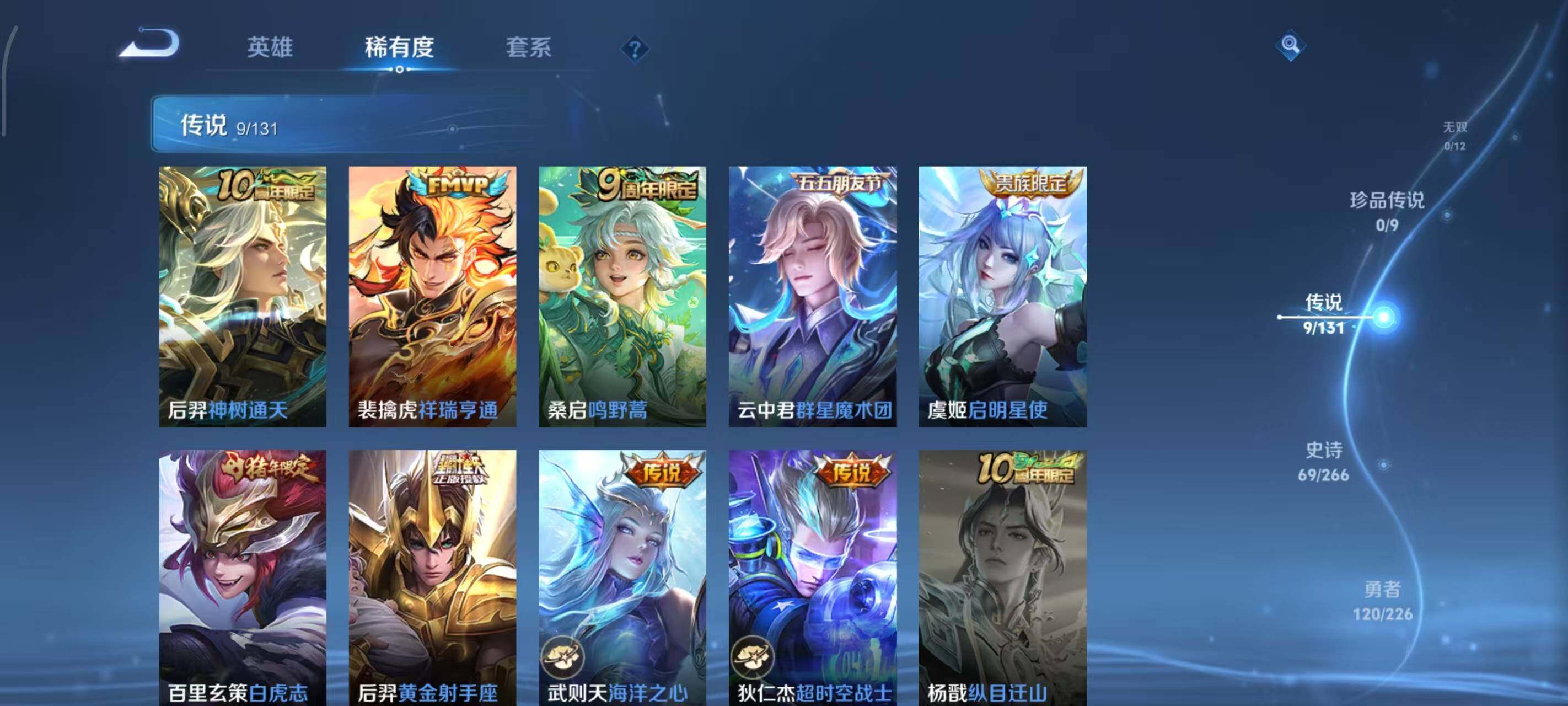 【传说皮肤】:后羿神树通天,裴擒虎祥瑞亨通,桑启鸣野蒿,云中君群星魔术团,虞姬启明星使,百里玄策白虎志,后羿黄金射手座,武则天海洋之心,狄仁杰超时空战士