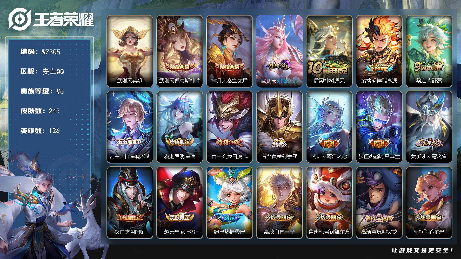 - [14296259]可二次【店主推荐捡漏号!可直接换绑】安卓Q-V8-最强王者段位-126英雄-218皮肤-2典藏皮肤-7传说-51史诗-1星元 【荣耀典藏】:小乔天鹅之梦,鲁班七号星空梦想 【传说皮肤】:桑启鸣野蒿,吕布怒海麟威,孙策挚爱之约,孙尚香异界灵契,王昭君乞巧织情,虞姬启明星使,貂蝉猫影幻舞 【限定皮肤】:姜子牙天穹之誓,狄仁杰阴阳师,赵云皇家上将,墨子神迹守卫,孙尚香异界灵契,庄周高山流水,高渐离死亡摇滚,钟无艳超时空战士,芈月幻夜卜梦,夏侯惇朔风刀,甄姬游园惊梦,甄姬落雪兰心,曹操烛龙,典韦穷奇,狄仁杰魔术师,狄仁杰万华元夜,达摩沙漠行僧,项羽海滩派对,老夫子醍醐杖,老夫子航海奇遇记,程咬金演武夺筹,王昭君午后时光,兰陵王金庭之子,牛魔御旌,李元芳云中旅人,虞姬启明星使,钟馗驱傩正仪,杨玉环遇见飞天,干将莫邪胡桃夹子,雅典娜单词大作战,雅典娜黎明之约,蔡文姬繁星吟游,太乙真人饕餮,鬼谷子原初探秘者,鬼谷子五谷丰年,黄忠火炮绅士,苏烈千军破阵,百里玄策原初追逐者,弈星混沌棋,沈梦溪大漠名商,明世隐疑决卦,裴擒虎李小龙,裴擒虎擒涛扼浪,狂铁电玩高手,米莱狄御霄,盾山御銮,孙策挚爱之约,嫦娥暖冬兔眠,蒙犽狂想玩偶喵,鲁班大师探海日志,桑启海盐诗旅,暃星界游侠,艾琳女武神,阿古朵江河有灵,张良古海寻踪,鬼谷子天穹祈灯,安琪拉乘龙聚宝船,刘邦剑破天穹 【年限皮肤】:安琪拉乘龙聚宝船 【赛季限定】:夏侯惇朔风刀,曹操烛龙,典韦穷奇,狄仁杰万华元夜,达摩沙漠行僧,老夫子醍醐杖,程咬金演武夺筹,兰陵王金庭之子,张良古海寻踪,牛魔御旌,李元芳云中旅人,钟馗驱傩正仪,雅典娜黎明之约,太乙真人饕餮,鬼谷子原初探秘者,苏烈千军破阵,百里玄策原初追逐者,弈星混沌棋,沈梦溪大漠名商,明世隐疑决卦,裴擒虎擒涛扼浪,米莱狄御霄,盾山御銮,鲁班大师探海日志,桑启海盐诗旅,鬼谷子天穹祈灯,刘邦剑破天穹,姜子牙天穹之誓 【战令限定】:墨子神迹守卫,钟无艳超时空战士,芈月幻夜卜梦,甄姬落雪兰心,老夫子航海奇遇记,王昭君午后时光,雅典娜单词大作战,黄忠火炮绅士,狂铁电玩高手,嫦娥暖冬兔眠,蒙犽狂想玩偶喵,暃星界游侠 【史诗皮肤】:鲁班七号电玩小子,赵云皇家上将,赵云未来纪元,貂蝉圣诞恋歌,甄姬冰雪圆舞曲,王昭君偶像歌手,狄仁杰魔术师,廉颇地狱岩魂,宫本武藏鬼剑武藏,孙尚香水果甜心,妲己魅力维加斯,妲己女仆咖啡