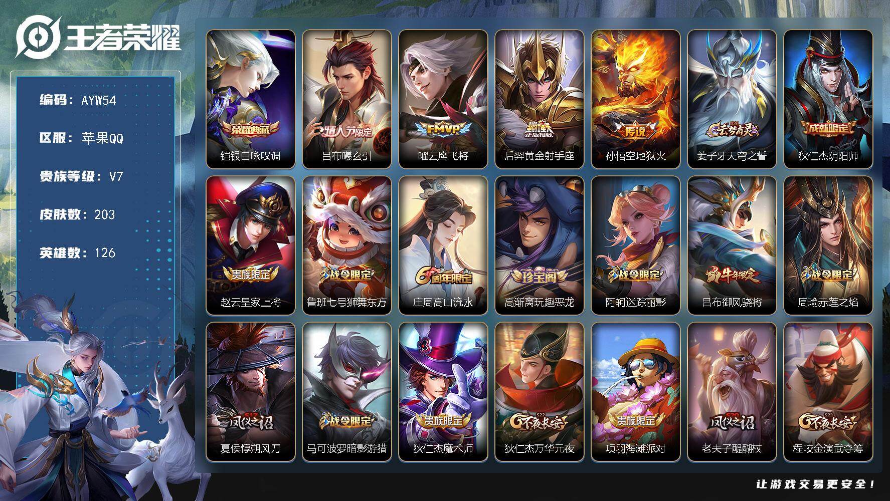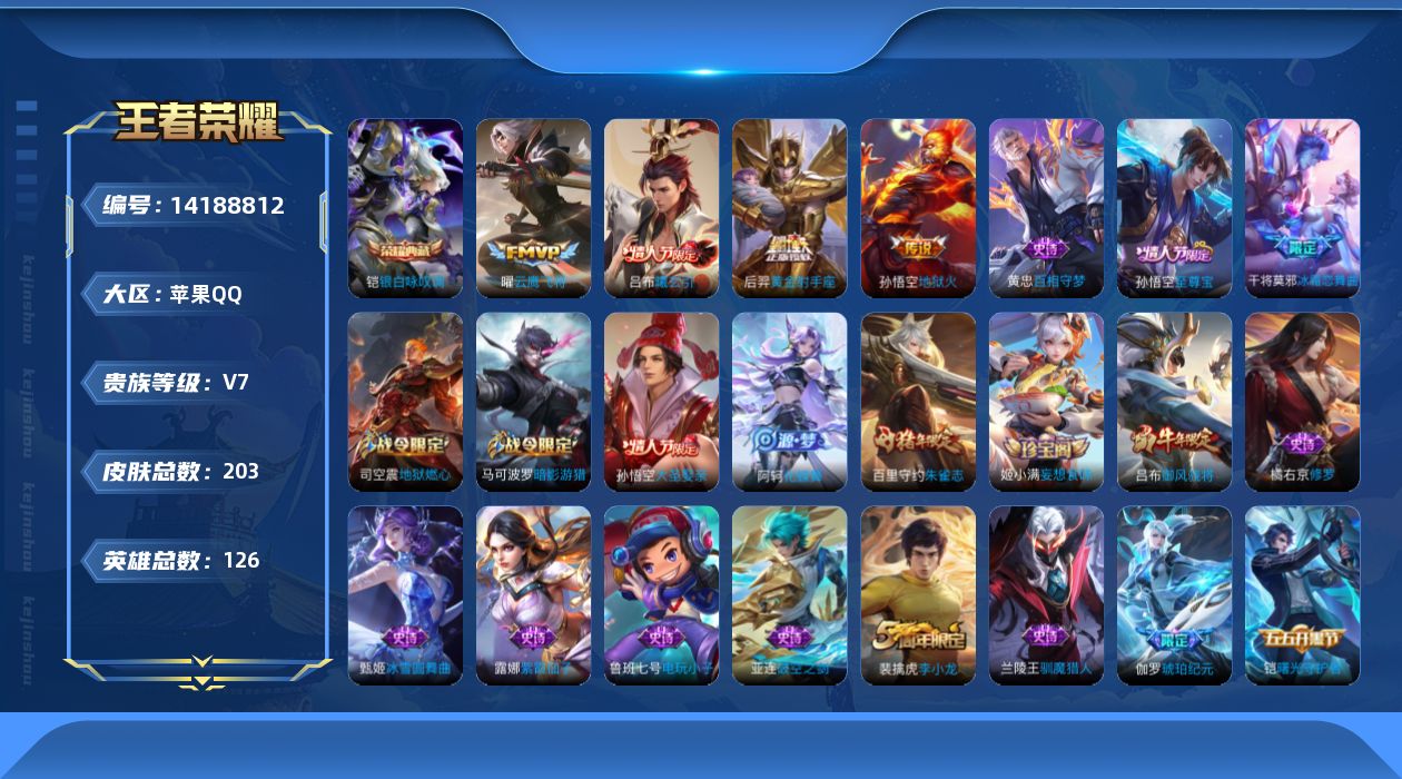 [14188812]可二次【店主推荐捡漏号!可直接换绑】苹果Q-V7-至尊星耀II段位-126英雄-203皮肤-1典藏皮肤-4传说-51史诗