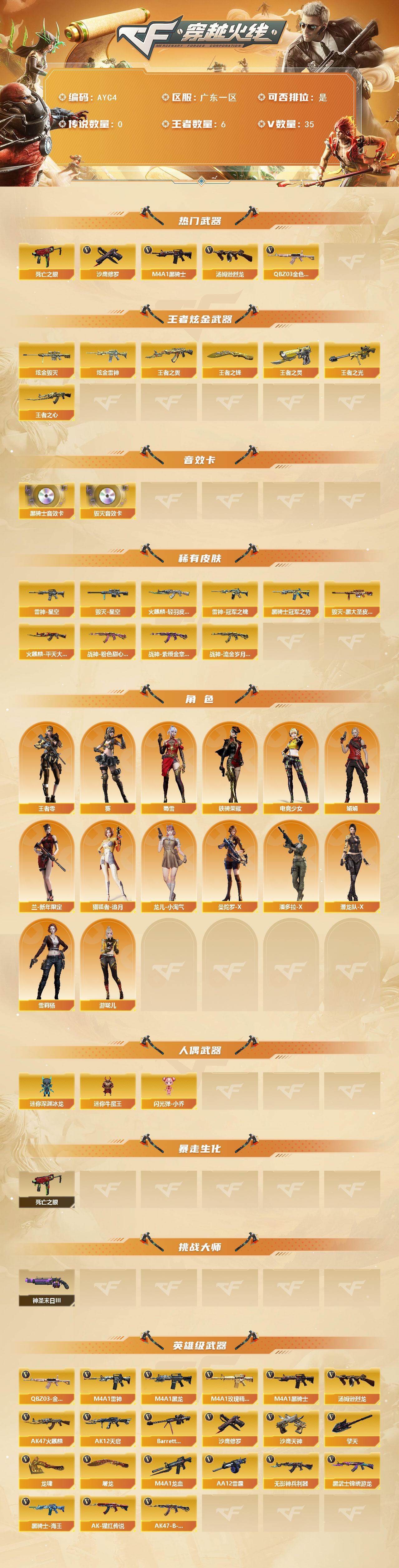[14188846]可二次【店主推荐捡漏号!可直接换绑】广东一区-35V-6王者-3炫金 【热门武器】:QBZ03-金色蔷薇,死亡之眼,M4A1-黑骑士,汤姆逊-烈龙*3,沙鹰-修罗*3 【王者炫金武器】:王者之翼,王者之心,王者之光,王者之灵,王者之锋,炫金雷神*2,炫金毁灭 【音效卡】:M4A1-黑骑士音效卡,Barrett-毁灭音效卡 【皮肤】:雷神-星空,雷神-冠军之魄,火麒麟-轻羽皮肤,火麒麟-平天大圣,毁灭-星空,毁灭-黑大圣皮肤,黑骑士-冠军之势,战神-粉色甜心皮肤,战神-紫绶金章皮肤*4,战神-流金岁月皮肤*5 【角色】:葵,王者-零,电竞少女,娟娟,兰-新年限定,猎狐者-追月,龙儿-小淘气,曼陀罗-X,潘多拉-X,潜龙队-X,蜀雪,铁骑荣耀,雪莉杨,游珑儿 【人偶武器】:迷你深渊冰龙,迷你牛魔王,闪光弹-小乔 【暴走生化】:死亡之眼 【挑战大师】:神圣爆裂者-末日III 【英雄级武器】:AK47-火麒麟,M4A1-黑龙,M4A1-雷神,M4A1-黑骑士,AK12-天启,M4A1-龙血*2,无影-神兵利器,黑武士-锦绣游龙,M4A1-玫瑰精灵,QBZ03-金色蔷薇,AK-47-猩红传说*7,AK47-B-战神,黑骑士-海王,Barrett-毁灭,汤姆逊-烈龙*3,AA-12-雷霆,沙鹰-修罗*3,沙鹰-天神,屠龙*2,龙啸,擎天 【道具】:炫彩背包,老虎背包,超级背包,灵魂忍者,变异宝贝,妖姬,生化弹匣,夺命之镰,防化服,金色流光-枪王排位,星辰流光-枪王排位,枪王排位28赛季金色流光,枪王排位29赛季金色流光,防弹头盔*5,防弹衣*3,C4工具钳,手雷包*3 【特殊枪械】:1黑骑士,3烈龙