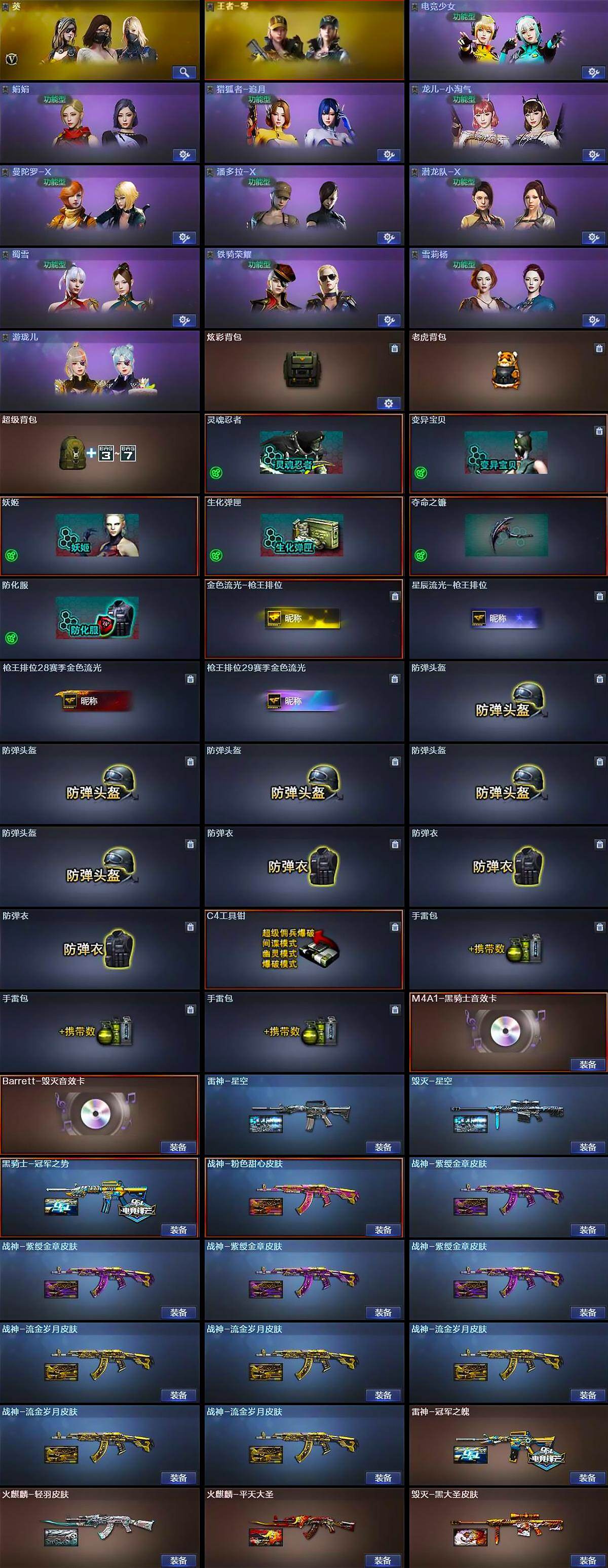 【道具】:炫彩背包,老虎背包,超级背包,灵魂忍者,变异宝贝,妖姬,生化弹匣,夺命之镰,防化服,金色流光-枪王排位,星辰流光-枪王排位,枪王排位28赛季金色流光,枪王排位29赛季金色流光,防弹头盔*5,防弹衣*3,C4工具钳,手雷包*3