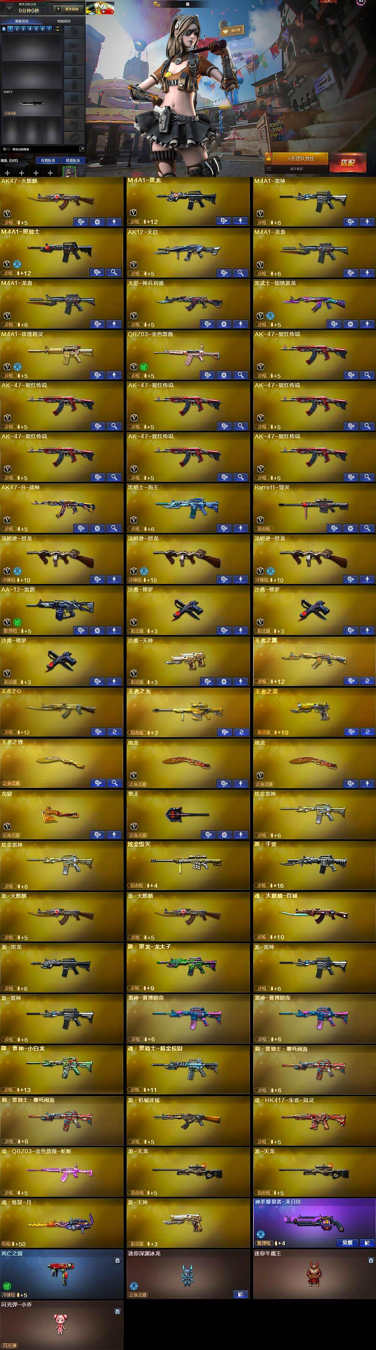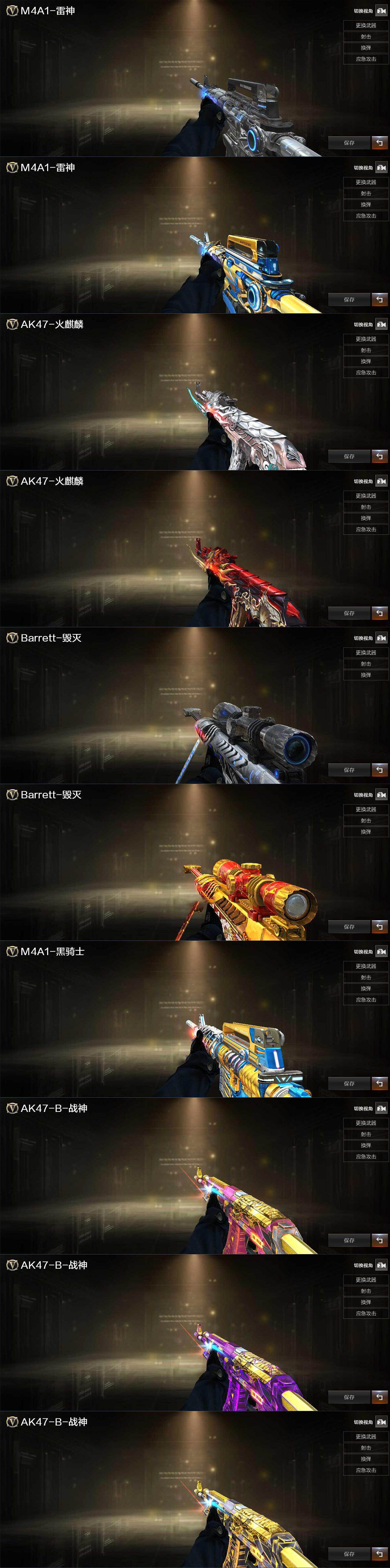 【英雄级武器】:AK47-火麒麟,M4A1-黑龙,M4A1-雷神,M4A1-黑骑士,AK12-天启,M4A1-龙血*2,无影-神兵利器,黑武士-锦绣游龙,M4A1-玫瑰精灵,QBZ03-金色蔷薇,AK-47-猩红传说*7,AK47-B-战神,黑骑士-海王,Barrett-毁灭,汤姆逊-烈龙*3,AA-12-雷霆,沙鹰-修罗*3,沙鹰-天神,屠龙*2,龙啸,擎天