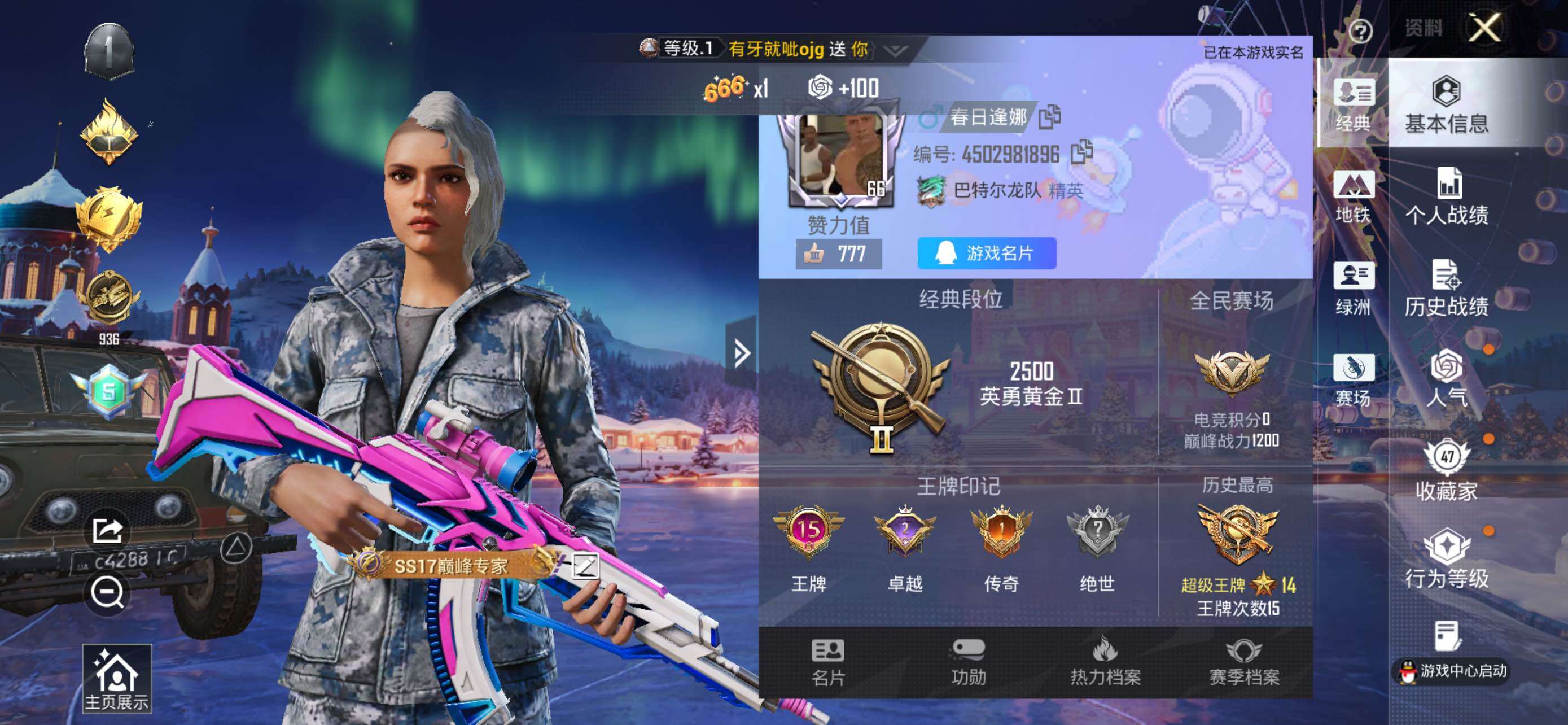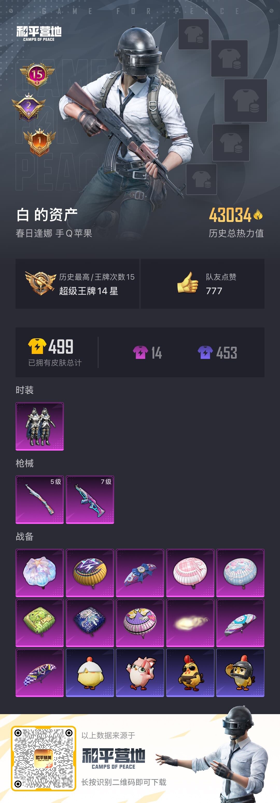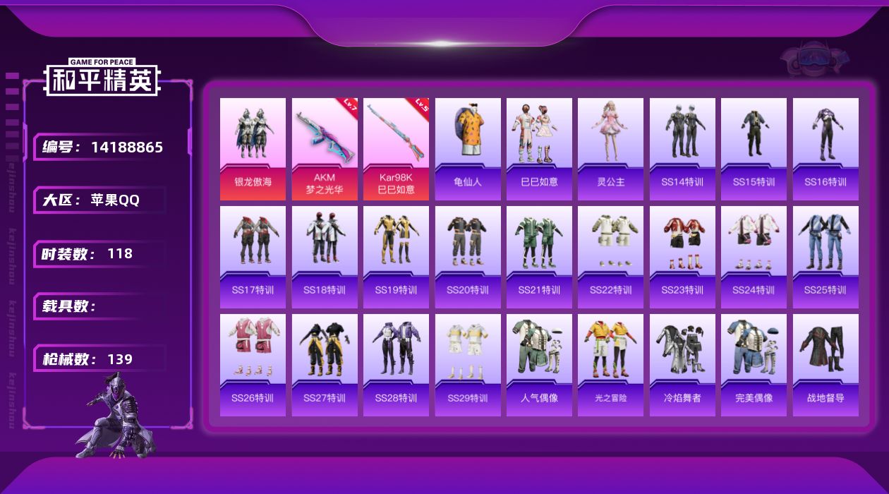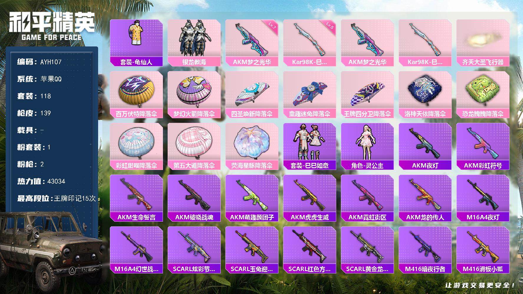 [14188865]可二次【店主推荐捡漏号!可直接换绑】苹果 手Q-1粉装-2特效枪-0载具-1粉色飞行器-43034热力值-15王牌印记-118套装-139枪皮【热门品类】:套装-龟仙人【粉色套装】:粉装-银龙傲海【粉色枪皮等级】:AKM-梦之光华(七级),Kar98K-巳巳如意(五级)【粉色枪皮】:AKM-梦之光华,Kar98K-巳巳如意【粉色飞行器】:齐天大圣飞行器