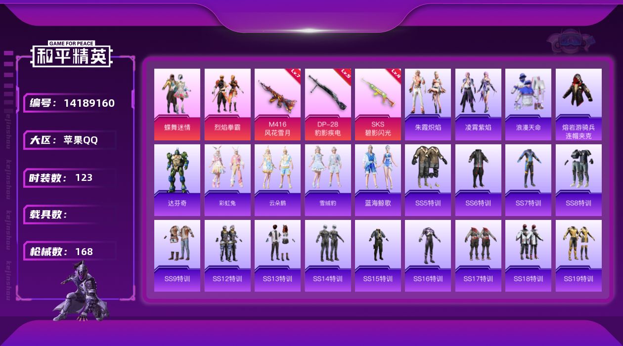 - [12234713]1粉装 7特效枪 10印记 可二次 可修改实名 优质装备:AMR炫光之旅,AKM绿萝繁花,SCAR-L-锦绣绵绵,七级AMR-炫光之旅,GROZA-镜光银凌,AUG-暖羊咩咩,雪月幻音,Kar98K-巳巳如意 热门装扮:呆萌铁蟹 稀有枪皮:DP-28-豹影疾电 五级特效枪:五级GROZA-镜光银凌,五级Kar98K-巳巳如意,五级DP-28-豹影疾电,五级AUG-暖羊咩咩,五级SCAR-L-锦绣绵绵,五级AKM-绿萝繁花 紫色装扮:田园牧歌,轻风白浪,SS22特训,飞狐塔尔斯,SS23特训,幻彩翩翩,妙红点点,娇憨猪猪,萌趣咩咩,SS21特训,熠彩粉晶,SS31特训套装,人气偶像,军械专家,冰川特警,SS30特训套装,云朵鹅,雪绒豹,SS33特训套装,青涩时光,顶瓜瓜,SS20特训,酒红色名流,长空猛禽,雪山精英,雪鹰学院,霓虹街区,青年教官,缤纷果语,耀眼新星,荣耀,蓝彩潮人,蓝色守护者,蓝色运动,虎虎生威吉莉,飞行日记,龙腾端午,骑行爱好者,魅力单车,鹤鸣,麻辣教官,黄色伏地魔,黄色名流,黄色运动,黑色伏地魔,龙的传人,龟仙人,冰河战士,龙魂突击队,蝶变,柠萌假日,橘黑制服,海岛探路者,涂山之恋,深蓝色名流,清新柠檬,夏日倾情,完美偶像,帅气教官,幻世战舞者,湖蓝色名流,绮丽涂鸦,甜蜜菠萝,白色伏地魔,破蛋小黄鸡,空岛之星,空投萌叽,竞技达人朋克,红色运动,王牌教练,牛气冲天,猛禽,特战英豪,猎鹰,SS29特训,星途旅人,SS28特训,鱼渊荷华,玉兔迎春,燕燕于飞,巳巳如意,森林游猎者,竞技名士,许七安,怀庆长公主,惊鸿侠骨,SS24特训(SS24特训套装),SS25特训,锦衣飞扬,SS27特训,Alan Walker,浪漫天命,SS26特训,智谋强哥,精神漫游,大橘大利,春日漫步,SS32特训服(SS32特训套装),猎影月神,绯格组合,萌黄之夏,白糯汤圆,冰冻风暴,光之冒险,青羽突袭者 优质战备:星途旅人降落伞,临安公主降落伞,炫光之旅降落伞,纯梦嫁纱降落伞