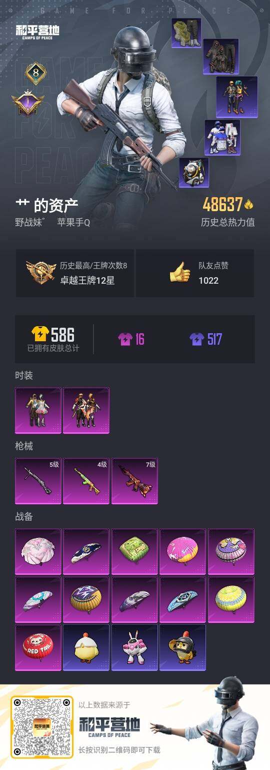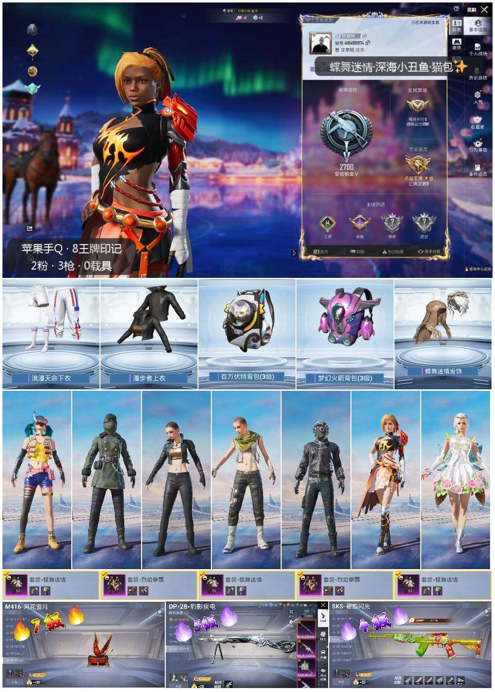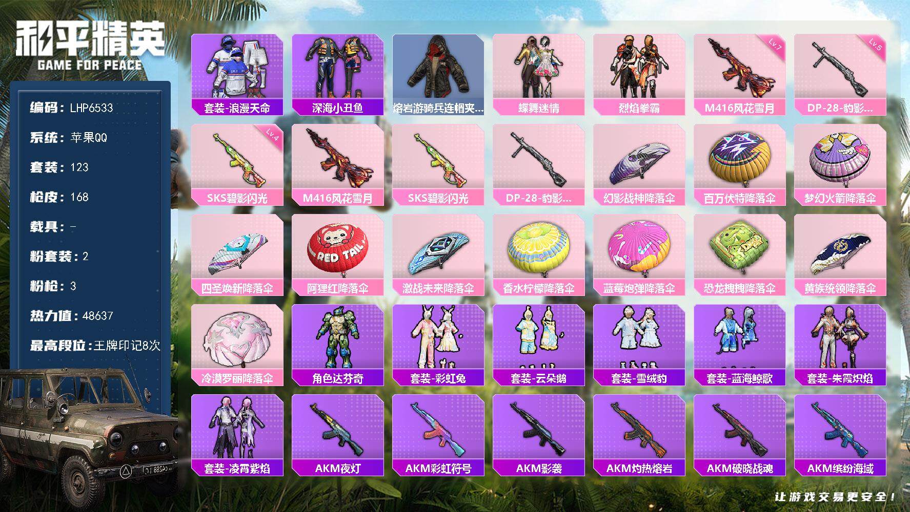 [14189160]可二次【店主推荐捡漏号!可直接换绑】 苹果 手Q-2粉装-3特效枪-4.8w热力值-8王牌印记-123套装-168枪皮【热门品类】:套装-浪漫天命,套装-深海小丑鱼,熔岩游骑兵连帽夹克【粉色套装】:粉装-蝶舞迷情,粉装-烈焰拳霸【粉色枪皮等级】:M416-风花雪月(七级),SKS-碧影闪光(四级),DP-28-豹影疾电(五级)