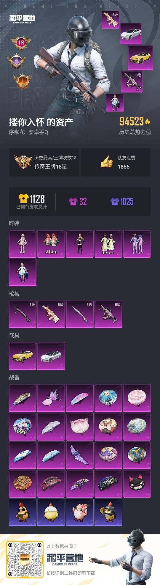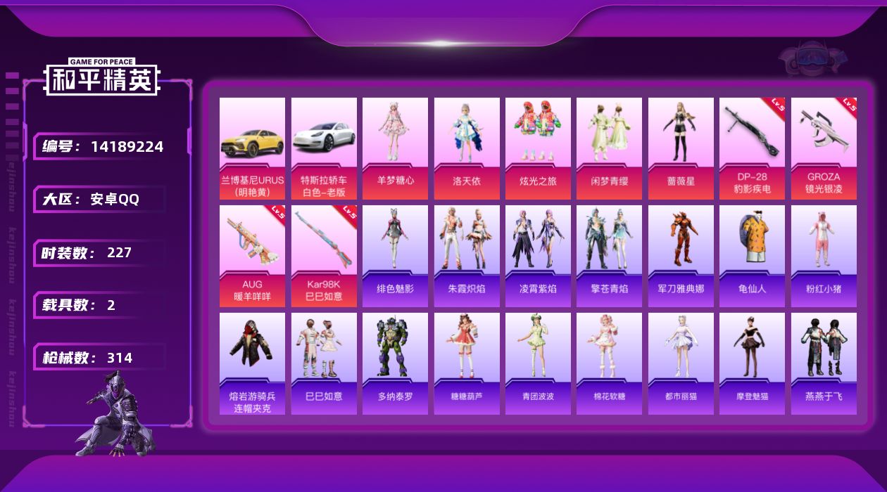 - [14451055]【1614】安卓 手Q-无敌战神框-1神装-17粉装-8特效枪-2载具-7粉色飞行器-93866热力值-19王牌印记-200套装-277枪皮 【红色神装等级】:金蛇镇世-烛九(一级) 【红色角色神装】:金蛇镇世-烛九 【热门品类】:粉装-怪诞乔克,粉装-雪国幻梦,套装-浪漫天命,套装-都市猎人,套装-天网终结者,套装-金羽特工,套装-龟仙人,套装-暗影哥特,套装-粉红小猪,套装-红熊茄茄 【粉色载具】:兰博基尼Estoque(银翼灰),僚机-圣域龙宝,护世瑞兽 【粉色套装】:粉装-怪诞乔克,粉装-宝贝奶油派,粉装-天使彩虹糖,粉装-雪国幻梦,粉装-金属狂野,粉装-智能音符,粉装-极致幻想,粉装-绚金战神,粉装-碧影闪光,女娲后裔-赵灵儿,角色-宙之时溯,角色-圣堂之誓,角色-小叽联名款,角色-烟云彩露,角色-智耀战神,角色-幻海仙踪,粉装-星穹咏叹调 【粉色枪皮等级】:AKM-梦之光华(七级),SCAR-L-锦绣绵绵(五级),M416-心之恋语(七级),M416-风花雪月(四级),GROZA-镜光银凌(五级),AKS-74U-星穹咏叹调(五级),Kar98K-巳巳如意(五级),DP-28-豹影疾电(五级) 【粉色枪皮】:AKM-梦之光华,SCAR-L-锦绣绵绵,M416-心之恋语,M416-风花雪月,GROZA-镜光银凌,AKS-74U-星穹咏叹调,Kar98K-巳巳如意,DP-28-豹影疾电 【粉色飞行器】:歌者泠鸢飞行器,拂晓神骑飞行器,龙翔九天飞行器,凤舞九天飞行器,万象金身飞行器,圣域金龙飞行器,绯果甜心飞行器 【粉色降落伞】:幻影战神降落伞,甜心宝贝降落伞,炫紫旋律降落伞,神秘黑猫降落伞,暗翼战神降落伞,齐天大圣降落伞,蓝莓炮弹降落伞,天之羽翼降落伞,恐龙拽拽降落伞,环太平洋降落伞,音爆索尼克降落伞,仲夏莫吉托降落伞,圣堂之誓降落伞,猪猪侠降落伞,绝色倾城降落伞,月影灵韵降落伞,金蛇镇世降落伞,鬼刀降落伞,桃粉嫣然降落伞,圣域龙灵降落伞,绯果甜心降落伞,幻海仙踪降落伞,星穹咏叹调降落伞,幻彩电音降落伞 【稀有套装】:套装-龟仙人,套装-巳巳如意,套装-雏菊兔兔,套装-萝兰蝴蝶,套装-糖糖葫芦,套装-青团波波,角色-俏兔智灵,套装-燕燕于飞,套装-鱼渊荷华,角色-海琴烟,套装-闪电轻猫,套装-粉恋花,套装-紫幽梦,套装-蓝冰羽,角色-猎影月神,角色-幽澜祭