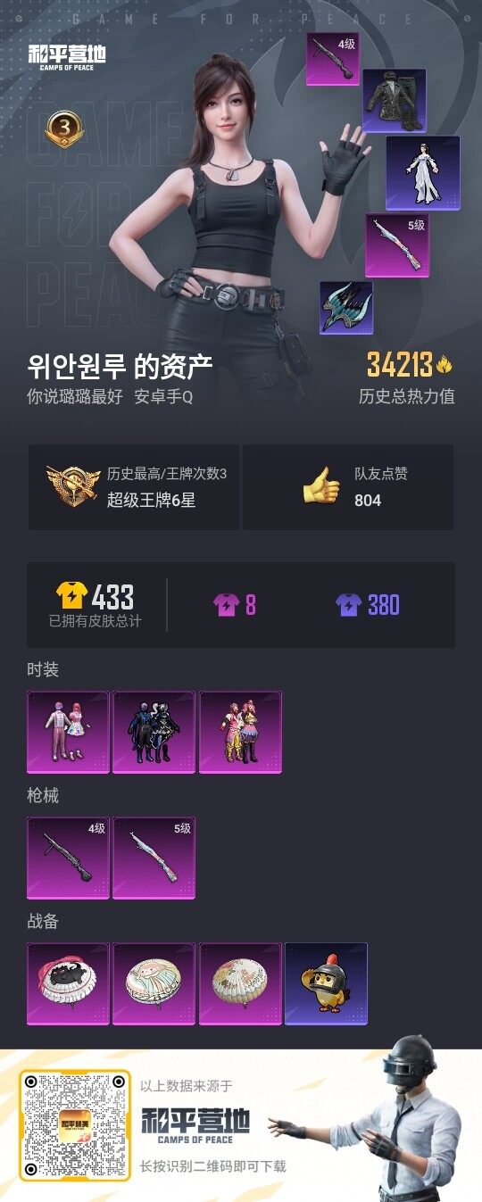 [14189210]可二次【店主推荐捡漏号!可直接换绑】 安卓 手Q-3粉装-2特效枪-3.4w热力值-3王牌印记-118套装-107枪皮【热门品类】:粉装-缤纷油彩,熔岩游骑兵连帽夹克【粉色套装】:粉装-天使彩虹糖,粉装-缤纷油彩,粉装-暗夜玫瑰【粉色枪皮等级】:Kar98K-巳巳如意(五级),DP-28-豹影疾电(四级)