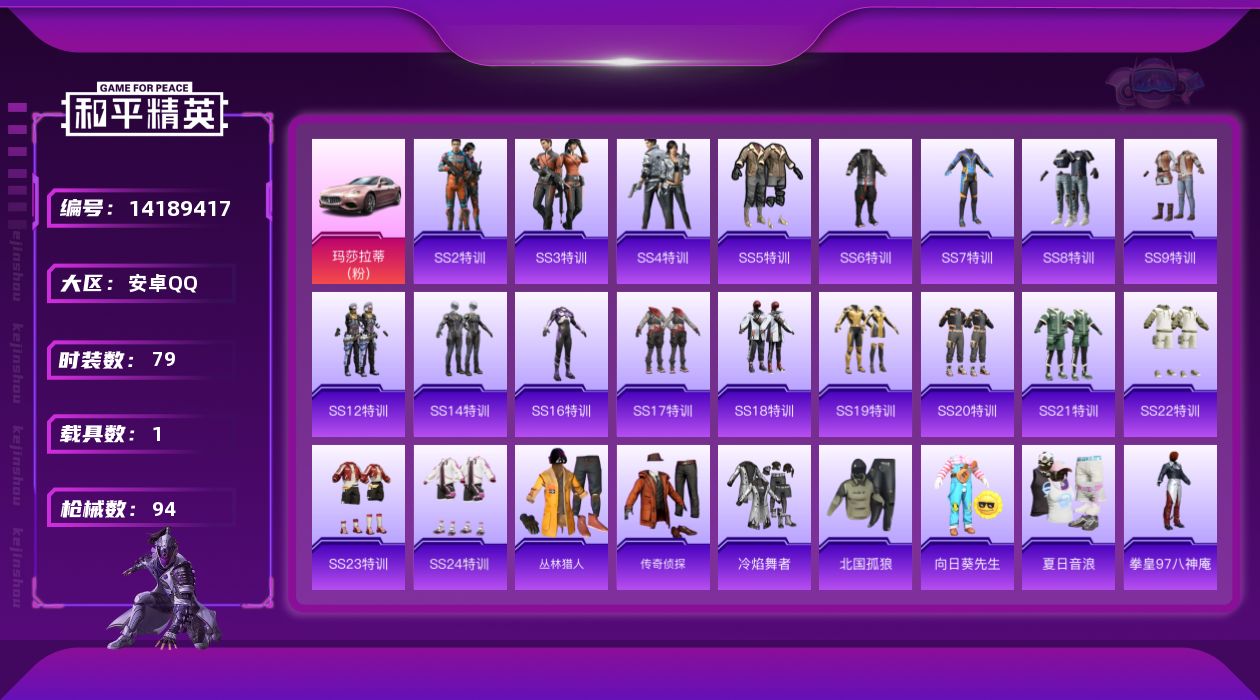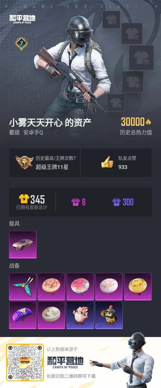 - 苹果QQ 可二次 当前段位超级王牌9星 历史最高段位传奇王牌18星 热力值75278 等级69 套装139 王牌次数13 点券15 外观套装13 枪械皮肤8 热门紫装16 载具1 飞行器3 稀有0 头盔2 背包1