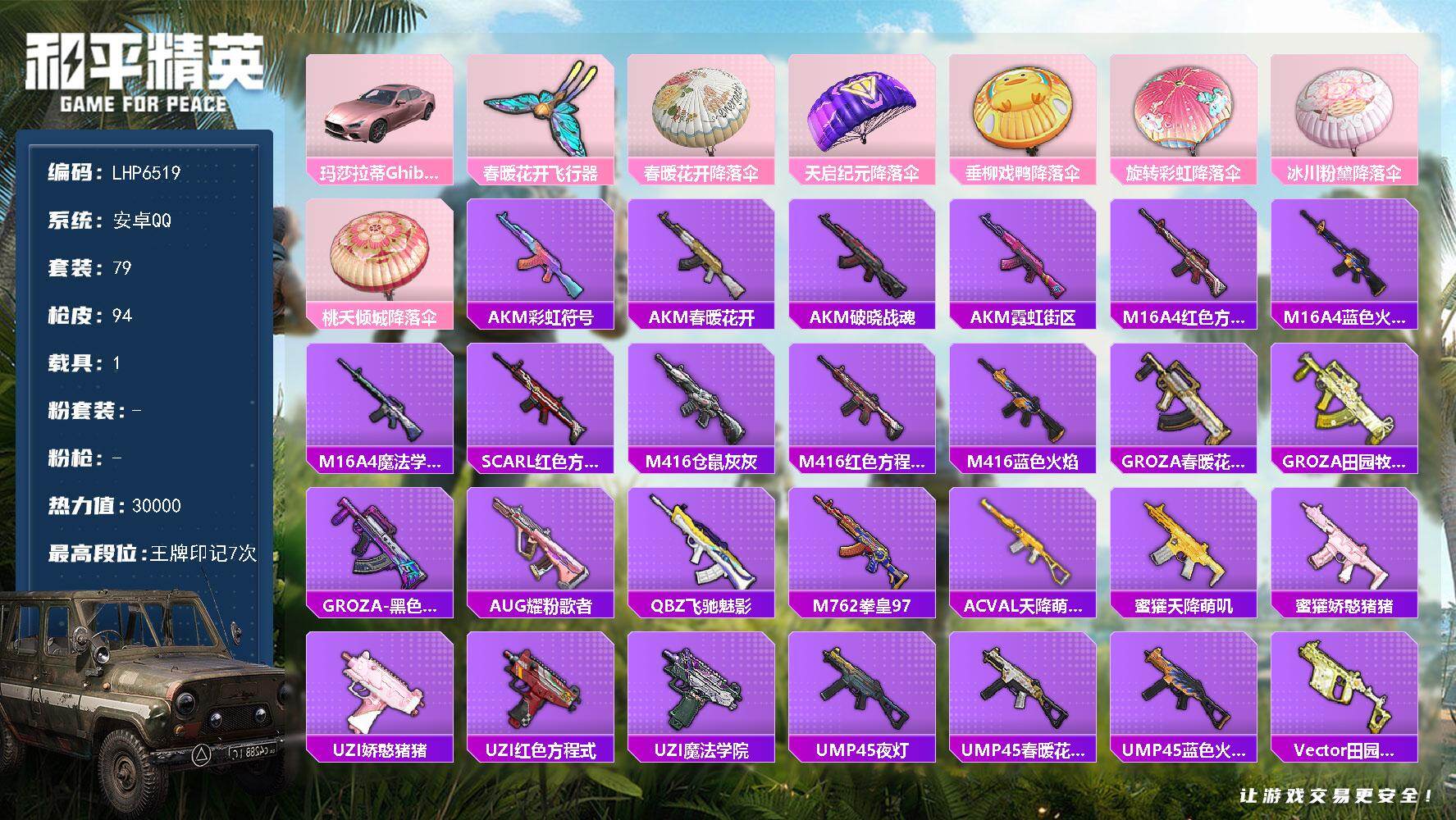 [14189417]【店主推荐捡漏号!可直接换绑】 安卓 手Q-1载具-1粉色飞行器-3w热力值-7王牌印记-79套装-94枪皮【粉色载具】:玛莎拉蒂Ghibli(粉)【粉色飞行器】:春暖花开飞行器