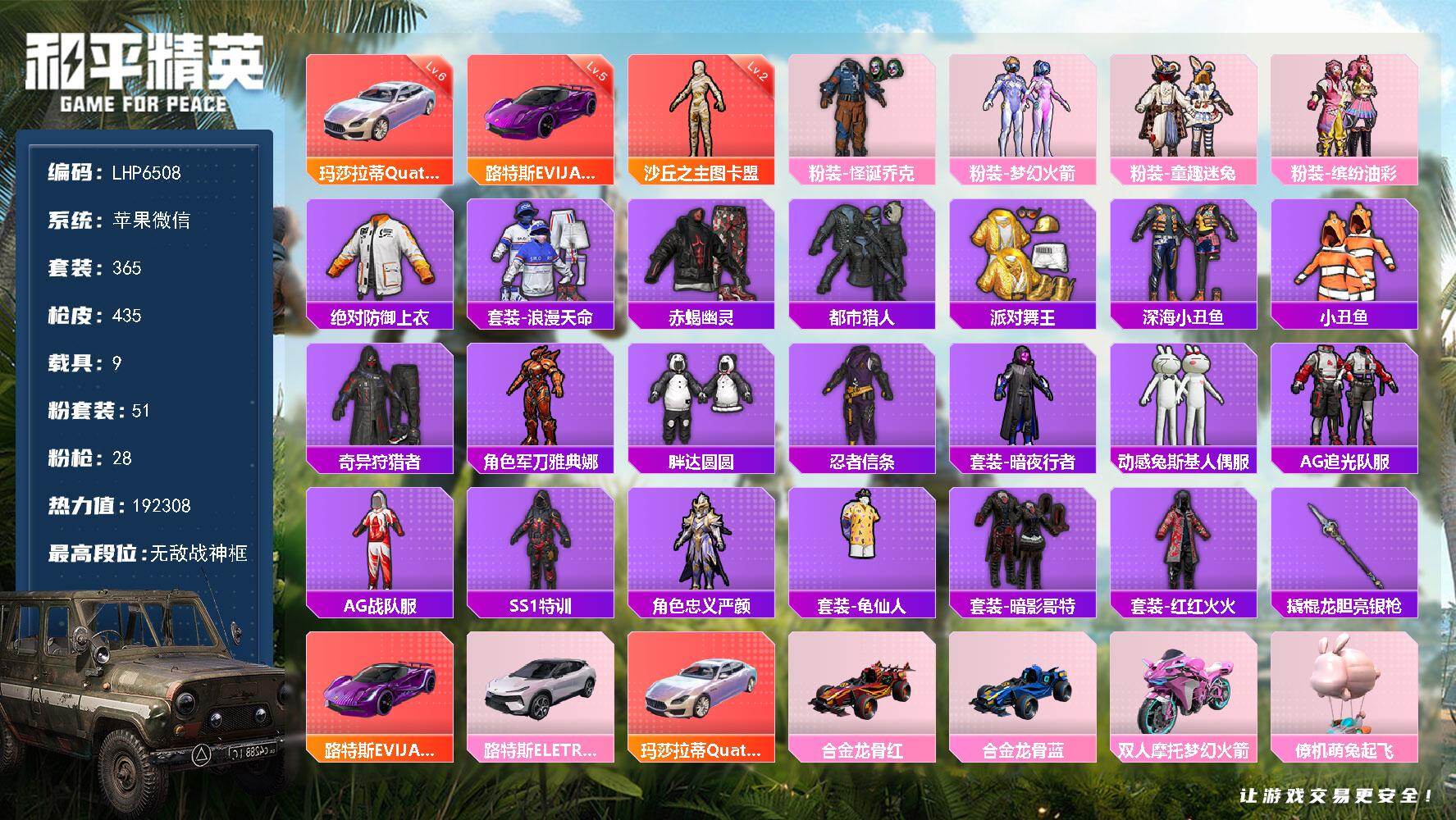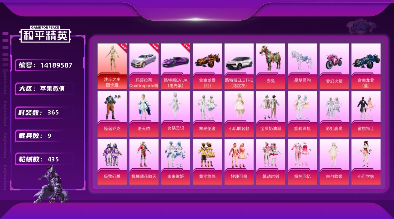 [14189587]素材身法号/路特斯EVIJA(电光紫)(五级)/玛莎拉蒂Quattroporte(幻星粉)(六级)/无敌战神框1/绝世印记11 /地铁满天赋 苹果 微信-无敌战神框-1神装-51粉装-28特效枪-9载具-15粉色飞行器-19.2w热力值-29王牌印记-365套装-435枪皮【红色载具】:路特斯EVIJA(电光紫)(五级),玛莎拉蒂Quattroporte(幻星粉)(六级)【红色神装等级】:沙丘之主-图卡盟(二级)【热门品类】:粉装-怪诞乔克,粉装-梦幻火箭,粉装-童趣迷兔,粉装-缤纷油彩,绝对防御上衣,套装-浪漫天命,套装-赤蝎幽灵,套装-都市猎人,套装-派对舞王,套装-深海小丑鱼,套装-小丑鱼,套装-奇异狩猎者,角色-军刀雅典娜,套装-胖达圆圆,套装-忍者信条,套装-暗夜行者,套装-动感兔斯基人偶服,套装-AG追光队服,套装-AG战队服,套装-SS1特训,角色-忠义严颜,套装-龟仙人,套装-暗影哥特,套装-红红火火,撬棍-龙胆亮银枪【粉色载具】:路特斯EVIJA(电光紫),路特斯ELETRE(花绽灰),玛莎拉蒂Quattroporte(幻星粉),合金龙骨(红),合金龙骨(蓝),双人摩托-梦幻火箭,僚机-萌兔起飞,赤兔,晶梦灵驹【粉色套装】:粉装-粉色回忆,粉装-怪诞乔克,粉装-甜心巧克力,粉装-宝贝奶油派,粉装-天使彩虹糖,粉装-蝶舞迷情,粉装-梦幻火箭,粉装-智能音符,粉装-缤纷油彩,粉装-放客神游,粉装-新星烈龙,粉装-极致幻想,粉装-花间之火,粉装-诡面斩,粉装-童趣迷兔,粉装-炙焰红王,粉装-馨动时刻,粉装-蜜桃特工,粉装-彩虹鹿灵,粉装-山涧鹿灵,角色-洛天依,粉装-黄伞悠悠,角色-2号机款机体服,粉装-精灵娃娃,粉装-岚岚物语,粉装-海盐物语,粉装-甜梦小狐,粉装-炙焰牛王,粉装-妙趣可丽,粉装-暖熊萌萌,粉装-霁雪冰心,粉装-灵感创作师,粉装-千面幻镜,粉装-旋转彩虹,粉装-冰川幽秘,粉装-冰川红玫,粉装-寒光使者,粉装-暗夜鎏金,粉装-第五大道,角色-白勺歌姬,角色-小可学妹,粉装-未来歌姬,粉装-莲影清波,粉装-暖暖奶龙,角色-圣堂之誓,角色-小叽联名款,粉装-机械师花傲天,粉装-蜜语绒猫,角色-烟云彩露,角色-女娲灵识,粉装-幻彩电音【粉色枪皮等级】:AKM-甜心宝贝(六级),SCAR-L-梦幻火箭(一级),SCAR-L-童趣迷兔(六级),M