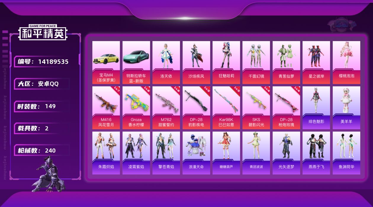 - [12263641]4粉装 11特效枪 2载具 15印记 可二次 可修改实名 身法装备:暗影哥特(红眼罩),Mark.06(新蓝螳螂) 优质装备:辉羽雀灵自行车,特斯拉Roadster(水滴蓝),六级Kar98K-创世·救赎,Kar98K创世·救赎,P90-金丰海韵,七级P90-金丰海韵,M762-青锋波束,GROZA-镜光银凌,智耀战神,AUG-圣斗士星矢,星穹咏叹调,AKS-74U-星穹咏叹调,MK14-甜梦熊击,Mk14-爆裂游戏,Kar98K-巳巳如意 热门装扮:暗夜玫瑰,金丰海韵,呆萌铁蟹 稀有枪皮:MG-36-沧焰双生,DP-28-豹影疾电 五级特效枪:五级M762-青锋波束,五级GROZA-镜光银凌,五级Kar98K-巳巳如意,五级m14爆裂游戏,五级DP-28-豹影疾电,五级MG-36-沧焰双生,五级MK14-甜梦熊击,五级AUG-圣斗士星矢 四级特效枪:四级AKS-74U-星穹咏叹调 紫色装扮:SS23特训,虚空漩涡,SS30特训套装,SS31特训套装,云朵鹅,雪绒豹,SS33特训套装,旭日情侣,诡诞巡游,SS21特训,田园牧歌,轻风白浪,和煦暖阳,SS22特训,顶瓜瓜,混沌火种,冷焰舞者,吉莉礼服,夏日音浪,完美偶像,帅气教官,幻影武者,冰川特警,灵公主,人气偶像,SS16特训,瑞龙福将,团圆交子,SS17特训,治愈之星,科技之星,SS14特训,萌趣颜团子,特种颜团子,青春冒险家,潮流游乐家,SS15特训,蝎王蛇后,SS20特训,竞技角斗士,异彩先驱,SS18特训,SS19特训,战地菁英,黄色名流,青年教官,风暴特警,飞行日记,骑行爱好者,魅力单车,鹤鸣,麻辣教官,黄色伏地魔,黄色运动,黑色伏地魔,龙的传人,龟仙人,冰河战士,龙魂突击队,蝶变,酷潮明星,霓虹极客,野性战心,长空猛禽,雨林探路者,银刃勇者大衣,熔岩游骑兵连帽夹克,无面战甲,绛羽幽主,街头潮人,深蓝色名流,湖蓝色名流,灰色格斗者,灼焰舞者,炫蓝之夏,热血青春,牛气冲天,牛气满满,海岛探路者,战地督导,探宝勇士,极地朋克,柠萌假日,格斗先锋,橘黑制服,沙漠毒蛇,竞技达人朋克,红色运动,绮丽涂鸦,缤纷果语,蓝彩潮人,蓝色运动,虎虎生威吉莉,空投萌叽,特殊使命,特训学院,狂沙舞者,猎鹰,猛禽,王牌教练,甜蜜告白,甜蜜熊情侣,空岛之星,白熊同盟,白色伏地魔,破晓战魂,破蛋小黄鸡,福星高照,萝兰蝴蝶,SS2