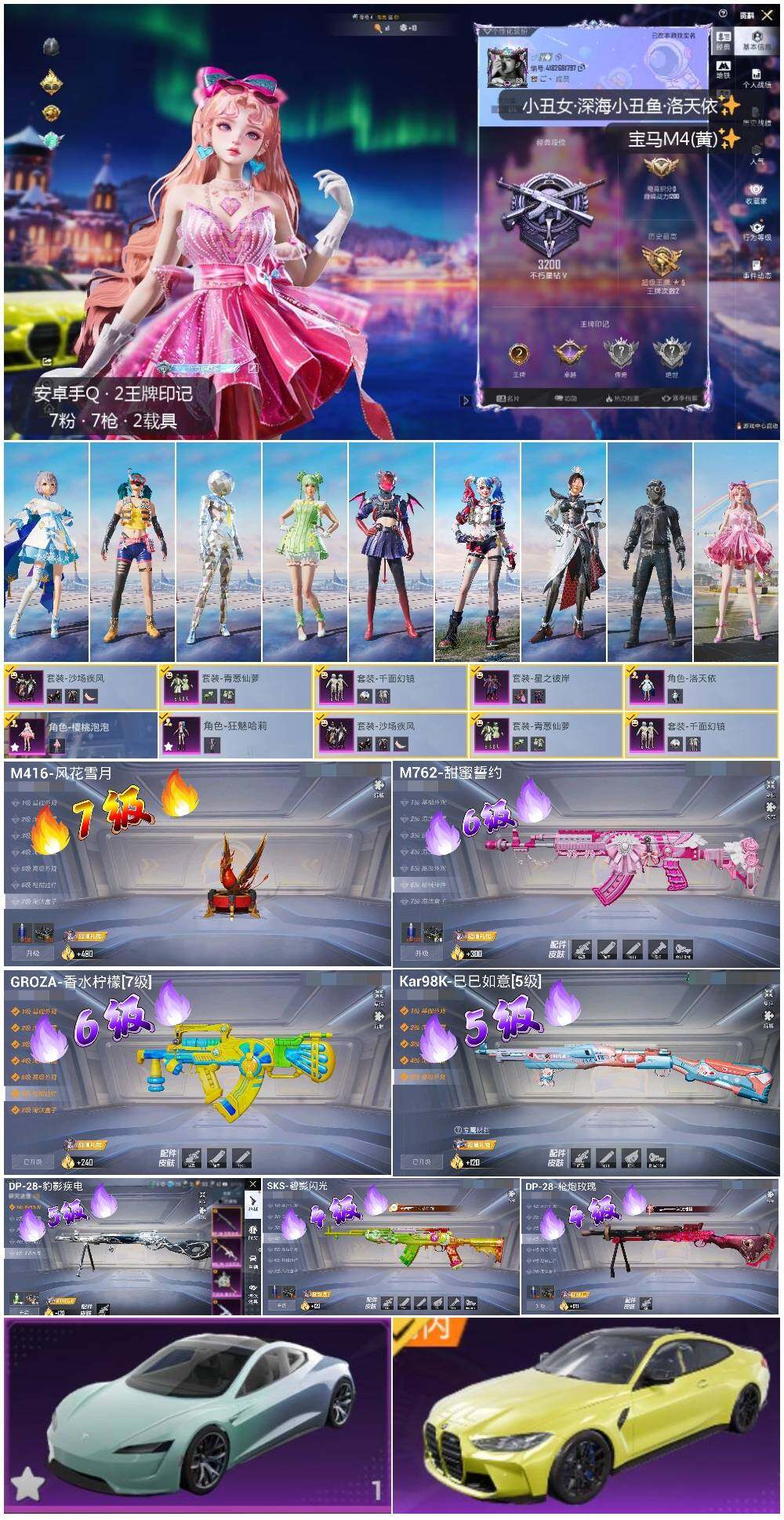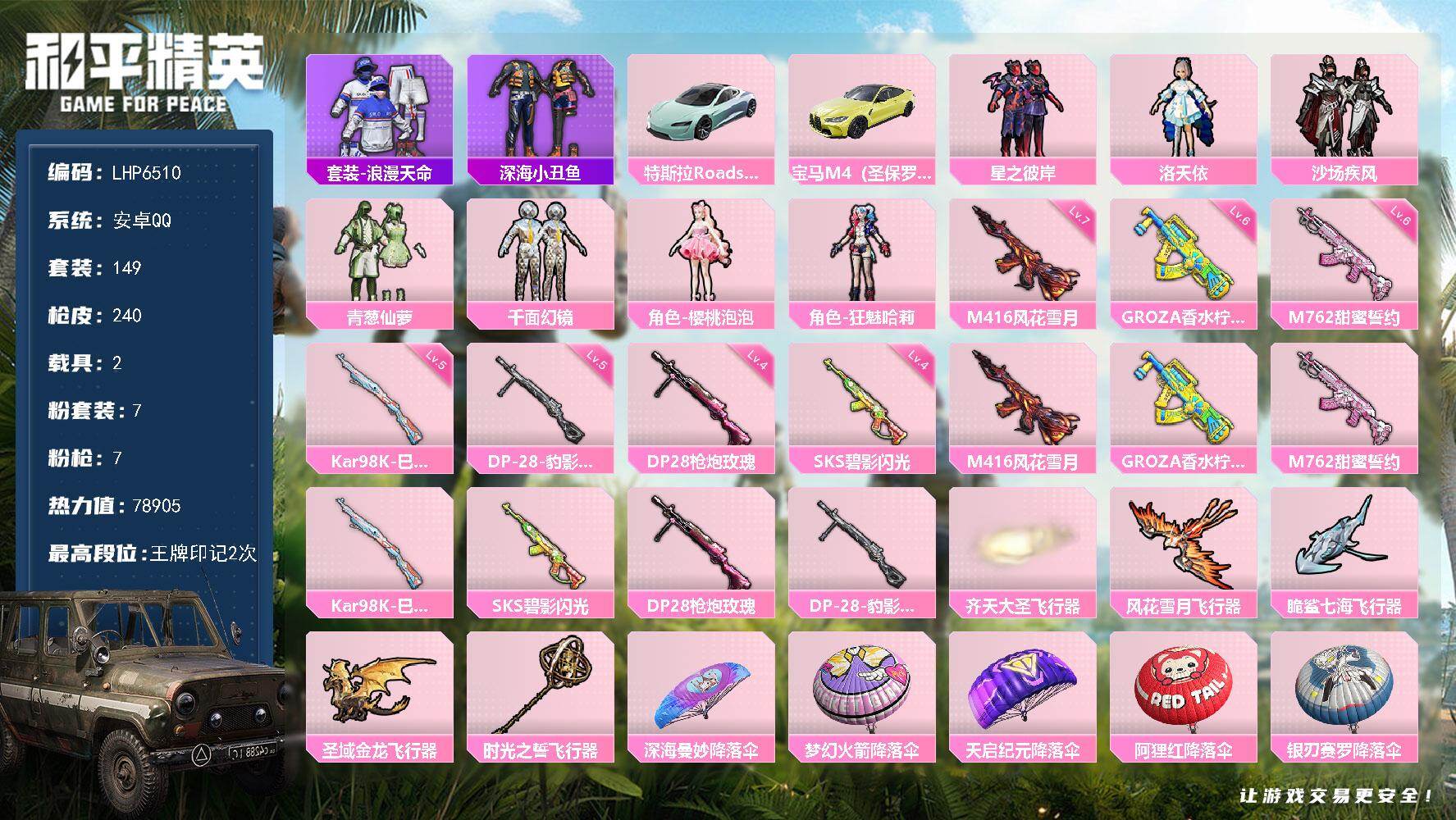 [14189535]可二次【店主推荐捡漏号!可直接换绑】 安卓 手Q-7粉装-7特效枪-2载具-7粉色飞行器-7.8w热力值-2王牌印记-149套装-240枪皮【热门品类】:套装-浪漫天命,套装-深海小丑鱼【粉色载具】:特斯拉Roadster(水滴蓝),宝马M4(圣保罗黄)【粉色套装】:粉装-星之彼岸,角色-洛天依,粉装-沙场疾风,粉装-青葱仙萝,粉装-千面幻镜,角色-樱桃泡泡,角色-狂魅哈莉【粉色枪皮等级】:M416-风花雪月(七级),GROZA-香水柠檬(六级),M762-甜蜜誓约(六级),Kar98K-巳巳如意(五级),SKS-碧影闪光(四级),DP-28-枪炮玫瑰(四级),DP-28-豹影疾电(五级)【粉色飞行器】:齐天大圣飞行器,风花雪月飞行器,脆鲨七海飞行器,圣域金龙飞行器,时光之誓飞行器