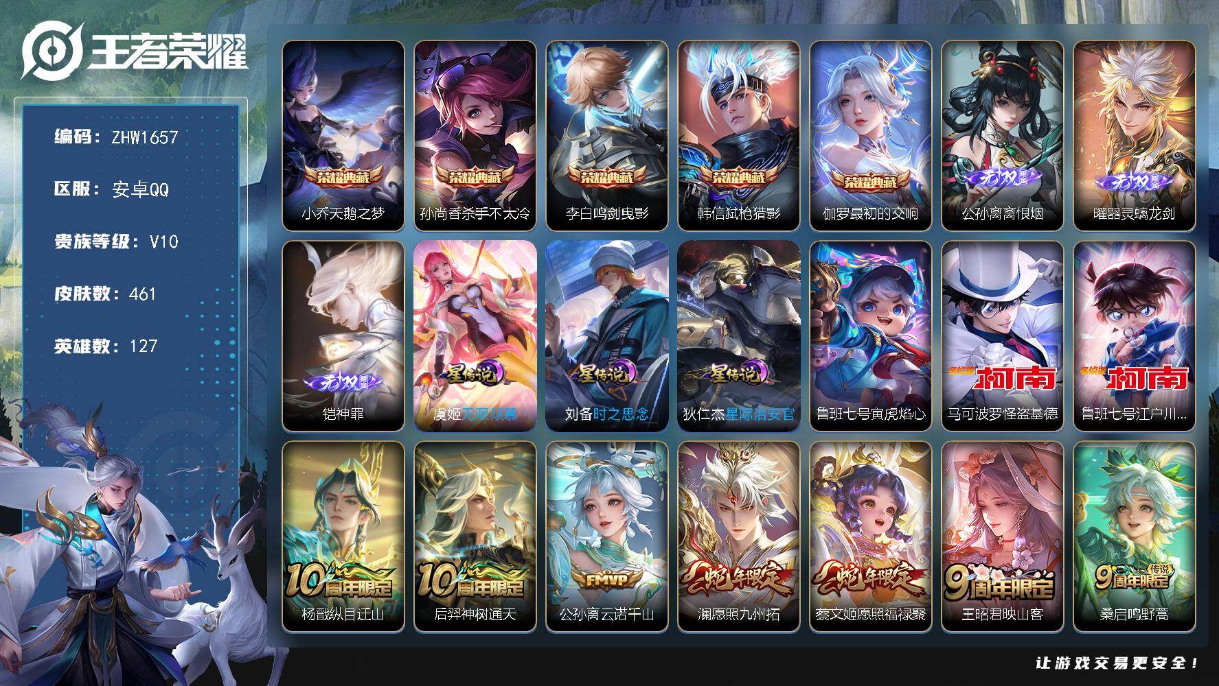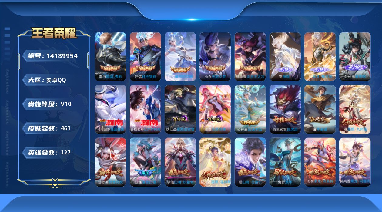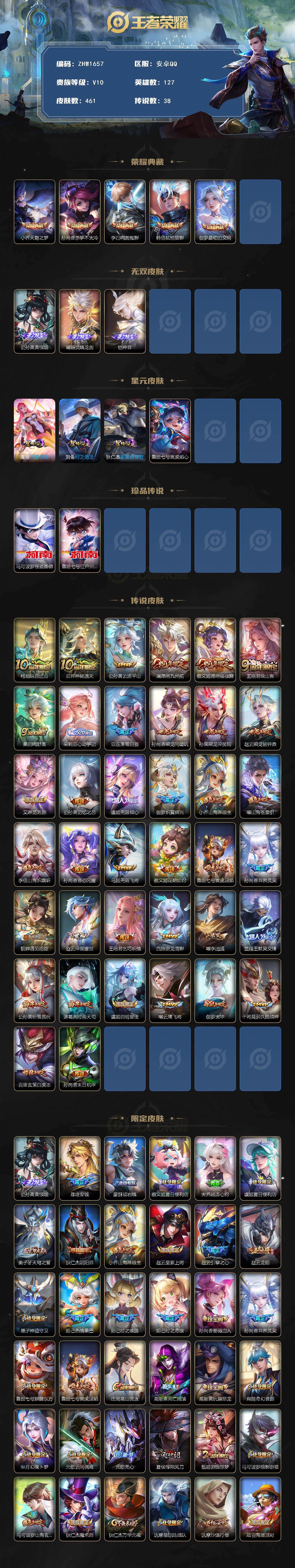 [14189954]【店主推荐捡漏号!可直接换绑】安卓Q-V10-最强王者段位-127英雄-461皮肤-5典藏皮肤-3无双-2珍品传说-38传说-152史诗