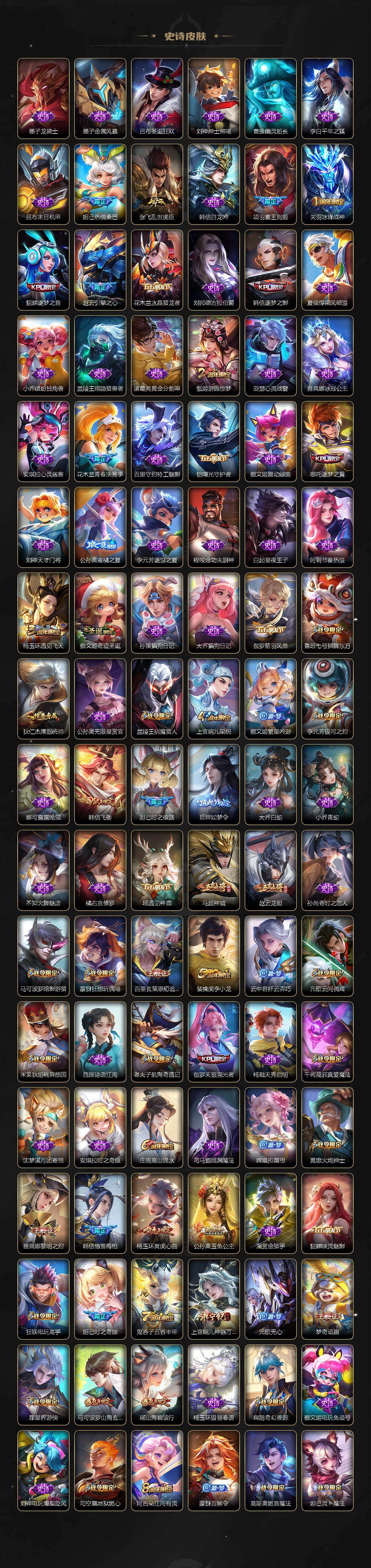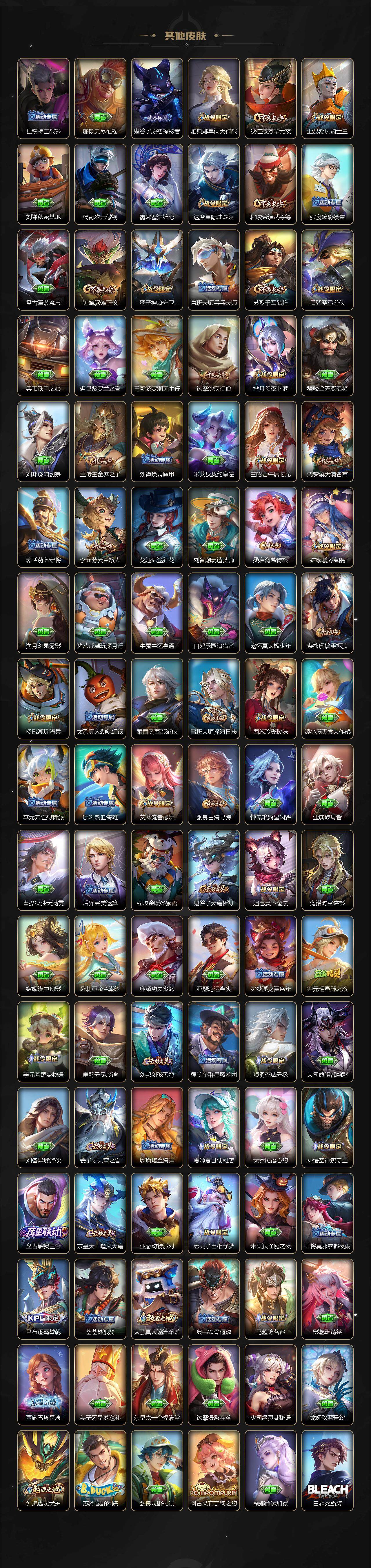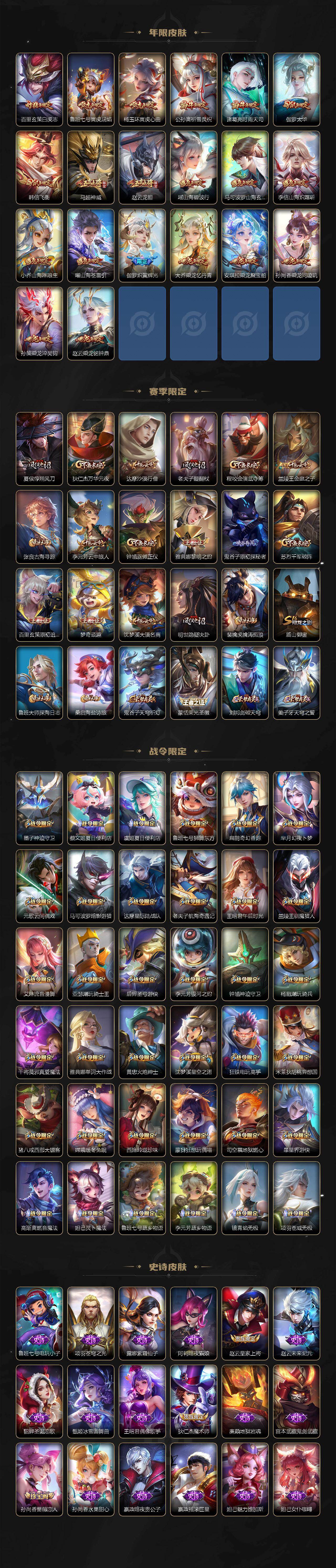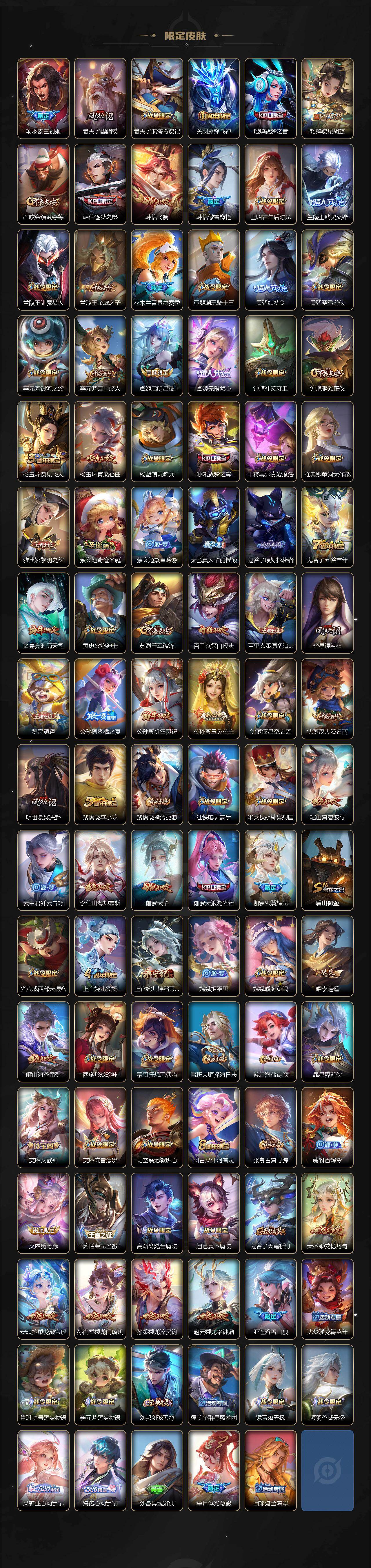 【限定皮肤】:公孙离离恨烟,暃埋骨钱,蒙犽顽岩魄,蔡文姬夏日便利店,大乔绒语心约,虞姬夏日便利店,姜子牙天穹之誓,狄仁杰阴阳师,小乔山海琳琅生,赵云皇家上将,赵云引擎之心,赵云龙胆,墨子神迹守卫,妲己热情桑巴,妲己时之彼端,妲己时之奇旅,孙尚香蔷薇恋人,孙尚香异界灵契,鲁班七号狮舞东方,鲁班七号寅虎瑞焰,庄周高山流水,高渐离死亡摇滚,高渐离玩趣恶龙,扁鹊奇幻香踪,芈月幻夜卜梦,元歌云间偶戏,元歌无心,夏侯惇朔风刀,甄姬游园惊梦,马可波罗暗影游猎,马可波罗山海玄木吟,狄仁杰魔术师,狄仁杰万华元夜,达摩星际陆战队,达摩沙漠行僧,项羽海滩派对,项羽霸王别姬,老夫子醍醐杖,老夫子航海奇遇记,关羽冰锋战神,貂蝉逐梦之音,貂蝉遇见胡旋,程咬金演武夺筹,韩信逐梦之影,韩信飞衡,韩信傲雪梅枪,王昭君午后时光,兰陵王默契交锋,兰陵王驯魔猎人,兰陵王金庭之子,花木兰青春决赛季,亚瑟潮玩骑士王,后羿如梦令,后羿圣弓游侠,李元芳银河之约,李元芳云中旅人,虞姬启明星使,虞姬无限倾心,钟馗神迹守卫,钟馗驱傩正仪,杨玉环遇见飞天,杨玉环寅虎心曲,杨戬潮玩骑兵,哪吒逐梦之翼,干将莫邪真