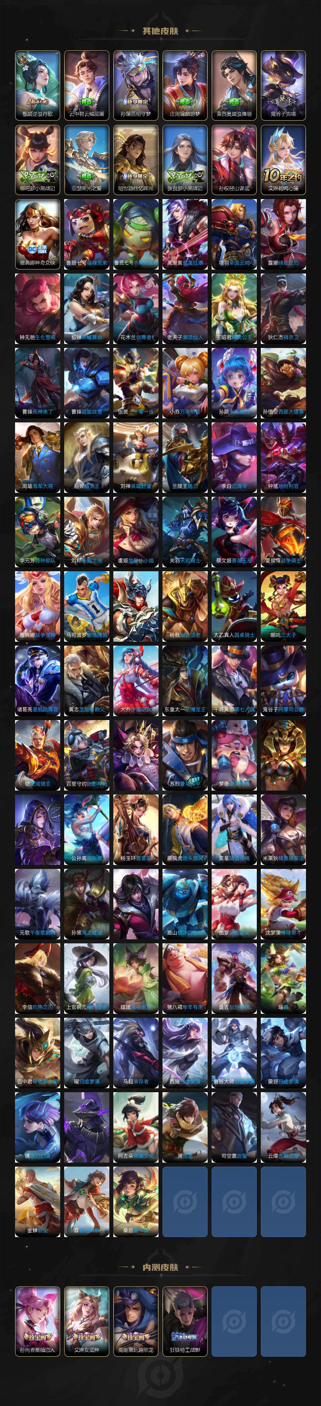 关羽冰锋战神,裴擒虎李小龙,上官婉儿梁祝,貂蝉逐梦之音,公孙离祈雪灵祝,诸葛亮时雨天司,赵云龙胆,马超神威,韩信飞衡,伽罗太华,伽罗天狼溯光者,哪吒逐梦之翼,韩信逐梦之影,百里玄策白虎志,项羽霸王别姬,兰陵王默契交锋,后羿如梦令,雅典娜神奇女侠,妲己热情桑巴,花木兰青春决赛季,蔡文姬奇迹圣诞,妲己时之彼端,公孙离蜜橘之夏,赵云引擎之心,孙尚香异界灵契,韩信傲雪梅枪,鲁班七号寅虎·瑞焰,杨玉环寅虎·心曲,公孙离玉兔公主,妲己时之奇旅,上官婉儿神器·万象笔,马可波罗山海·玄木吟,瑶山海·碧波行,桑启鸣野蒿,艾琳陌上桑,王昭君映山客,澜愿照·九州拓,蔡文姬愿照·福禄聚