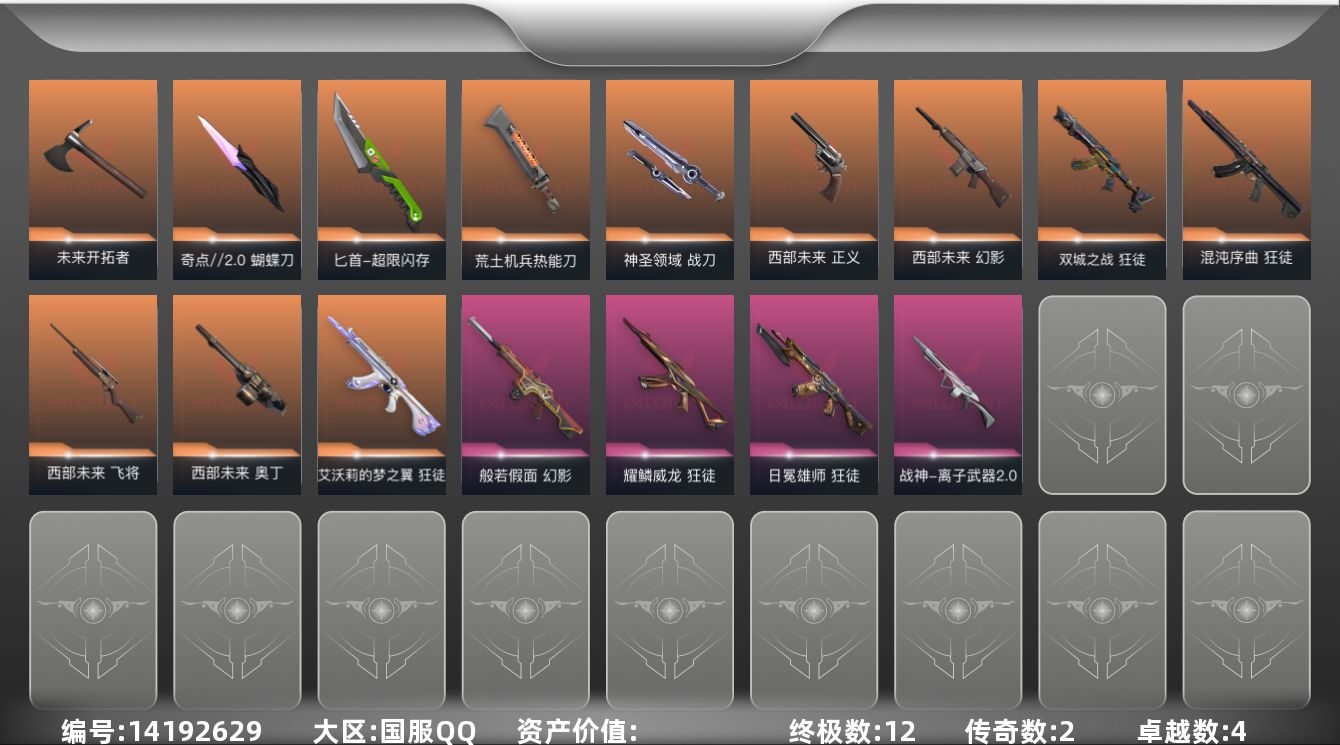 [14192629]【套装】:西部未来套装 【英雄】:幻棱,炼狱,维斯,暮蝶,钛狐,壹决,铁臂,捷风,雷兹,幽影,不死鸟,贤者,猎枭,蝰蛇,零,芮娜,奇乐,尚勃勒,霓虹,斯凯,夜露,星礈,K/O,海神,盖可,黑梦,钢锁 【近战 武器】:近战武器-奇点//2.0 蝴蝶刀,近战武器-未来开拓者,近战武器-超限闪存 匕首,近战武器-荒土机兵 热能刀,近战武器-神圣领域 战刀 【狂徒】:狂徒-艾沃莉的梦之翼,狂徒-混沌序曲,狂徒-双城之战,狂徒-日冕雄师,狂徒-耀鳞威龙,狂徒-荒土机兵 【幻影】:幻影-西部未来,幻影-ORA x 颗秒,幻影-般若假面,幻影-超限闪存,幻影-神圣领域,幻影-纳米打击,幻影-西部未来 【戍卫】:戍卫-浮光跃金,戍卫-逆冲蛮牛,戍卫-月球哨兵 【獠犬】:獠犬-神圣领域,獠犬-模拟赫兹,獠犬-逆冲蛮牛 【冥驹】:冥驹-荒土机兵,冥驹-模拟赫兹,冥驹-星云暗涌 【飞将】:飞将-西部未来 【莽侠】:莽侠-超限闪存,莽侠-月球哨兵 【战神】:战神-离子武器//2.0,战神-神圣领域,战神-浮光跃金 【奥丁】:奥丁-西部未来,奥丁-纳米打击 【判官】:判官-纳米打击x 【雄鹿】:雄鹿-模拟赫兹,雄鹿-逆冲蛮牛,雄鹿-月球哨兵 【骇灵】:骇灵-荒土机兵,骇灵-浮光跃金,骇灵-星云暗涌 【蜂刺】:蜂刺-超限闪存,蜂刺-星云暗涌 【标配】:标配-荒土机兵,标配-浮光跃金 【正义】:正义-西部未来,正义-超限闪存,正义-纳米打击,正义-月球哨兵 【鬼魅】:鬼魅-模拟赫兹,鬼魅-星云暗涌 【狂怒】:狂怒-神圣领域,狂怒-火线狂怒,狂怒-逆冲蛮牛 【卡面】:终章:激斗汉堡 卡面,进入射程 卡面,分崩离析 卡面,纳米打击 卡面,抑制技术 卡面,激斗汉堡 卡面,瓦娃脸雪糕 P2 卡面,从黄昏到黎明 卡面,荒土机兵 卡面,银弹猎手 卡面,逆冲蛮牛 卡面,《双城之战》拥抱 卡面,精灵大战 卡面,欢迎来到底城 卡面,南瓜盛典 卡面,唱片的故事 卡面,钢弓与箭弦 卡面,排除故障 卡面,战术桌游 卡面,悠享食光 卡面,修车达人 卡面,热舞环节 卡面,模拟赫兹 卡面,浮光跃金 卡面,超限闪存 卡面,维斯工牌 卡面,正义的化身 卡面,时间到 卡面,最高舞台 卡面,声感陷阱设计图 卡面,红鳞松叶 卡面,梦幻奶茶 卡面,无畏契约GO!第一卷:芮娜 卡面,无畏契约GO!第一卷:零 卡面,《双城之战》金克丝 卡