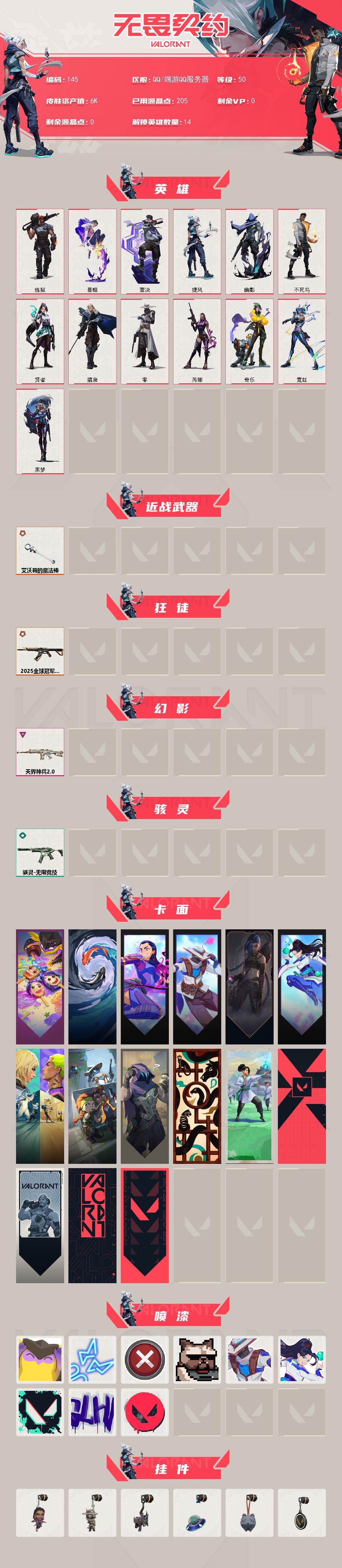 [14193375]【英雄】:炼狱,暮蝶,壹决,捷风,幽影,不死鸟,贤者,猎枭,零,芮娜,奇乐,霓虹,黑梦 【近战 武器】:近战武器-艾沃莉的魔法棒 【狂徒】:狂徒-2025全球冠军赛 【幻影】:幻影-天界神兵//2.0 【骇灵】:骇灵-无限竞技 【卡面】:瓦娃脸雪糕 P2 卡面,红鳞松叶 卡面,无畏契约GO!第一卷:芮娜 卡面,无畏契约GO!第一卷:零 卡面,《双城之战》金克丝 卡面,无畏契约GO!第一卷:贤者 卡面,钢锁vs盖可 卡面,别冒尖 卡面,黑影先生的咖啡! 卡面,萌彩剪影 卡面,夯实根基 卡面,代号红色 卡面,新兵报到 卡面,V契约 卡面,无畏契约 卡面 【喷漆】:皮蛋萌舞 喷漆,霓光四射 喷漆,买装还是存钱 喷漆,关门放狗 喷漆,无畏契约GO!第一卷:零 喷漆,无畏契约GO!第一卷:贤者 喷漆,胜利属于无畏契约 喷漆,GLHF 喷漆,无畏契约 喷漆 【挂饰】:无畏契约GO!第一卷 芮娜 挂饰,无畏契约GO!第一卷 零 挂饰,鱼骨头 挂饰,天外飞客 挂饰,《双城之战》魄罗 挂饰,无畏契约 纪念币 挂饰