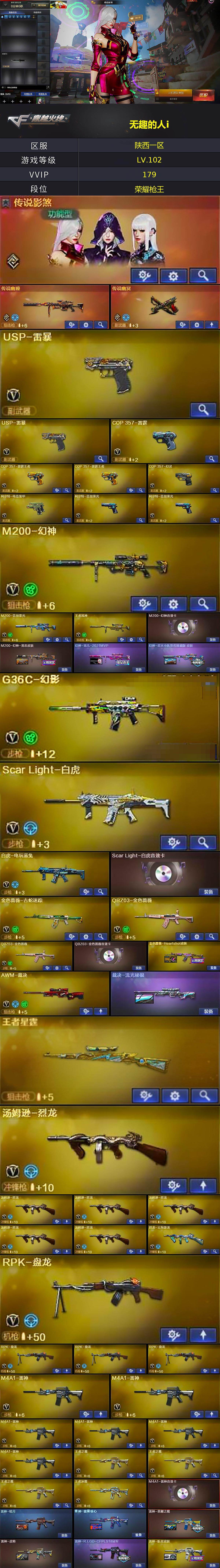 【热门武器】:传说幽瞳,传说幽冥,G36C-幻影,QBZ03-金色蔷薇*2,Scar Light-白虎,M4A1-青龙,M200-幻神,金色蔷薇-古蛇迷踪,修罗-古蛇迷踪,M200-竞技荣光,死亡之眼,白虎-电玩蓝兔,C.A.T,炼狱-迷你小钢,毒蜂,M4A1-黑骑士*3,汤姆逊-烈龙*6,RPK-盘龙*4,加特林-炼狱*3,斯泰尔-蝴蝶,火麒麟-绝迹,USP-雷暴*2,COP 357-幻灵,沙鹰-修罗*6,炽芒蝶刃