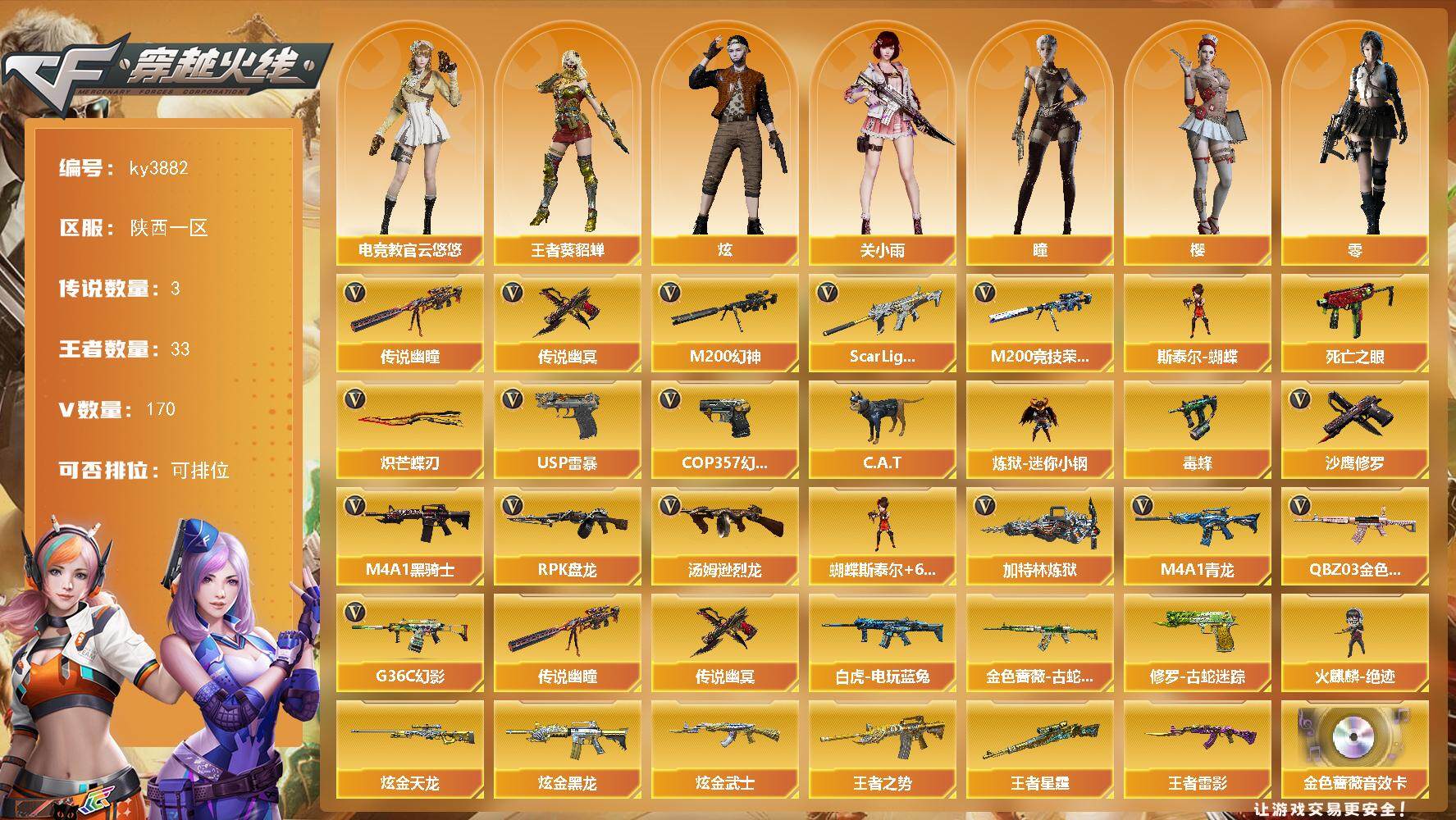 [14196092]陕西一区-170V-33王者-4炫金 【传说武器】:传说幽瞳,传说幽冥 【传说角色】:传说影煞 【热门武器】:传说幽瞳,传说幽冥,G36C-幻影,QBZ03-金色蔷薇*2,Scar Light-白虎,M4A1-青龙,M200-幻神,金色蔷薇-古蛇迷踪,修罗-古蛇迷踪,M200-竞技荣光,死亡之眼,白虎-电玩蓝兔,C.A.T,炼狱-迷你小钢,毒蜂,M4A1-黑骑士*3,汤姆逊-烈龙*6,RPK-盘龙*4,加特林-炼狱*3,斯泰尔-蝴蝶,火麒麟-绝迹,USP-雷暴*2,COP 357-幻灵,沙鹰-修罗*6,炽芒蝶刃 【王者炫金武器】:王者之势,王者雷影,王者星霆,炫金黑龙,炫金武士,炫金天龙*2 【音效卡】:黑龙-古蛇迷踪音效卡,M200-幻神音效卡,AK47-火麒麟音效卡,M4A1-雷神音效卡,M4A1-黑龙音效卡,M4A1-黑骑士音效卡,Barrett-毁灭音效卡,Barrett-极光音效卡,QBZ03-金色蔷薇音效卡,Scar Light-白虎音效卡,M14EBR-玄武音效卡,Barrett-碧霄极光音效卡*3 【皮肤】:M200-幻神-黄忠皮肤,幻神-宠儿-2021MVP,幻神-星火小队签名臻藏版 皮肤,金色蔷薇-Heartshot皮肤,裁决-流光秘银,雷神-暗月,雷神-能量核心,雷神-荣耀之魄,雷神-虎将,雷神-R.LGD-CFPLS18冠军,雷神-航星皮肤,火麒麟-雷神,火麒麟-平天大圣,火麒麟-心动糖果,毁灭-暗月,毁灭-星空,黑龙-冠军之武,黑骑士-暗月*2,黑骑士-冠军之势,无影-能量核心,死神-机甲核心皮肤,玫瑰精灵-粉色浪漫 皮肤,天龙-秘银,AWM-天龙-传奇白鲨,修罗-能量核心*2,修罗-冠军之魂,屠龙-星火燎原,屠龙-春桃 皮肤,龙啸-冠军之啸,擎天-冠军之击,擎天-蒸汽钟表 皮肤 【角色】:零,樱,瞳,炫,电竞教官-云悠悠,关小雨,王者-葵-貂蝉,王者云悠悠,王者岚兮儿,蛇隐宗,奇洋探员,修道士,云海玲珑,北极狐-X,初恋灵狐,电竞少女,芳心审判者,嘉年华灵狐,兰妹妹,零-水下丽影,灵狐-花神,灵狐者-黄金海岸,龙儿-小淘气,潘多拉-X,潘多拉-甜心教官,蛇姬,斯沃特-X,铁骑荣耀,五号兵器-赛博朋克,夜玫瑰-幻能朋克,幽 【人偶武器】:火麒麟-绝迹,火麒麟-灵狐,炼狱-迷你小钢,斯泰尔-蝴蝶,Scar Light-马枪,AWM-灵狐-1