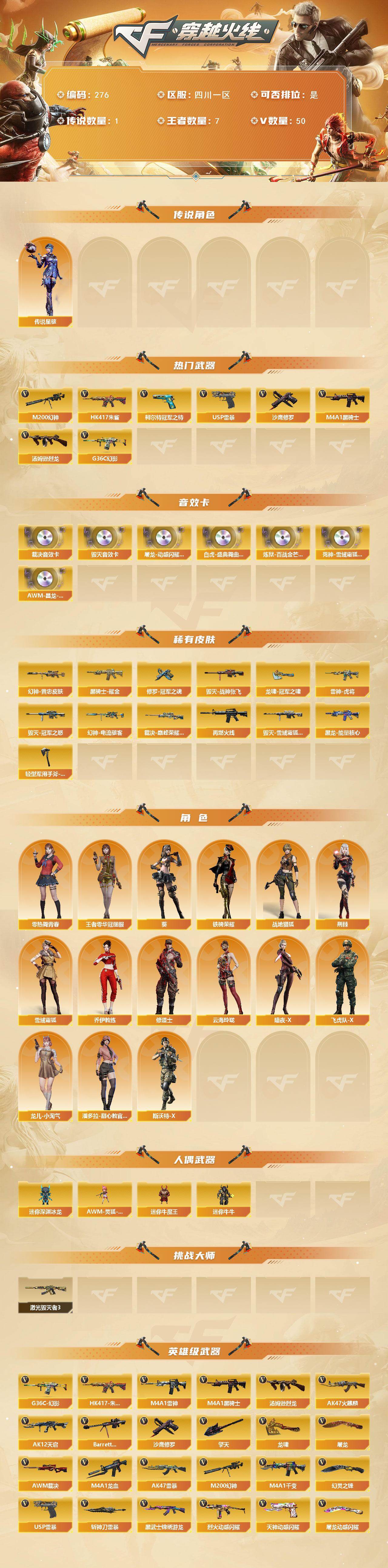 [14198382]四川一区-50V-7王者-0炫金 【传说角色】:传说星骇 【热门武器】:G36C-幻影,HK417-朱雀,M200-幻神,柯尔特-冠军之特,M4A1-黑骑士,汤姆逊-烈龙,USP-雷暴,沙鹰-修罗 【音效卡】:屠龙-动感闪耀 音效卡,Barrett-毁灭音效卡,AWM-裁决音效卡,白虎-盛典舞曲音效卡,炼狱-百战金芒-庆典舞曲音效卡,死神-雪域霜狐-怀旧音效卡,AWM-昌龙-怀旧音效卡 【皮肤】:M200-幻神-黄忠皮肤,幻神-电流骇客 皮肤,裁决-巅峰荣耀 皮肤,雷神-虎将,M4A1-再燃火线,毁灭-冠军之怒,毁灭-战神张飞,毁灭-雪域霜狐 皮肤,黑龙-能量核心,黑骑士耀金皮肤,修罗-冠军之魂,龙啸-冠军之啸,轻型军用手斧-再燃火线 【角色】:葵,荆棘,战地猎狐,王者零-华冠丽服,雪域霜狐,乔伊教练,修道士,云海玲珑,暗夜-X,飞虎队-X,零-热舞青春,龙儿-小淘气,潘多拉-甜心教官,斯沃特-X,铁骑荣耀 【人偶武器】:AWM-灵狐-15周年嘉年华,迷你深渊冰龙,迷你牛魔王,迷你牛牛 【挑战大师】:激光毁灭者III 【英雄级武器】:M4A1-千变*3,AK47-火麒麟,M4A1-雷神,M4A1-黑骑士,AK12-天启,M4A1-龙血,AK47-雷暴,HK417-朱雀,G36C-幻影,黑武士-锦绣游龙,死神-雪域霜狐,SCAR Light-玄豹,烈火-动感闪耀,王者之魄-觉醒版,Barrett-毁灭,AWM-裁决,M200-幻神,王者风神-觉醒版,炼狱-百战金芒,汤姆逊-烈龙,沙鹰-修罗,USP-雷暴,柯尔特-冠军之特,柯尔特-荣耀世冠EP,天神-动感闪耀,屠龙,龙啸,擎天,幻灵之锋,屠龙-动感闪耀,斩神刀-雷暴,麒麟刺-百战金芒,王者之锋-觉醒版,王者之啸-觉醒版,王者之击-觉醒版,丛林匕首-玄豹,高爆手雷-幻灵,手雷-动感闪耀,高爆手雷-玄豹*2,闪光弹-玄豹*2,烟雾弹-竞技荣光,烟雾弹-玄豹*2,M4A1-赤狱骑士,M4A1-苍鸣雷神,AWM-昌龙 【道具】:BS战队炫彩背包,EP战队炫彩背包,亚洲杯纪念炫彩背包,全能枪王背包,炫彩背包,百战金芒炫彩背包,雪域霜狐炫彩背包,哔哩哔哩名片,女皇终结者-魔龙之吻,救世主-黑桃战神,绿色巨人,灵魂忍者,迷雾幽灵,夺命之镰,防化服*3,金色流光-枪王排位*2,星辰流光-枪王排位,流光-再燃火线,枪王排位28赛季金色