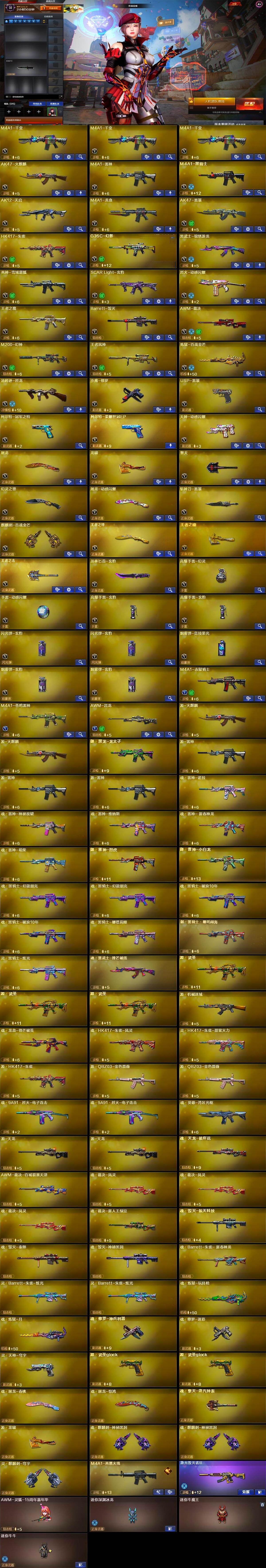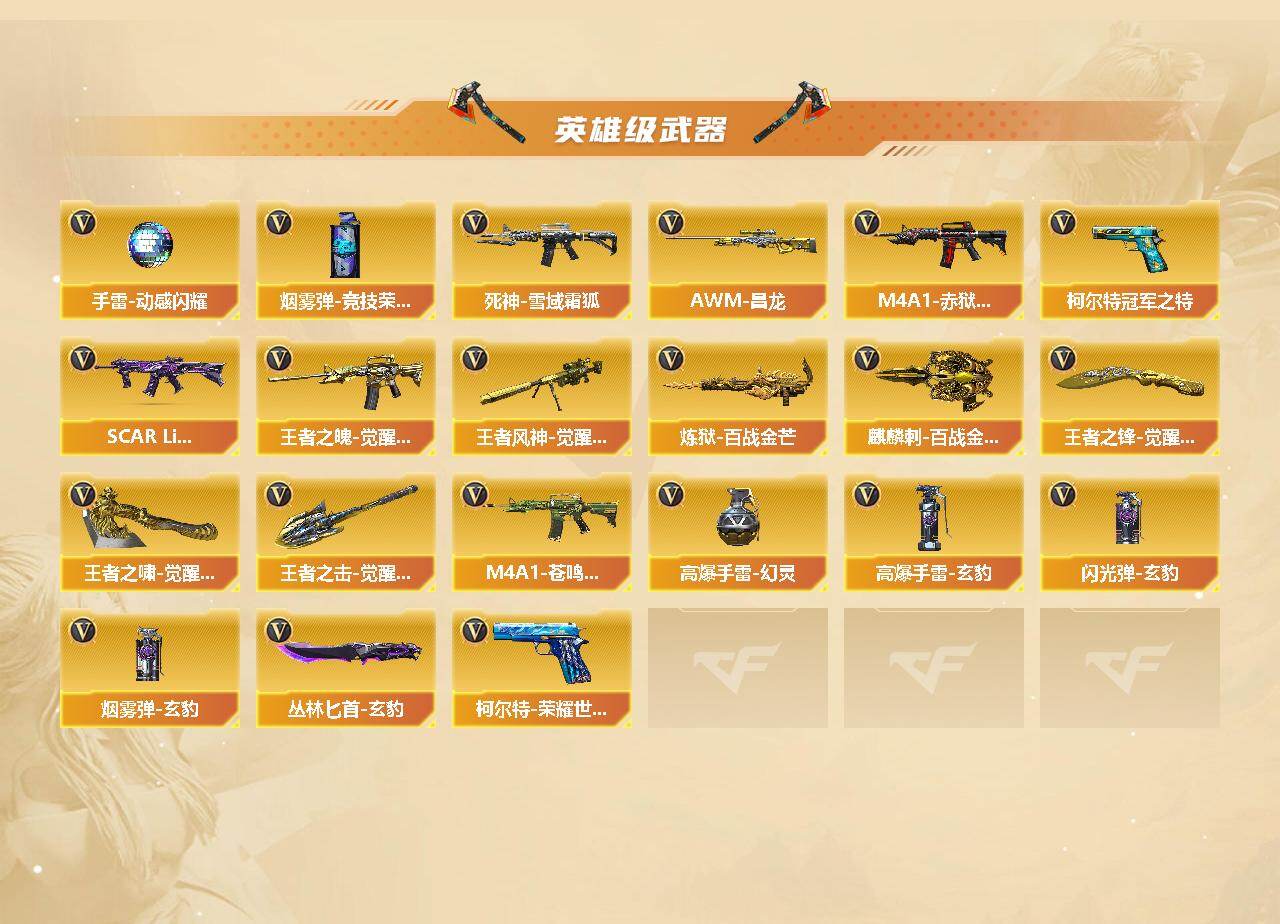 【英雄级武器】:M4A1-千变*3,AK47-火麒麟,M4A1-雷神,M4A1-黑骑士,AK12-天启,M4A1-龙血,AK47-雷暴,HK417-朱雀,G36C-幻影,黑武士-锦绣游龙,死神-雪域霜狐,SCAR Light-玄豹,烈火-动感闪耀,王者之魄-觉醒版,Barrett-毁灭,AWM-裁决,M200-幻神,王者风神-觉醒版,炼狱-百战金芒,汤姆逊-烈龙,沙鹰-修罗,USP-雷暴,柯尔特-冠军之特,柯尔特-荣耀世冠EP,天神-动感闪耀,屠龙,龙啸,擎天,幻灵之锋,屠龙-动感闪耀,斩神刀-雷暴,麒麟刺-百战金芒,王者之锋-觉醒版,王者之啸-觉醒版,王者之击-觉醒版,丛林匕首-玄豹,高爆手雷-幻灵,手雷-动感闪耀,高爆手雷-玄豹*2,闪光弹-玄豹*2,烟雾弹-竞技荣光,烟雾弹-玄豹*2,M4A1-赤狱骑士,M4A1-苍鸣雷神,AWM-昌龙