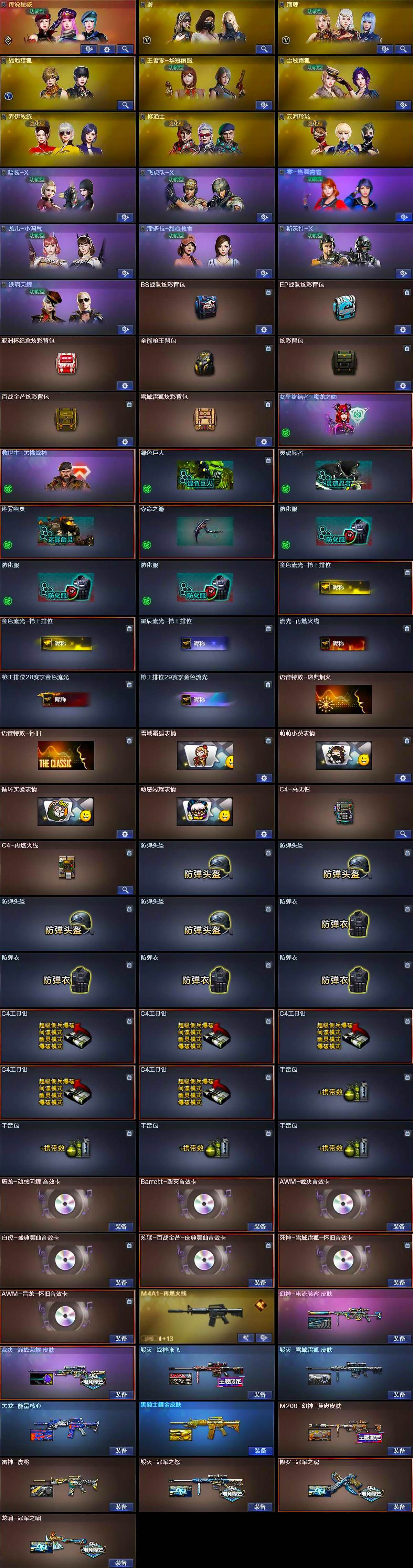 【道具】:BS战队炫彩背包,EP战队炫彩背包,亚洲杯纪念炫彩背包,全能枪王背包,炫彩背包,百战金芒炫彩背包,雪域霜狐炫彩背包,哔哩哔哩名片,女皇终结者-魔龙之吻,救世主-黑桃战神,绿色巨人,灵魂忍者,迷雾幽灵,夺命之镰,防化服*3,金色流光-枪王排位*2,星辰流光-枪王排位,流光-再燃火线,枪王排位28赛季金色