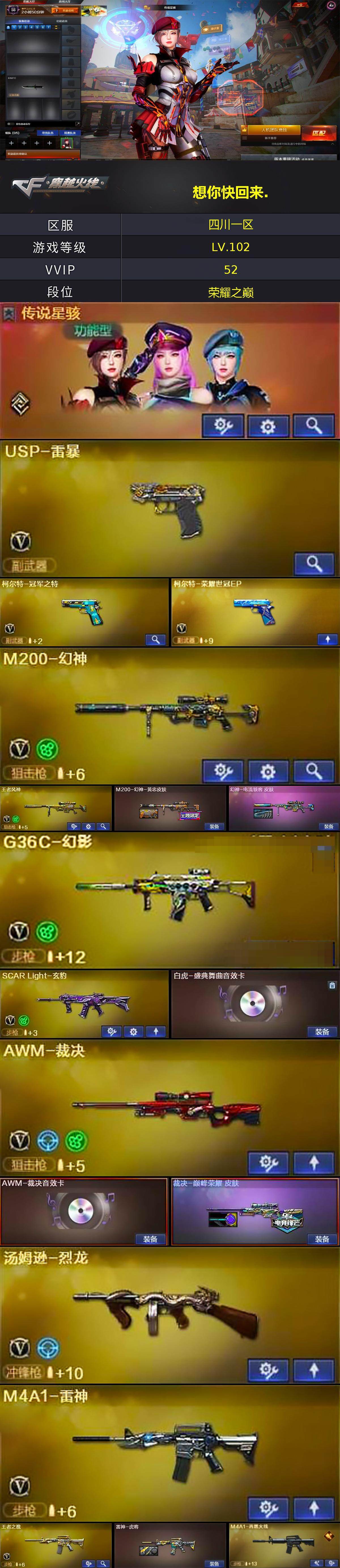 - [14305600]四川一区-22V-15王者-0炫金 【热门武器】:QBZ03-金色蔷薇,M200-幻神,金色蔷薇-古蛇迷踪,修罗-古蛇迷踪,死亡之眼,荣耀世冠-火麒麟,Cat-刀锋,加特林-炼狱*2,沙鹰-修罗*2 【王者炫金武器】:王者火魄,王者之锋,王者之魄高爆手雷*4,王者之魄闪光弹*4,王者之魄烟雾弹 【皮肤】:雷神-暗月,雷神-宠儿-2019MVP,雷神-烈虎皮肤,雷神-化蛇 皮肤,火麒麟-轻羽皮肤,火麒麟-平天大圣,火麒麟-百城,毁灭-黑大圣皮肤,M4A1-千变-孔明皮肤,修罗-能量核心 【角色】:葵,战地猎狐,蛇隐宗,炽天使,暗夜-X,电竞少女,飞虎队-X,娟娟,0号玩家,灵狐-花神,灵狐者-黄金海岸,灵狐者-七夕宝贝,灵狐者-职业经理,麻雀,萌儿,潘多拉-甜心教官,蛇姬,斯沃特-X,蜀雪,兔囡囡,雪莉杨-摸金校尉,职业选手 【人偶武器】:Cat-刀锋,生化手雷-机甲核心*2 【暴走生化】:死亡之眼 【挑战大师】:AK47-冰龙粉碎者,激光毁灭者III-白马银枪,激光毁灭者III 【英雄级武器】:M4A1-雷神,AN94-超新星,黑武士-锦绣游龙,金色蔷薇-古蛇迷踪,QBZ03-金色蔷薇,王者之心-觉醒版,王者之魄-觉醒版,王者冰魄-觉醒版,荣耀世冠-火麒麟,Barrett-毁灭,M200-幻神,加特林-炼狱*2,沙鹰-修罗*2,修罗-古蛇迷踪,屠龙,王者之锋-觉醒版,高爆手雷-幻灵*2,高爆手雷-竞技荣光,高爆手雷-古蛇迷踪,闪光弹-幻灵,闪光弹-竞技荣光,闪光弹-云龙,烟雾弹-幻灵,烟雾弹-竞技荣光,烟雾弹-古蛇迷踪,M4A1-赤狱骑士,AWM-昌龙 【道具】:CFS限定背包,XROCK炫彩背包,古蛇迷踪炫彩背包,超级背包,救世主-黑桃战神,绿色巨人,灵魂忍者,迷雾幽灵,夺命之镰,防化服*2,星辰流光-枪王排位,流光-再燃火线,枪王排位28赛季金色流光,枪王排位29赛季金色流光,古蛇迷踪打击特效,蛇隐宗表情,EP战队名片,EP战队喷图,EP战队击杀图标,防弹头盔*4,防弹衣*4,C4工具钳*4,手雷包*4 【特殊枪械】:2炼狱