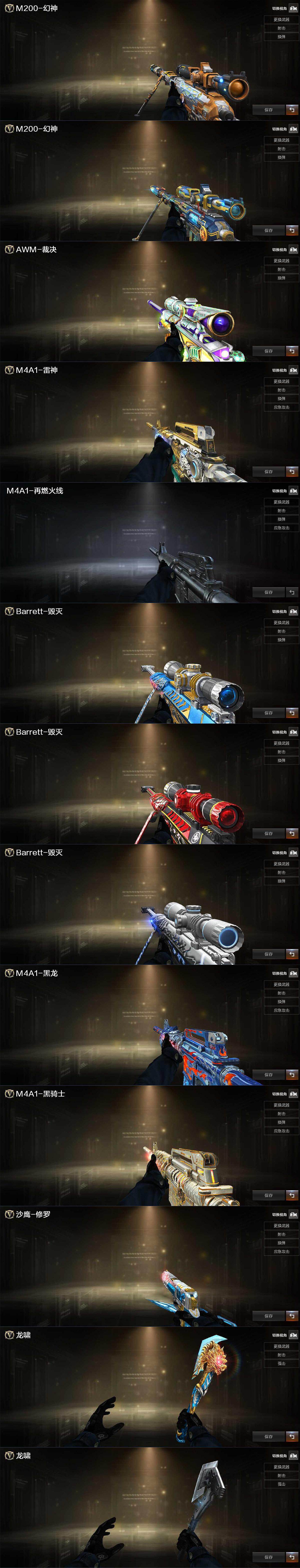 【皮肤】:M200-幻神-黄忠皮肤,幻神-电流骇客 皮肤,裁决-巅峰荣耀 皮肤,雷神-虎将,M4A1-再燃火线,毁灭-冠军之怒,毁灭-战神张飞,毁灭-雪域霜狐 皮肤,黑龙-能量核心,黑骑士耀金皮肤,修罗-冠军之魂,龙啸-冠军之啸,轻型军用手斧-再燃火线