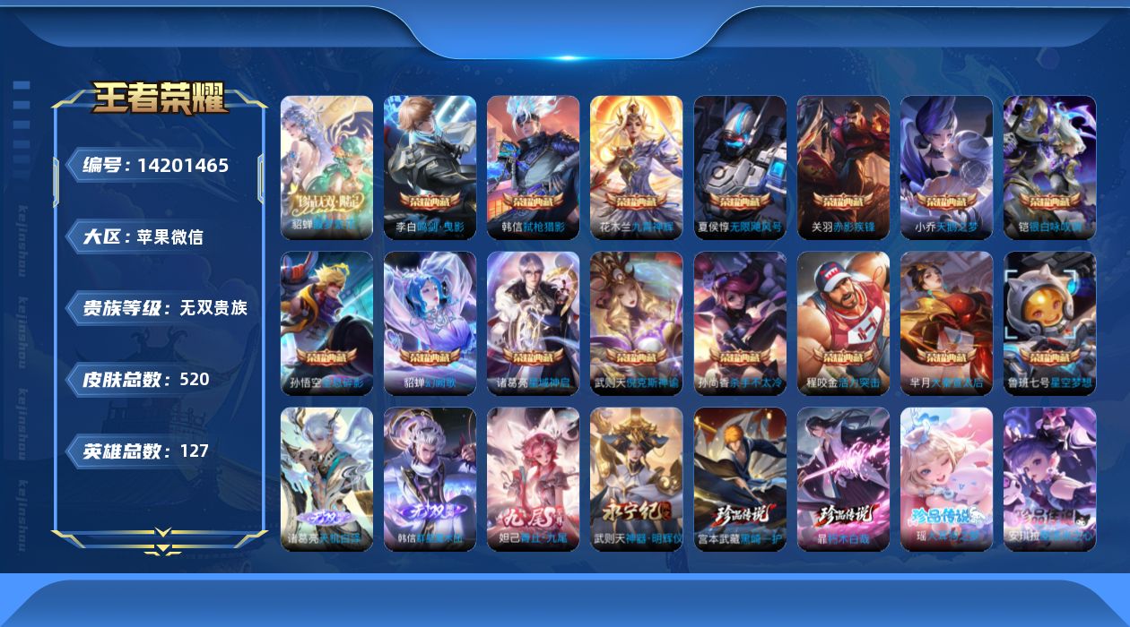 [14201465]背包多一水,金标婉儿,海洛,苹果WX-V11-520皮肤-15典藏皮肤-1典藏英雄-1珍品无双-4无双-5珍品传说-64传说-182史诗