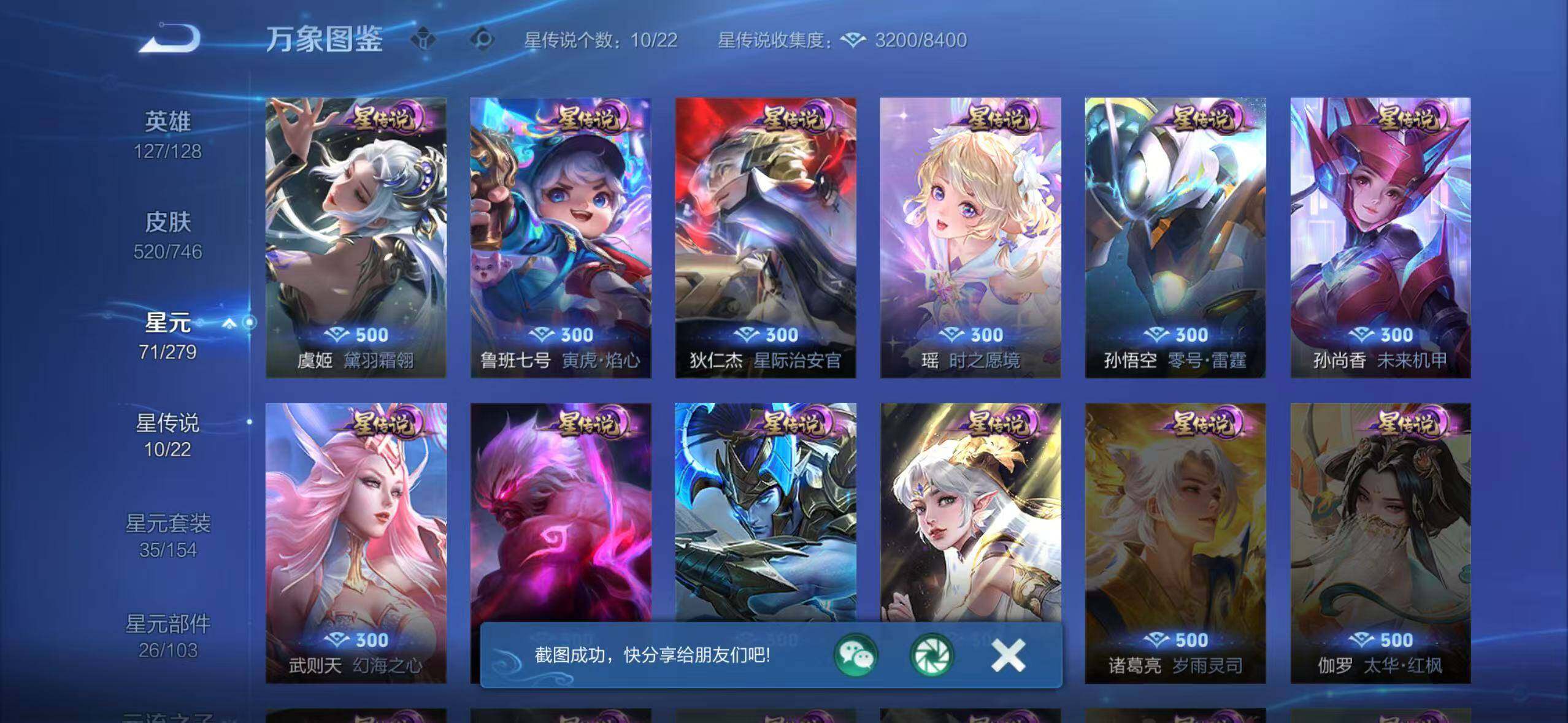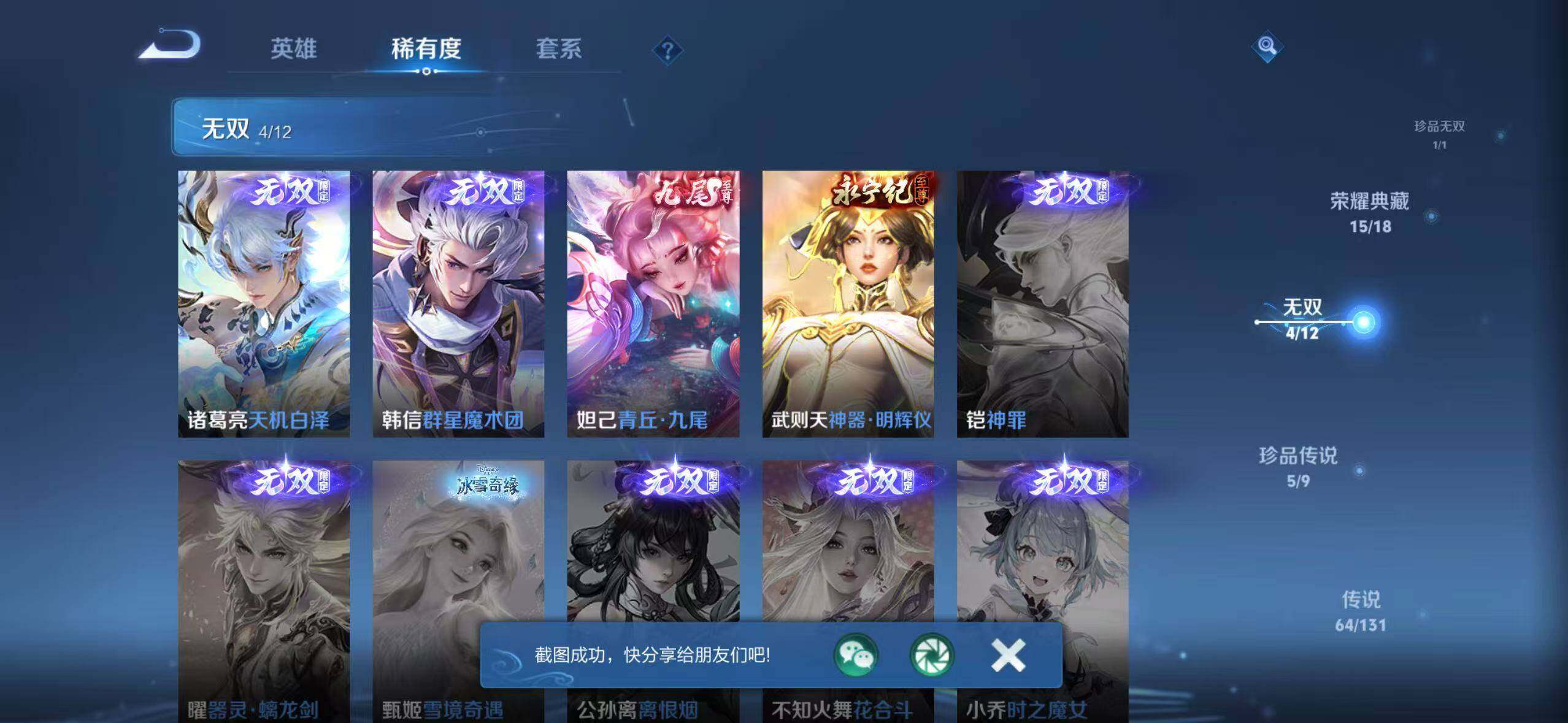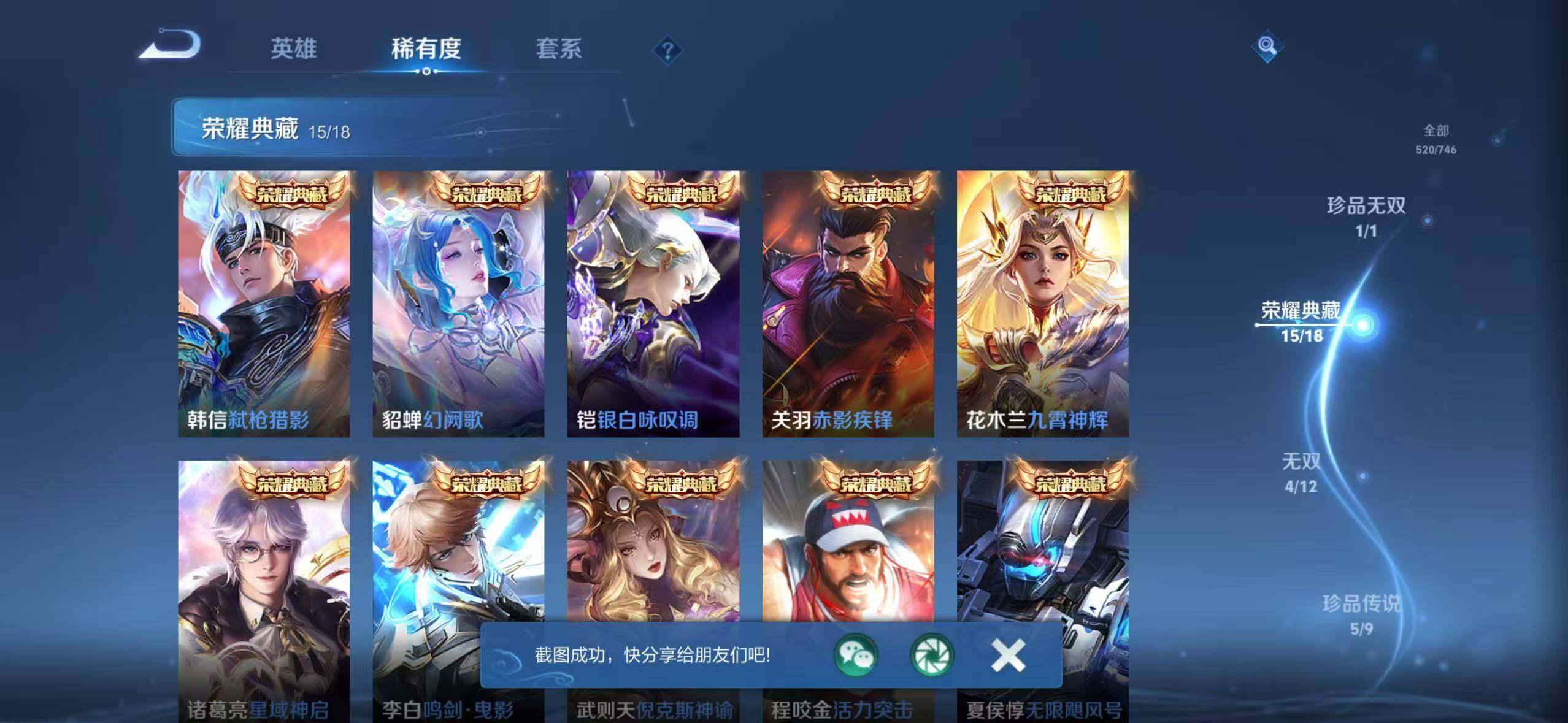 【荣耀典藏】:武则天英雄,孙悟空全息碎影,武则天倪克斯神谕,夏侯惇无限飓风号,小乔天鹅之梦,孙尚香杀手不太冷,鲁班七号星空梦想,芈月大秦宣太后,程咬金活力突击,李白鸣剑曳影,诸葛亮星域神启,花木兰九霄神辉,关羽赤影疾锋,铠银白咏叹调,貂蝉幻阙歌,韩信弑枪猎影