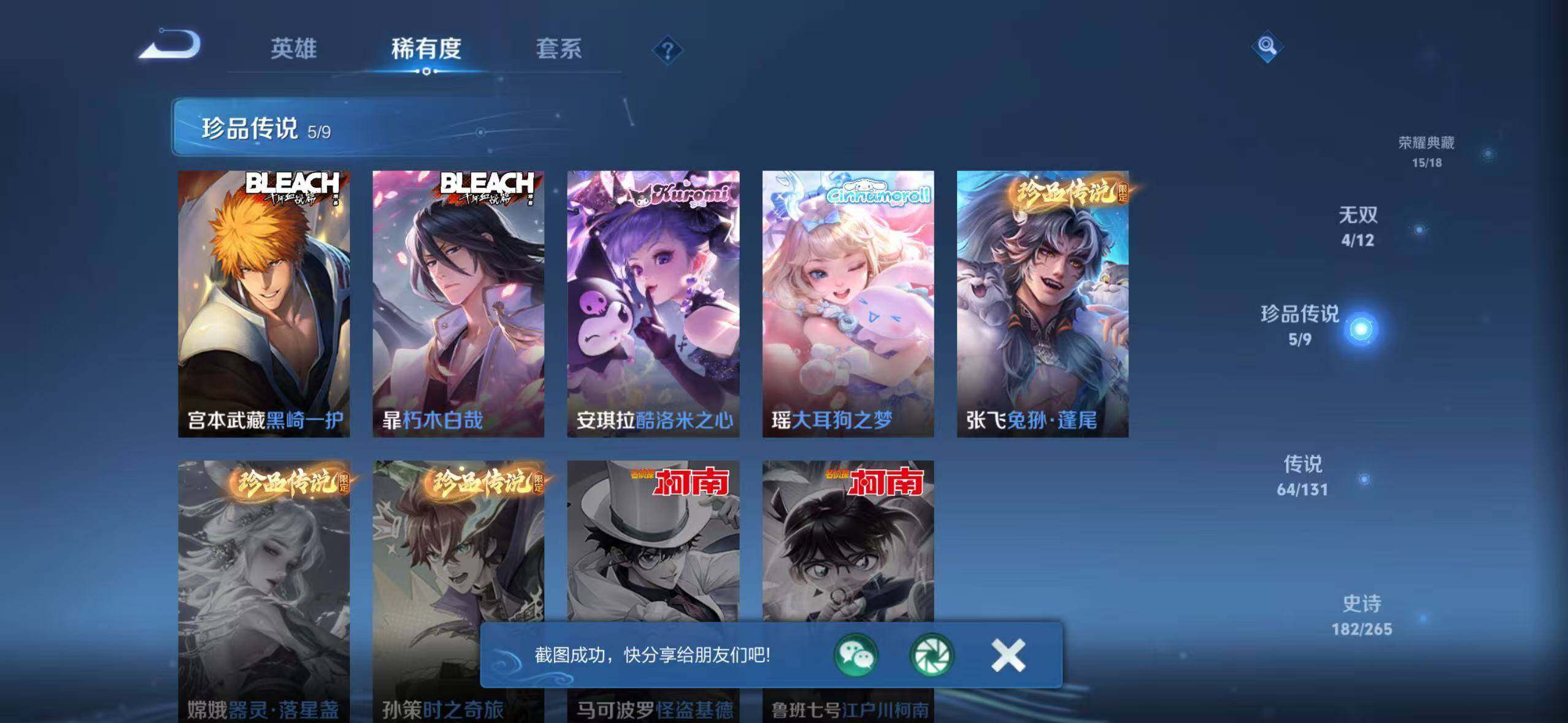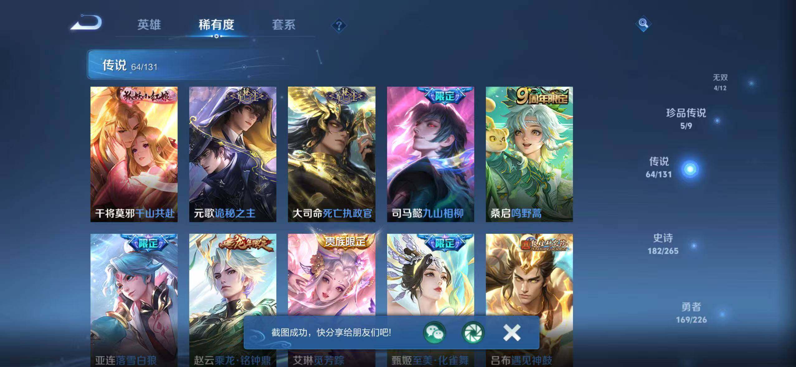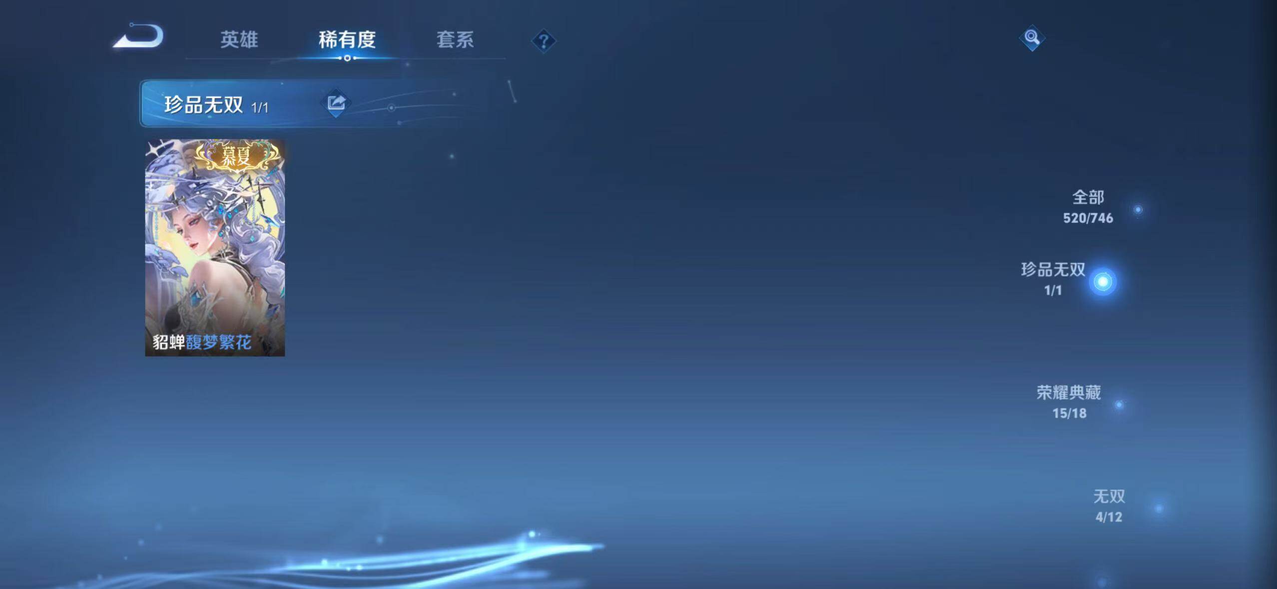 【荣耀典藏】:武则天英雄,孙悟空全息碎影,武则天倪克斯神谕,夏侯惇无限飓风号,小乔天鹅之梦,孙尚香杀手不太冷,鲁班七号星空梦想,芈月大秦宣太后,程咬金活力突击,李白鸣剑曳影,诸葛亮星域神启,花木兰九霄神辉,关羽赤影疾锋,铠银白咏叹调,貂蝉幻阙歌,韩信弑枪猎影