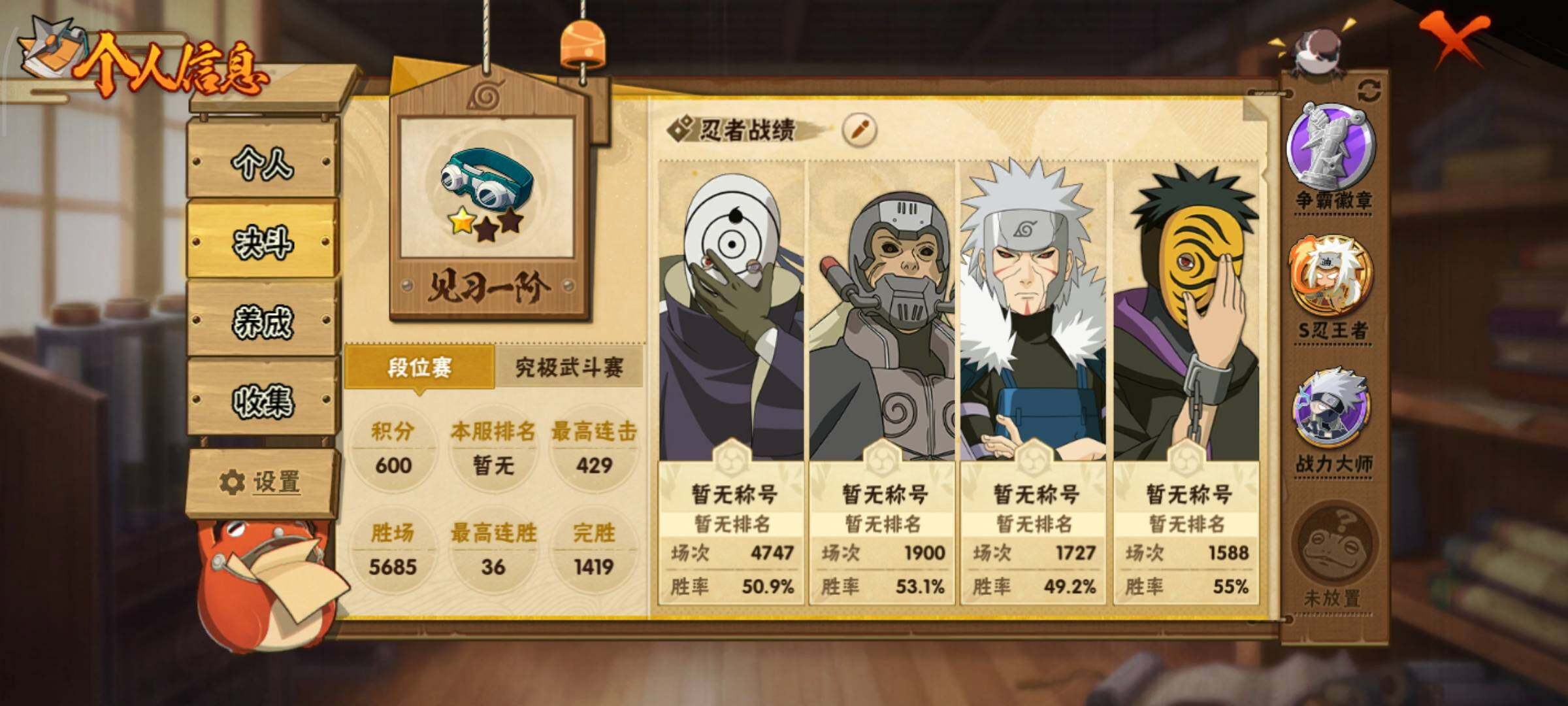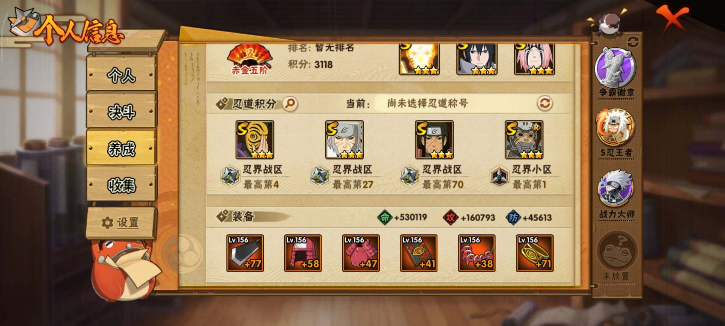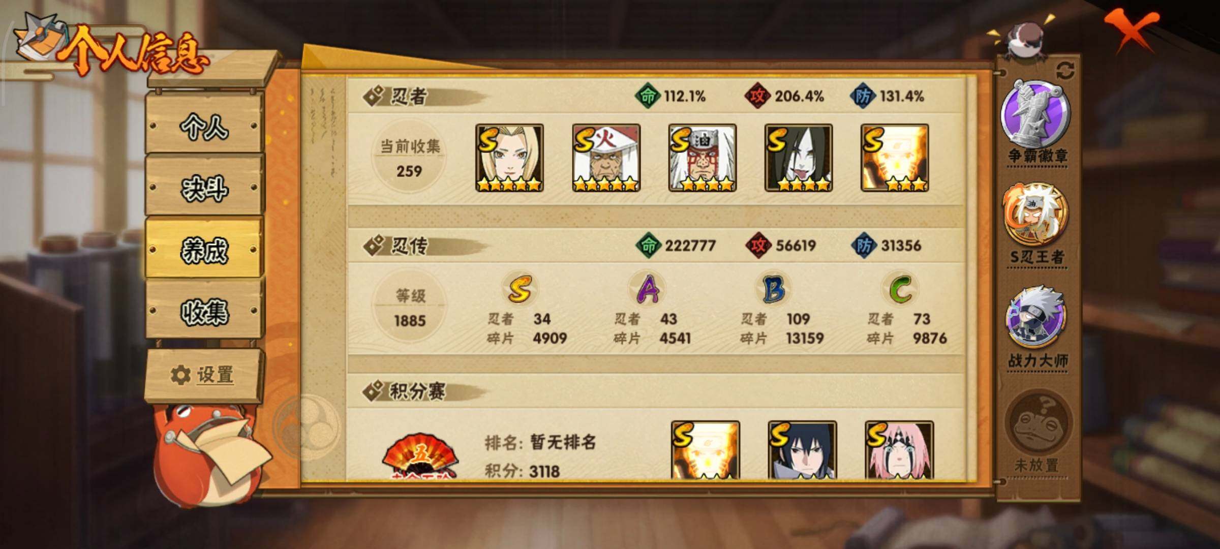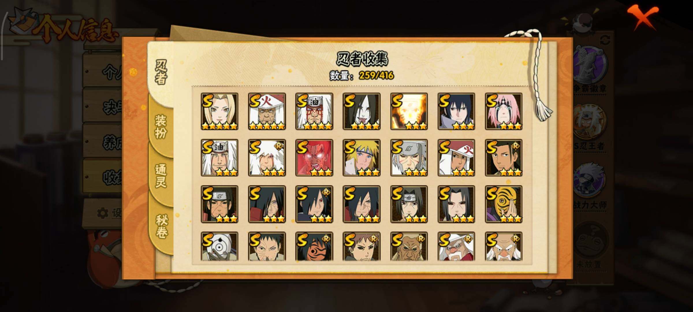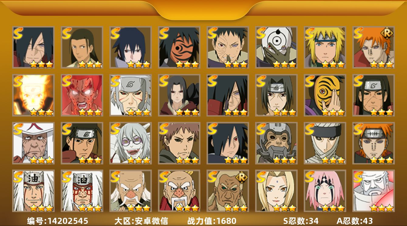 【S级忍者】:半藏「秽土转生」(3星),千手扉间「秽土转生」(3星),千手柱间「秽土转生」(3星),宇智波鼬「秽土转生」(3星),宇智波斑「秽土转生」(3星),宇智波斑「秽土转生·解」(3星),大野木「忍界大战」(3星),春野樱「忍界大战」(3星),宇智波带土「忍界大战」(3星),宇智波鼬「须佐能乎」(3星),宇智波斑「木叶创立」(3星),千手柱间「木叶创立」(3星),无「二代目土影」(3星),罗砂「四代目风影」(3星),大野木「三代目土影」(3星),艾「三代目雷影」(3星),自来也(3星),自来也「仙人模式」(4星),自来也「舞之豪杰」(3星),大蛇丸(4星),纲手(5星),千手柱间(3星),猿飞日斩(5星),波风水门(3星),药师兜「仙人模式」(3星),神秘面具男(3星),神秘面具男「红夜之刃」(3星),漩涡鸣人「九喇嘛连结」(3星),迈特凯「死门」(3星),佩恩「天道」(3星),佩恩·天道「超」(3星),宇智波佐助「永恒万花筒」(3星),宇智波斑 「白面具」(3星宇智波斑「白面具」),大筒木金式(3星)