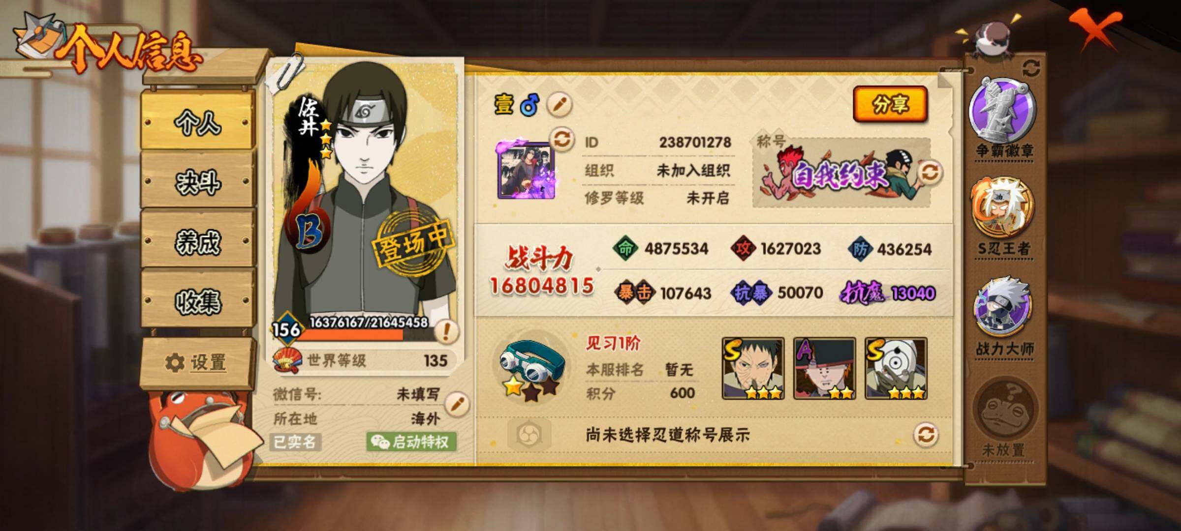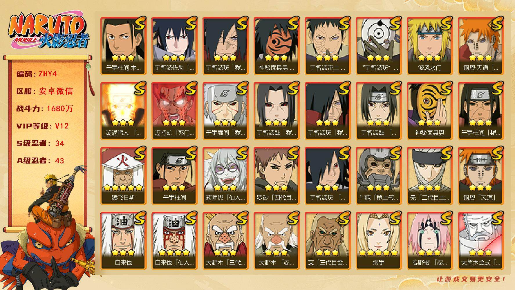 [14202545]特价急出!有二次!34S级忍者数-43A级忍者数 【S级忍者】:半藏「秽土转生」(3星),千手扉间「秽土转生」(3星),千手柱间「秽土转生」(3星),宇智波鼬「秽土转生」(3星),宇智波斑「秽土转生」(3星),宇智波斑「秽土转生·解」(3星),大野木「忍界大战」(3星),春野樱「忍界大战」(3星),宇智波带土「忍界大战」(3星),宇智波鼬「须佐能乎」(3星),宇智波斑「木叶创立」(3星),千手柱间「木叶创立」(3星),无「二代目土影」(3星),罗砂「四代目风影」(3星),大野木「三代目土影」(3星),艾「三代目雷影」(3星),自来也(3星),自来也「仙人模式」(4星),自来也「舞之豪杰」(3星),大蛇丸(4星),纲手(5星),千手柱间(3星),猿飞日斩(5星),波风水门(3星),药师兜「仙人模式」(3星),神秘面具男(3星),神秘面具男「红夜之刃」(3星),漩涡鸣人「九喇嘛连结」(3星),迈特凯「死门」(3星),佩恩「天道」(3星),佩恩·天道「超」(3星),宇智波佐助「永恒万花筒」(3星),宇智波斑 「白面具」(3星宇智波斑「白面具」),大筒木金式(3星) 【A级忍者】:艾「青年」(2星),长门「青年」(2星),波风水门「青年」(3星),达鲁伊「博人传」(2星),迪达拉(3星),迪达拉「秽土转生」(2星),大蛇丸「晓」(2星),奇拉比(2星),奇拉比「忍界大战」(2星),飞段(4星),飞段「死司凭血」(5星),干柿鬼鲛(5星),漩涡博人「桃式显现」(2星),漩涡鸣人「仙人模式」(2星),漩涡鸣人「九尾查克拉」(2星),迈特凯(5星),旗木卡卡西「万花筒写轮眼」(2星),我爱罗「疾风传」(4星),我爱罗「忍界大战」(2星),蝎(5星),小南(3星),小南「漂泊浪客」(2星),角都(2星),角都「地怨虞」(2星),猿飞阿斯玛(5星),宇智波止水(2星),宇智波鼬(2星),宇智波佐助「须佐能乎」(2星),宇智波佐助「万花筒写轮眼」(2星),药师兜「半蛇斗篷」(2星),照美冥「五代目水影」(2星),日向宁次「忍界大战」(2星),长十郎「六代目水影」(2星),佩恩·六道「漂泊浪客」(2星),猿飞木叶丸「博人传」(2星),黑土「博人传」(2星),千手扉间「漂泊武士」(2星),春野樱「百豪」(2星),秋道丁次「忍界大战」(2星),千代「近松十人卫」(2星),不风(2星),加藤
