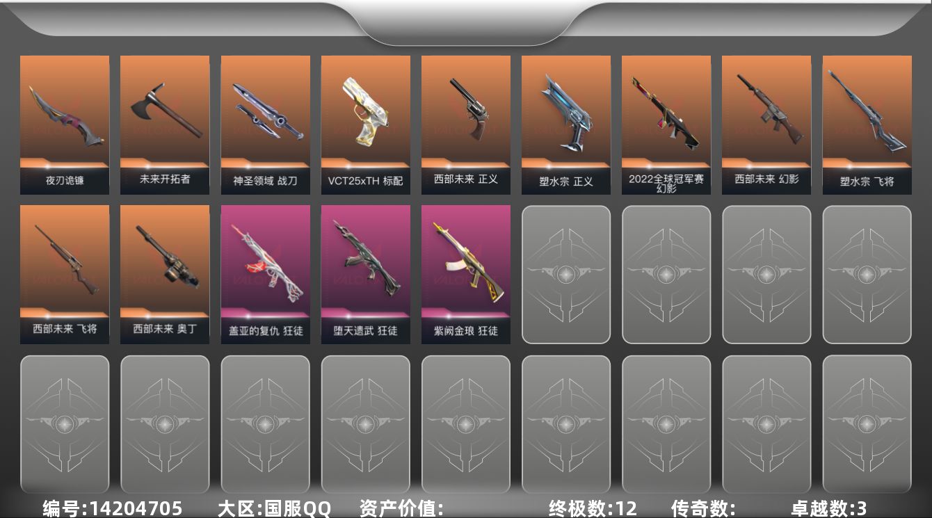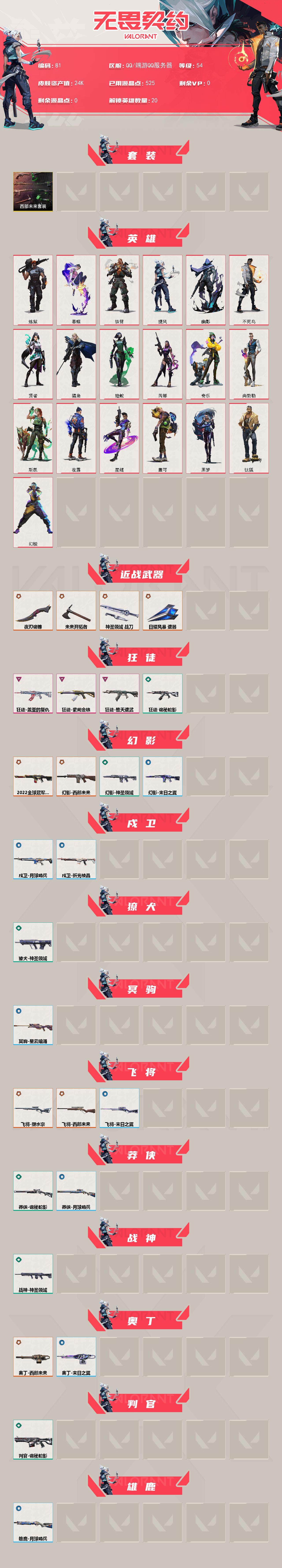 [14204705]【套装】:西部未来套装 【英雄】:幻棱,炼狱,暮蝶,钛狐,铁臂,捷风,幽影,不死鸟,贤者,猎枭,蝰蛇,芮娜,奇乐,尚勃勒,斯凯,夜露,星礈,盖可,黑梦 【近战 武器】:近战武器-未来开拓者,近战武器-夜刃诡镰,近战武器-神圣领域 战刀,近战武器-日耀风暴 遗器 【狂徒】:狂徒-堕天遗武,狂徒-盖亚的复仇,狂徒-紫阙金琅,狂徒-诡秘蛇影 【幻影】:幻影-2022全球冠军赛,幻影-西部未来,幻影-神圣领域,幻影-末日之翼,幻影-西部未来 【戍卫】:戍卫-月球哨兵,戍卫-折光棱晶 【獠犬】:獠犬-神圣领域 【冥驹】:冥驹-星云暗涌 【飞将】:飞将-塑水宗,飞将-西部未来,飞将-末日之翼 【莽侠】:莽侠-诡秘蛇影,莽侠-月球哨兵 【战神】:战神-神圣领域 【奥丁】:奥丁-西部未来,奥丁-末日之翼 【判官】:判官-诡秘蛇影 【雄鹿】:雄鹿-月球哨兵 【骇灵】:骇灵-星云暗涌 【蜂刺】:蜂刺-星云暗涌,蜂刺-折光棱晶 【标配】:标配-折光棱晶 【VCT手枪】:标配-VCT25 x TH 【正义】:正义-塑水宗,正义-西部未来,正义-月球哨兵 【鬼魅】:鬼魅-星云暗涌 【狂怒】:狂怒-神圣领域 【短炮】:短炮-末日之翼 【卡面】:精灵大战 卡面,无畏契约:暮蝶 卡面,树懒大作战 卡面,无畏契约GO!第一卷:芮娜 卡面,无畏契约GO!第一卷:零 卡面,无垠星环 卡面,《双城之战》金克丝 卡面,钢锁vs盖可 卡面,代号红色 卡面,新兵报到 卡面,V契约 卡面,无畏契约 卡面 【喷漆】:伤心心 喷漆,买装还是存钱 喷漆,放下武器 喷漆,胜利属于无畏契约 喷漆,GLHF 喷漆,无畏契约 喷漆 【挂饰】:动力机箱 挂饰,天外飞客 挂饰,无畏契约 纪念币 挂饰
