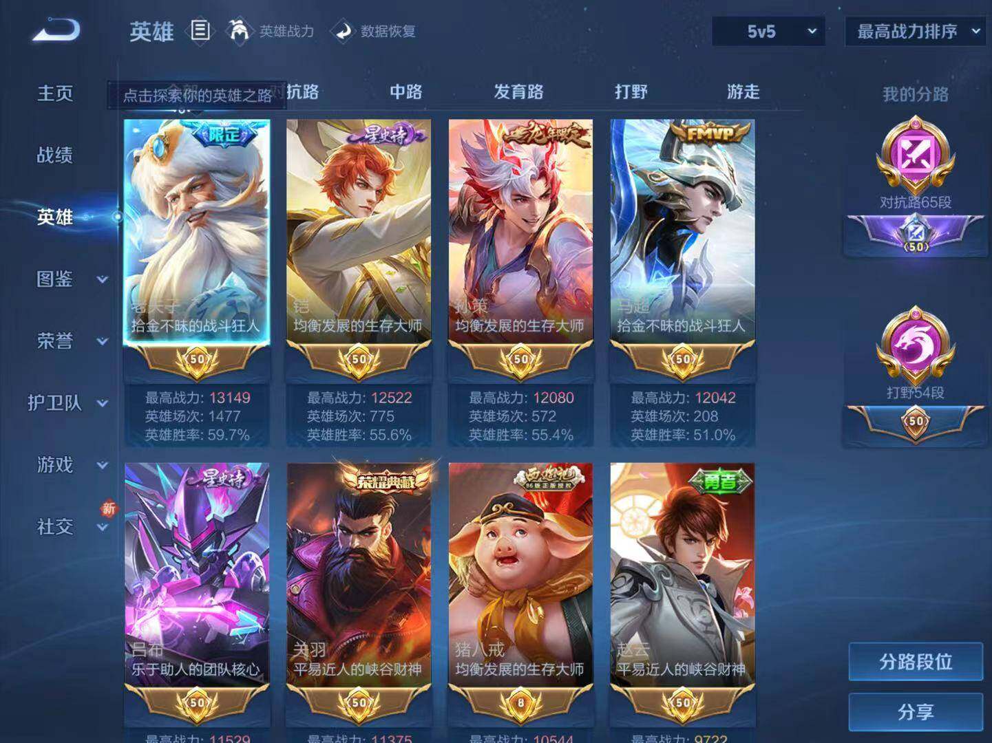 - PX_2085974-贵族等级: V5 英雄数: 117 皮肤数: 105 传说皮: 超时空战士-狄仁杰 限定皮: 武陵仙君,齐天大圣,鸣野蒿
