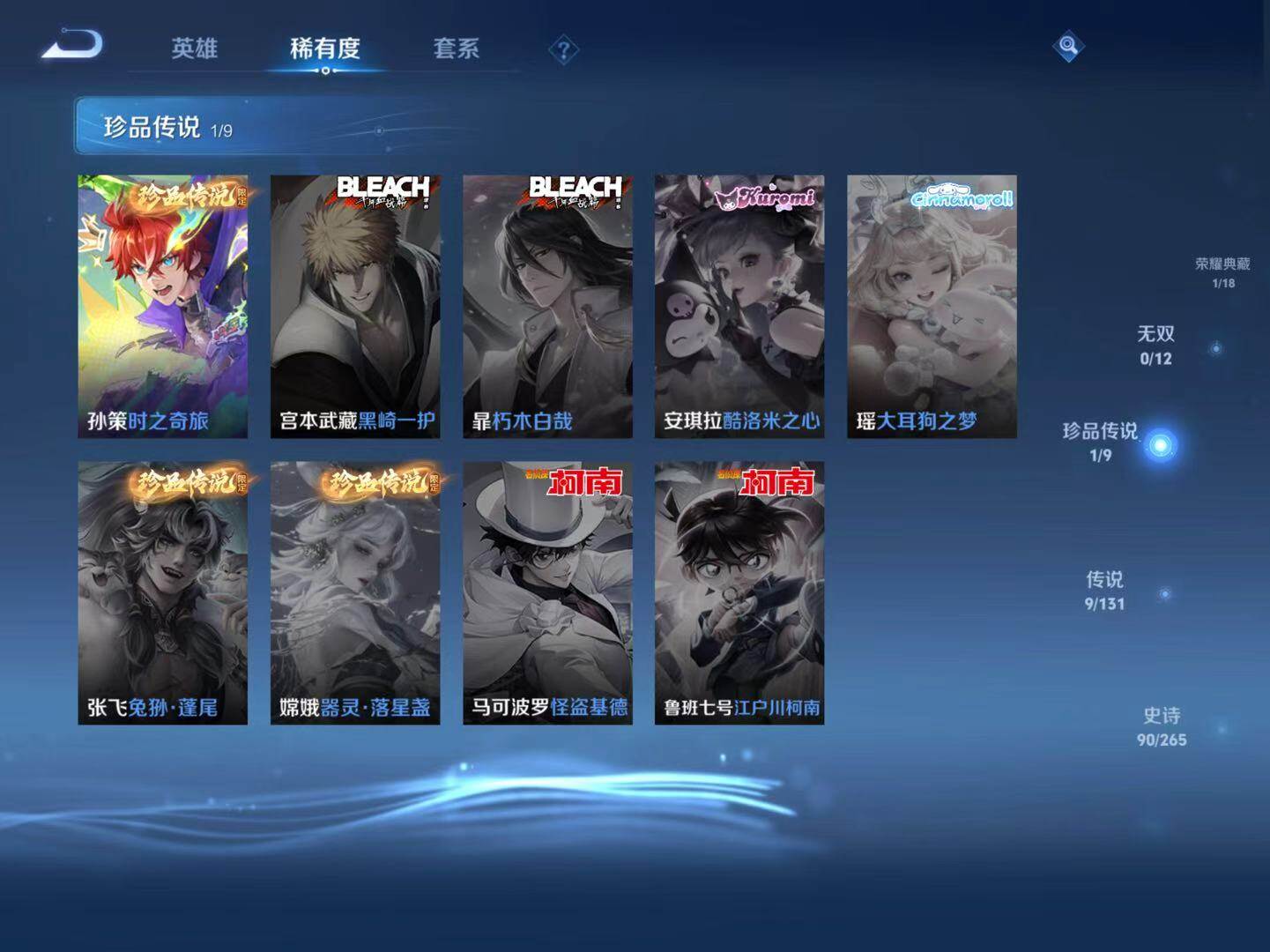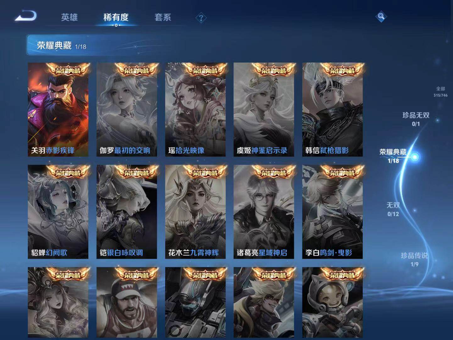 关羽冰锋战神,裴擒虎李小龙,吕布御风骁将,关羽武圣,花木兰瑞麟志,项羽霸王别姬,花木兰青春决赛季,庄周云端筑梦师,猪八戒猪悟能,夏侯惇匿光决锋者,桑启鸣野蒿,司空震愿照·山河定