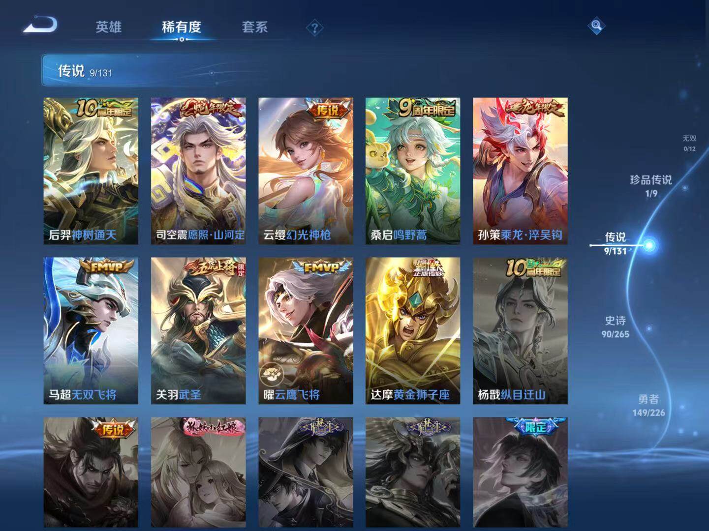 【传说皮肤】:后羿神树通天,司空震愿照山河定,云缨幻光神枪,桑启鸣野蒿,孙策乘龙淬吴钩,马超无双飞将,关羽武圣,曜云鹰飞将,达摩黄金狮子座
