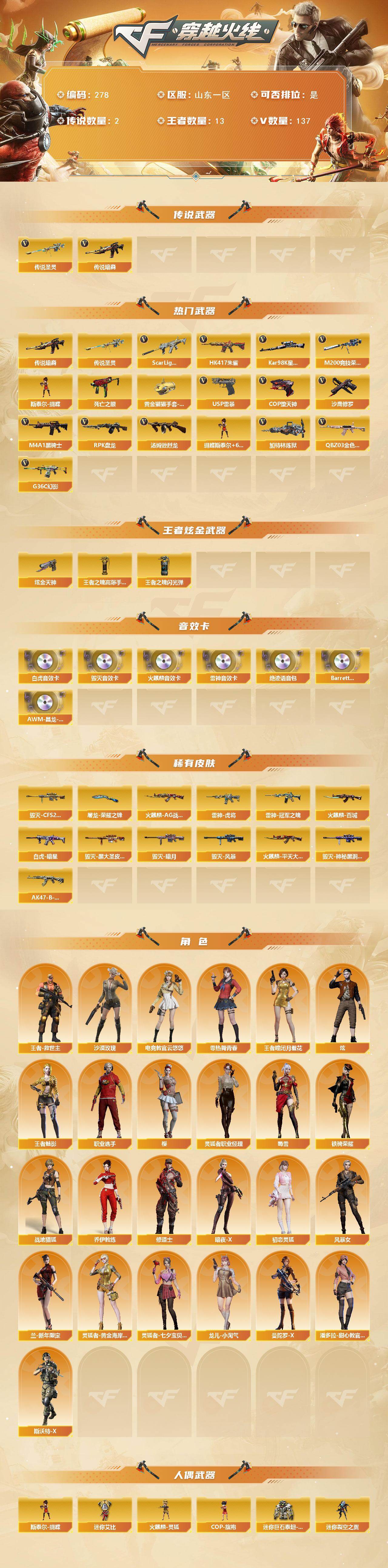 [14215892]山东一区-137V-13王者-1炫金 【传说武器】:传说暗裔,传说圣灵 【热门武器】:传说暗裔,传说圣灵,G36C-幻影,QBZ03-金色蔷薇,Scar Light-白虎,HK417-朱雀,M200-竞技荣光,死亡之眼,Kar98K-星神,M4A1-黑骑士*6,汤姆逊-烈龙*7,RPK-盘龙*6,加特林-炼狱,斯泰尔-蝴蝶,USP-雷暴,COP-堕天神,沙鹰-修罗*3,黄金猫猫手套-白鲨 【王者炫金武器】:炫金天神,王者之魄高爆手雷,王者之魄闪光弹 【音效卡】:AK47-火麒麟音效卡,M4A1-雷神音效卡,Barrett-毁灭音效卡,Scar Light-白虎音效卡,绝迹语音包,Barrett-碧霄极光音效卡,AWM-昌龙-怀旧音效卡 【皮肤】:Scar Light-白虎-暗星,雷神-虎将,雷神-冠军之魄,火麒麟-AG战队皮肤,火麒麟-平天大圣,火麒麟-百城,毁灭-暗月,毁灭-CFS2020,毁灭-黑大圣皮肤,毁灭-风暴*2,毁灭-神秘黑洞皮肤,AK47-B-常胜将军-刘备,屠龙-荣耀之锋 【角色】:樱,炫,沙漠玫瑰,电竞教官-云悠悠,战地猎狐,王者-瞳-闭月羞花,王者-魅影,王者-救世主,乔伊教练,修道士,暗夜-X,初恋灵狐,风暴女,兰-新年限定,零-热舞青春,灵狐者-黄金海岸,灵狐者-七夕宝贝,灵狐者-职业经理,龙儿-小淘气,曼陀罗-X,潘多拉-甜心教官,斯沃特-X,蜀雪,铁骑荣耀,职业选手 【人偶武器】:火麒麟-灵狐,迷你钢铁终结者,斯泰尔-蝴蝶,COP-旗袍,迷你裂空之翼*3,迷你波特博士*13,迷你牛牛,迷你生化手雷*2,闪光弹-貂蝉,高爆手雷-大乔,迷你艾比,迷你巨石泰坦-魔花研究所 【暴走生化】:黑龙吞噬者,死亡之眼,超级对讲机 【挑战大师】:致命乱世-超越Max,神圣爆裂者III,冰龙粉碎者-白马银枪,VEPR-12-金魔,激光毁灭者III*4,机甲撕裂者III,试炼破坏者III,KAC-圣炎切割者III*2,阐释者III 【英雄级武器】:AK47-火麒麟,M4A1-雷神,M4A1-黑骑士*6,AK47-无影,AN94-超新星*2,HK417-朱雀,Scar Light-白虎,G36C-幻影,QBZ03-金色蔷薇,王者之心-觉醒版,黑骑士-海王,AK47-B-常胜将军,AWM-天龙,Barrett-毁灭,AWM-裁决,Barrett-朱雀,Kar9